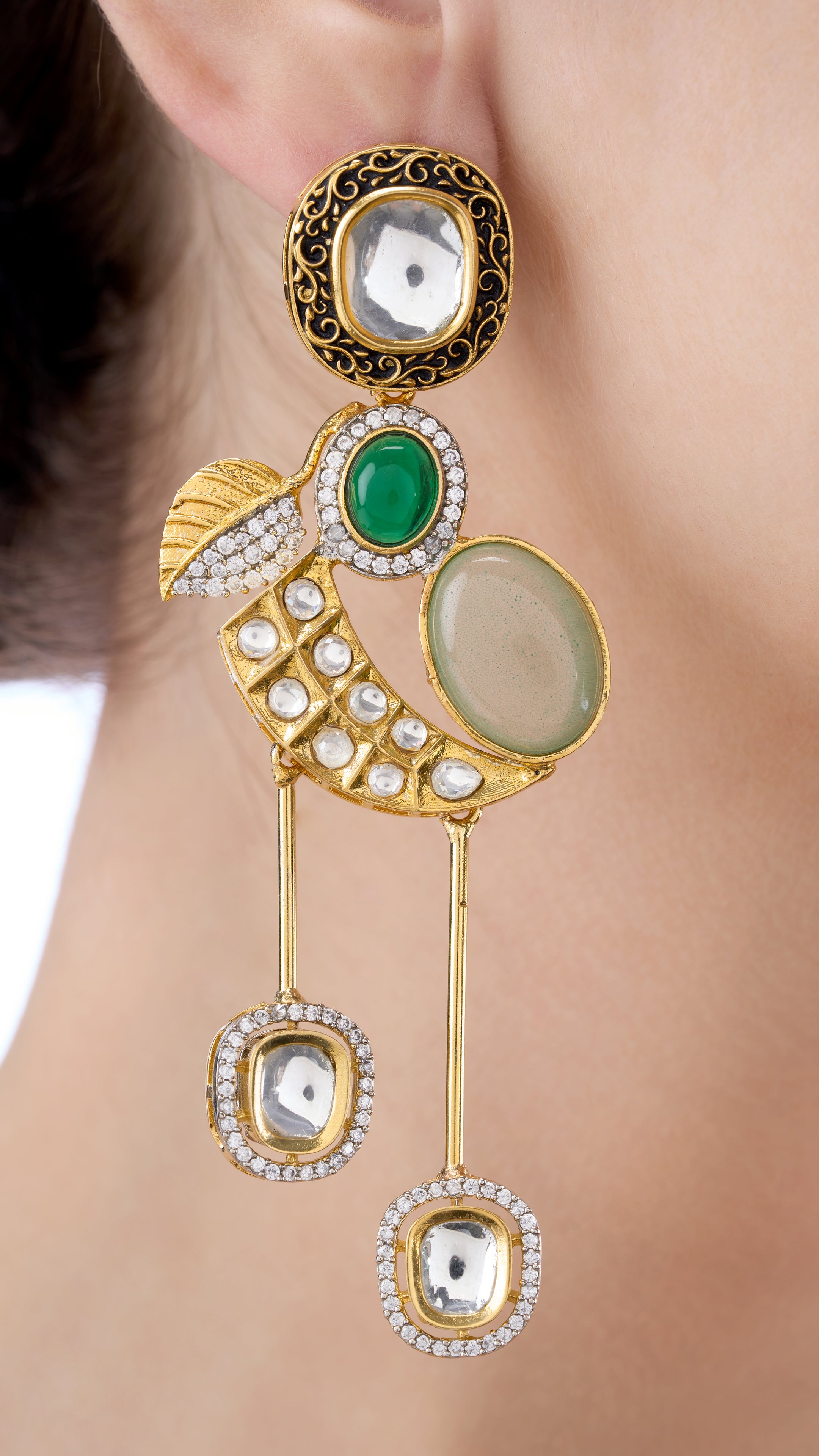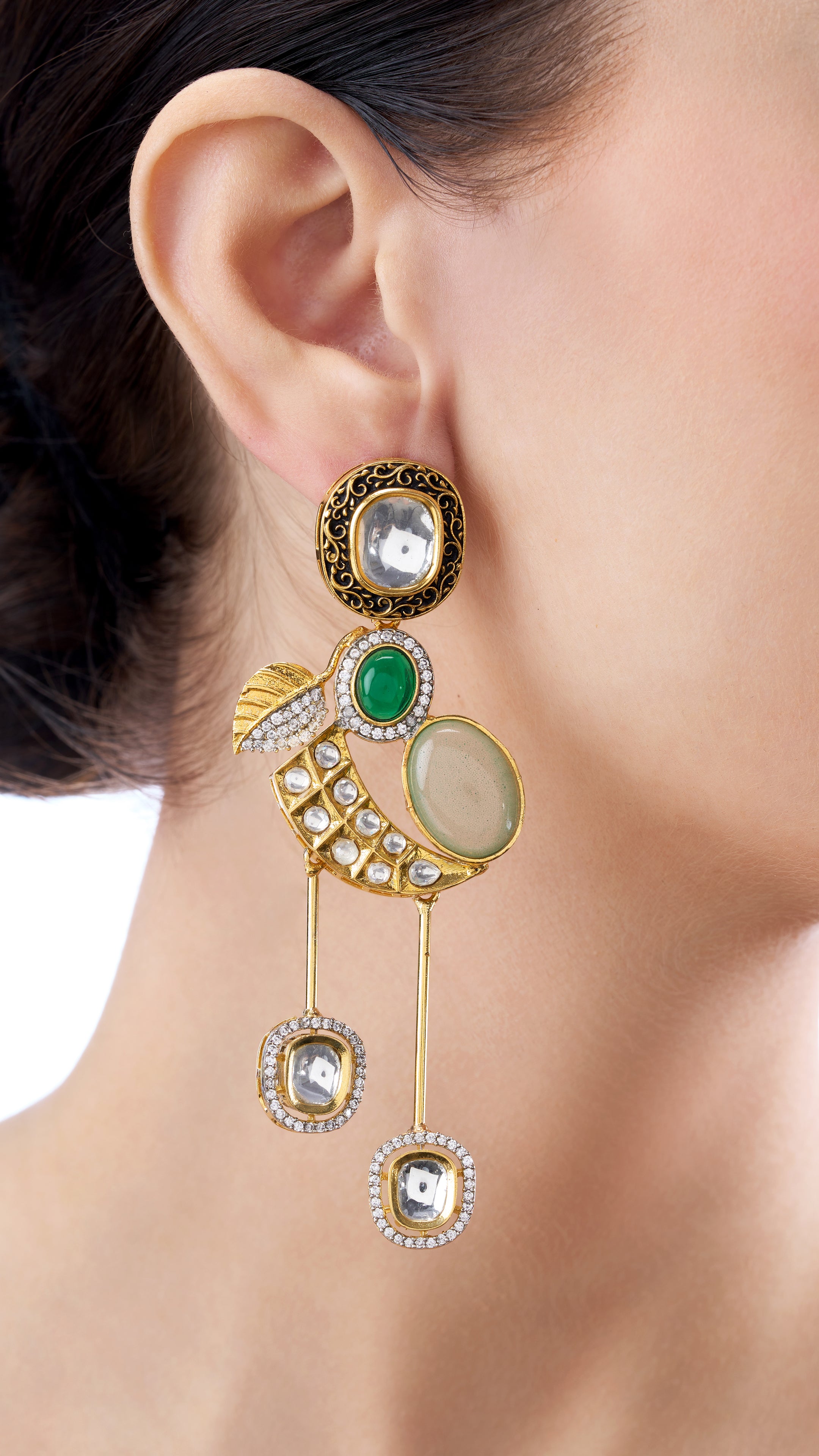 Abstract leaf earrings with a double drop feature vibrant green semi-precious stones, creating a bold and artistic design. A unique and elegant accessory that adds a fresh, nature-inspired touch to any look.