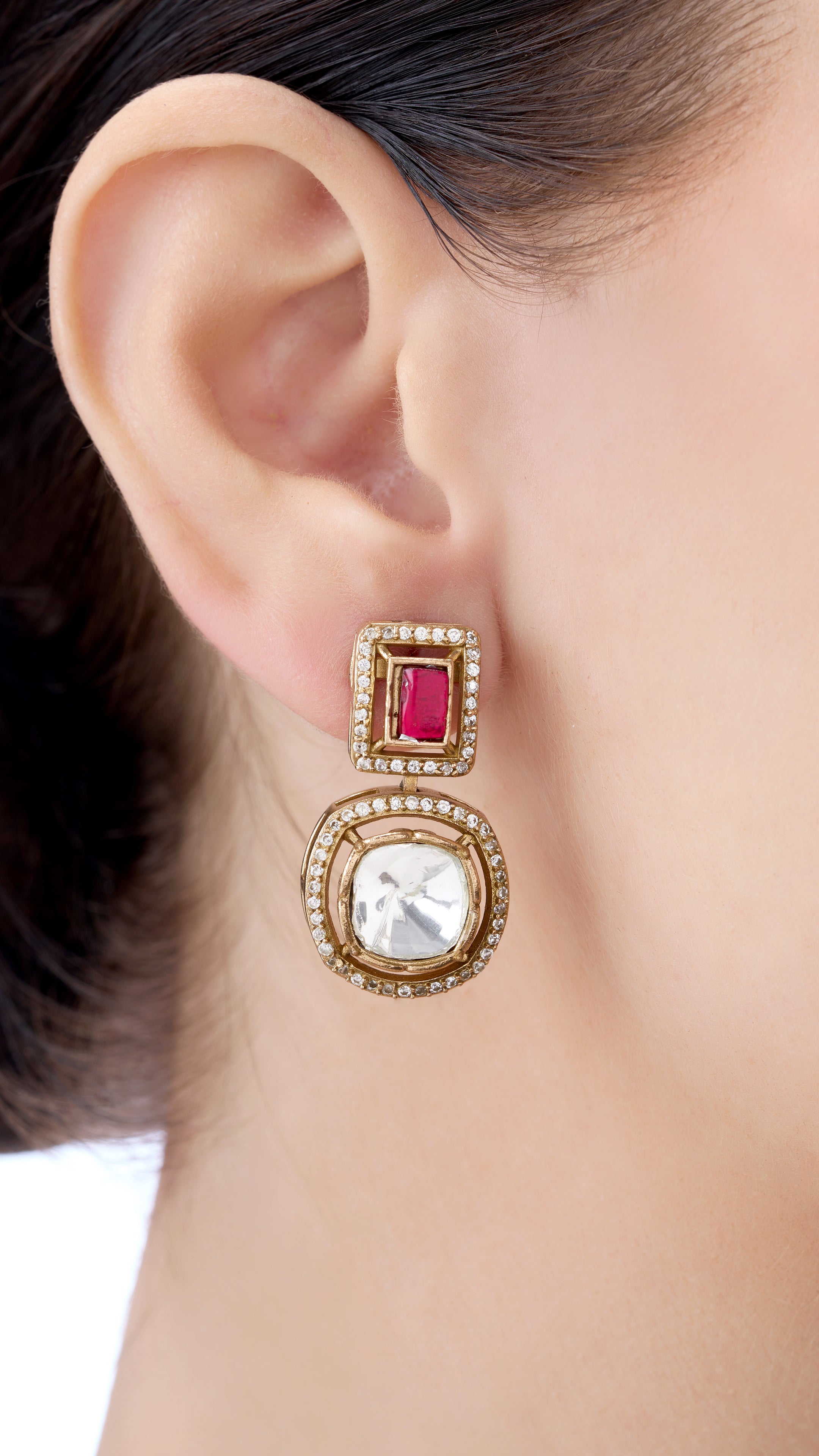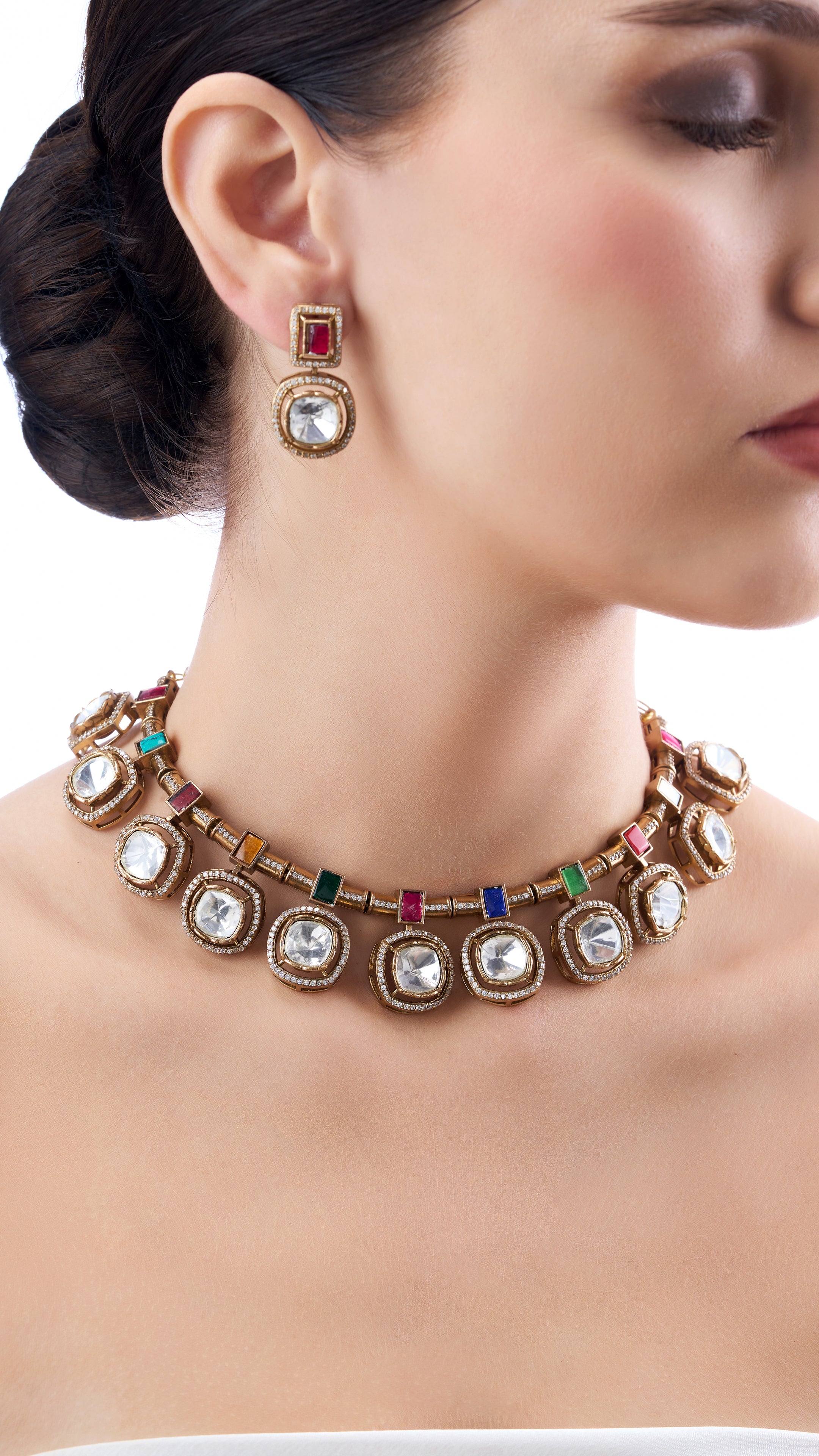 Antique gold Polki necklace set combines intricate enamel detailing with multi-color stones, creating a stunning, traditional design. Perfect for adding a touch of elegance and vibrant charm to any outfit.