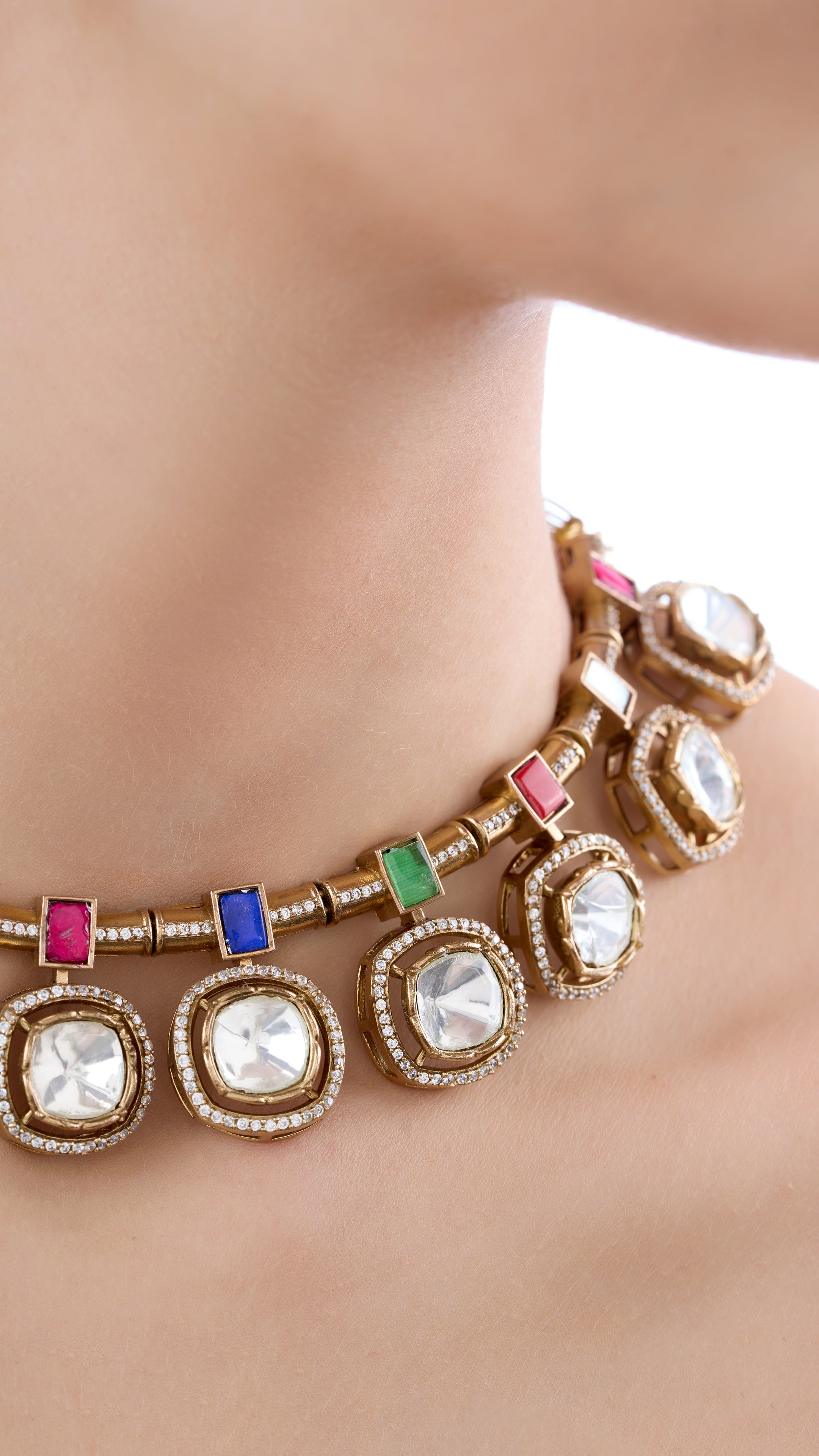 Aarohi antique gold polki with enamel necklace set with multi colour stones