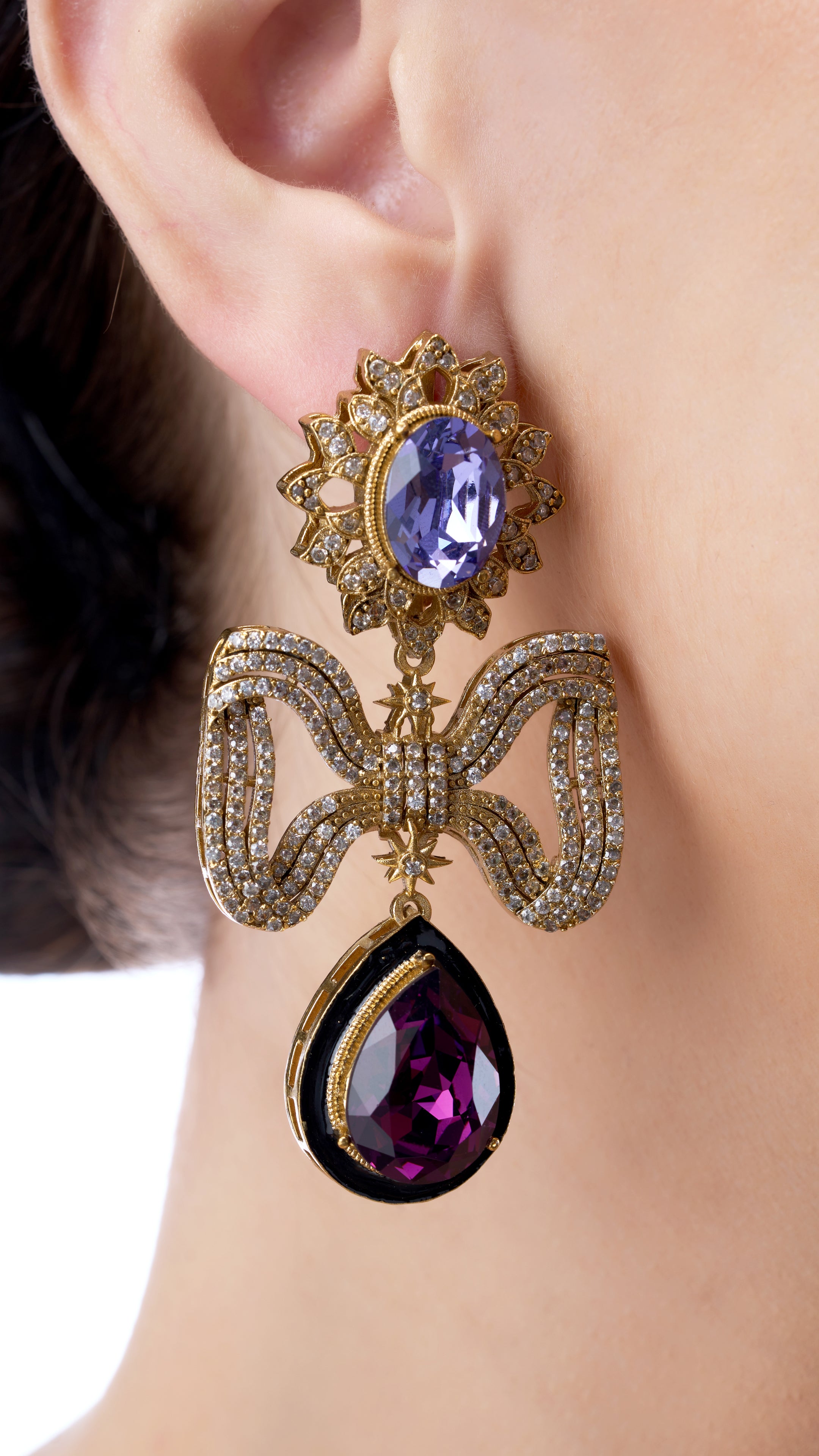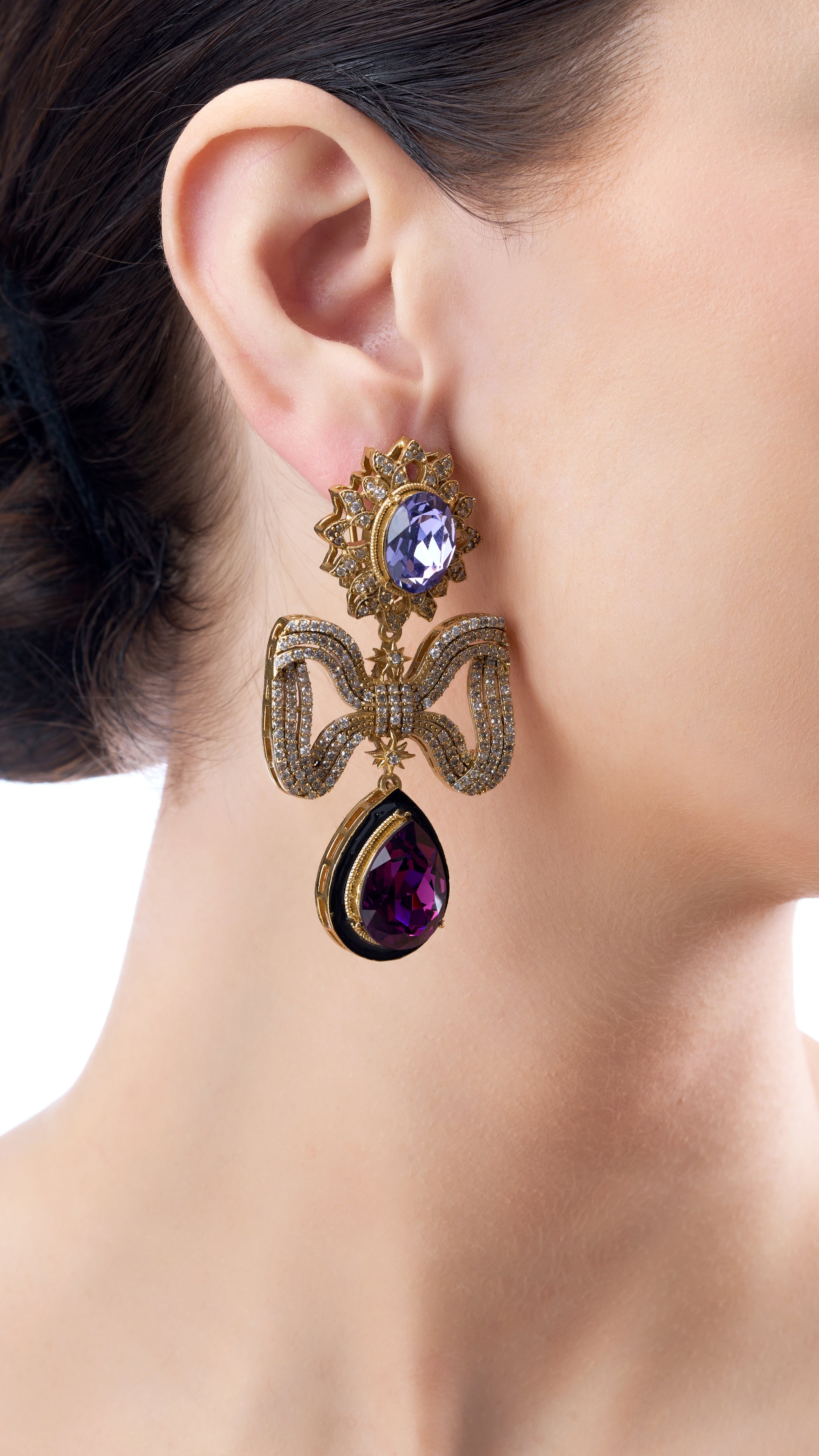 Bow-shaped earrings, adorned with semi-precious stones and Mossanites in purple, offer a charming blend of sparkle and color.