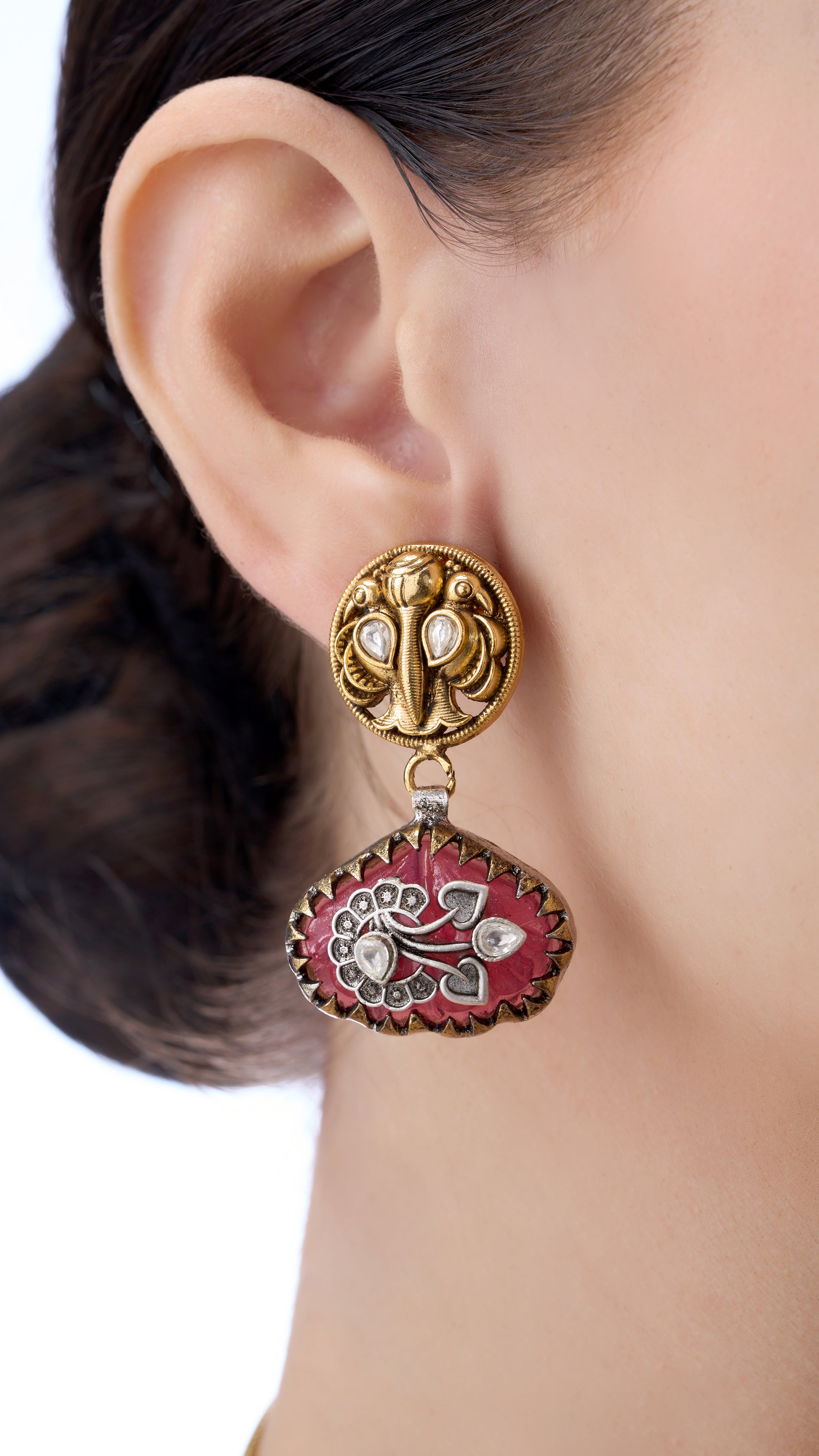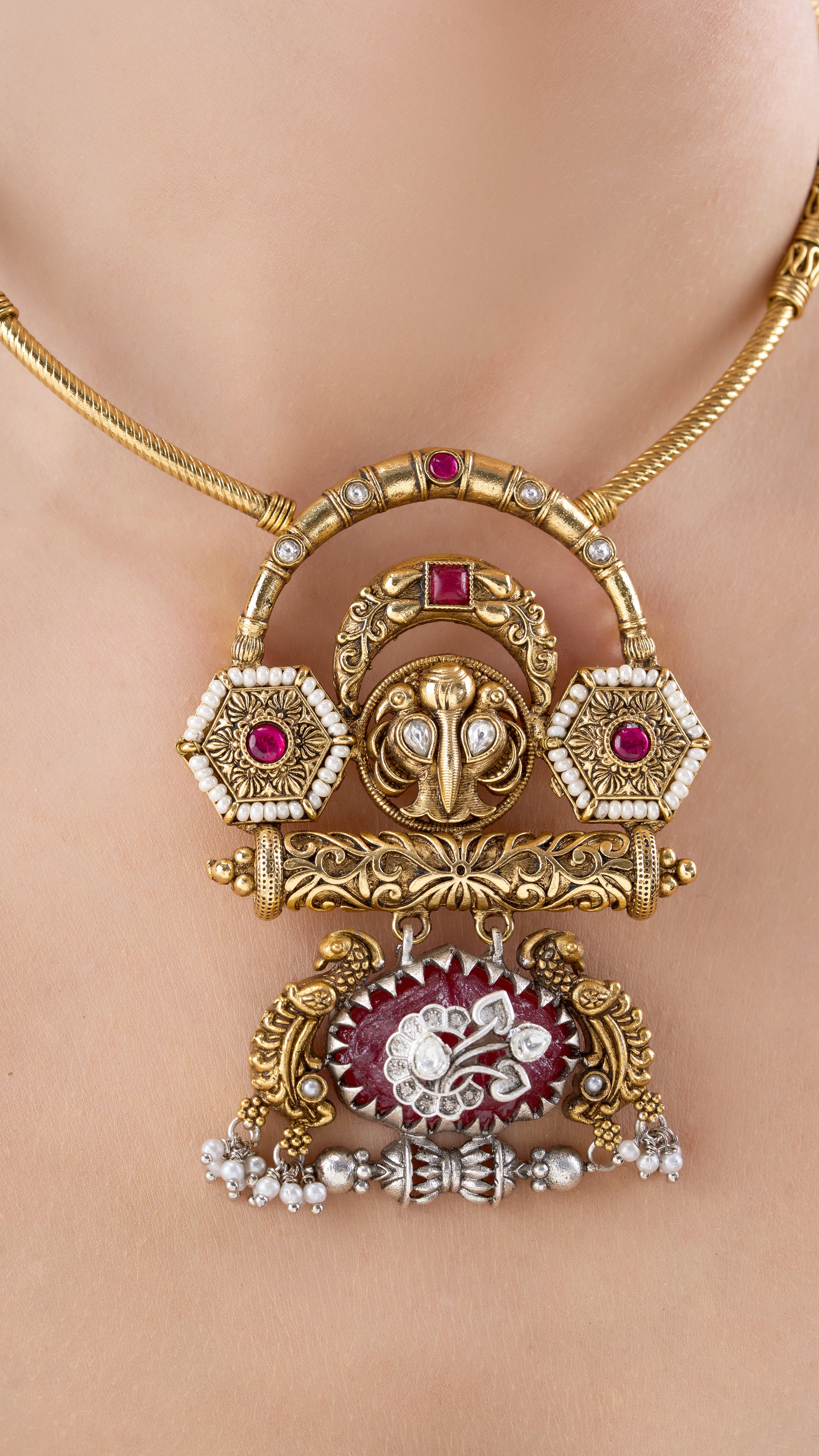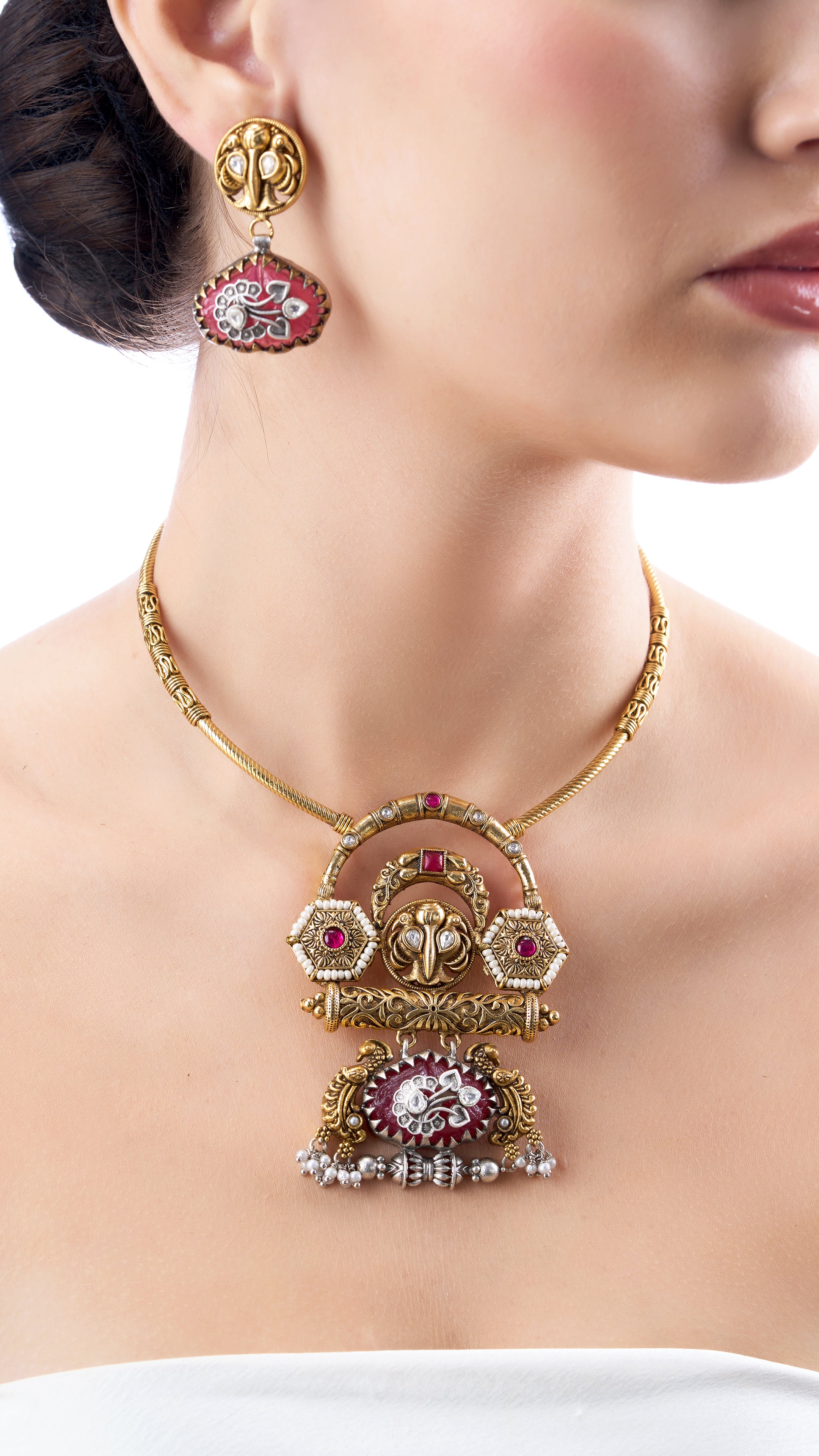 Filigree Hasli two-tone necklace set in red features intricate craftsmanship and a striking design, blending traditional elegance with bold color for a perfect statement piece at any occasion.
