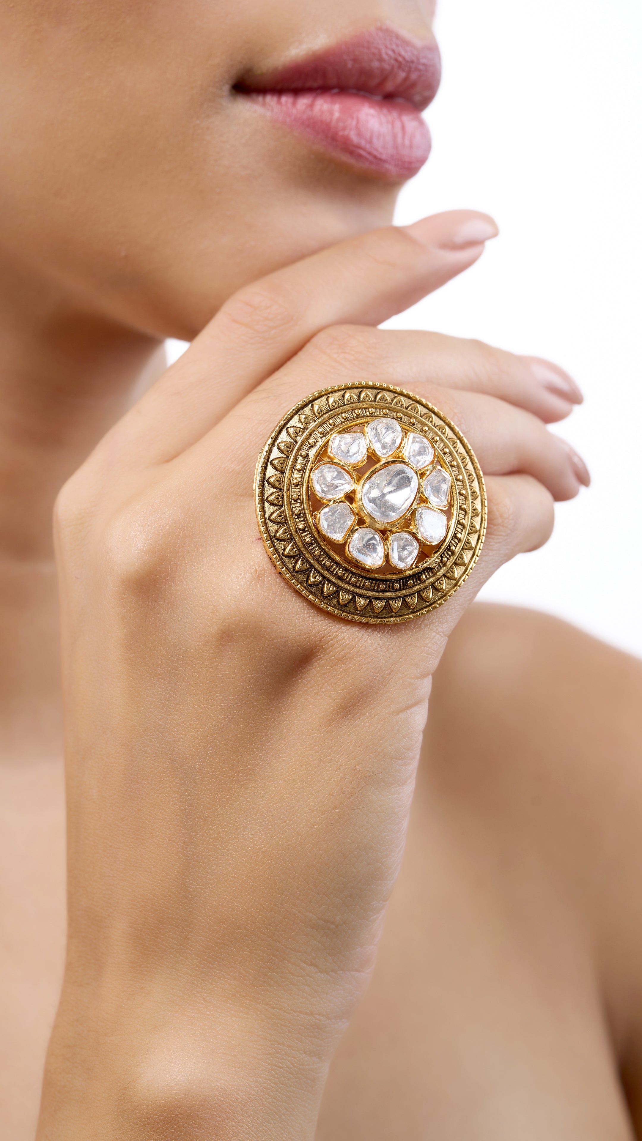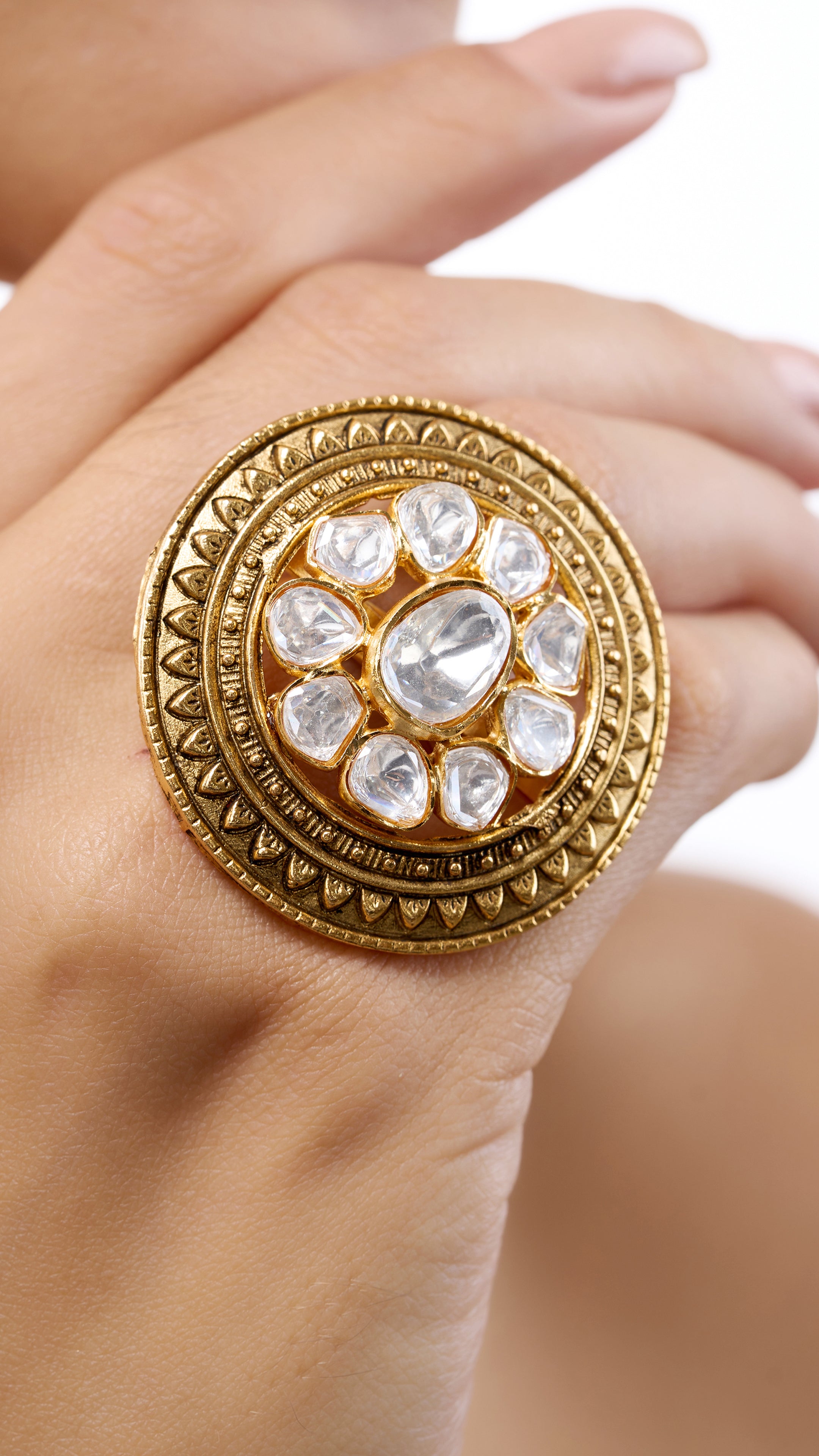The Adjustable Kundan Ring featuring detailed filigree craftsmanship. This ring showcases radiant Kundan stones set against intricate filigree work, offering a blend of elegance and charm.
