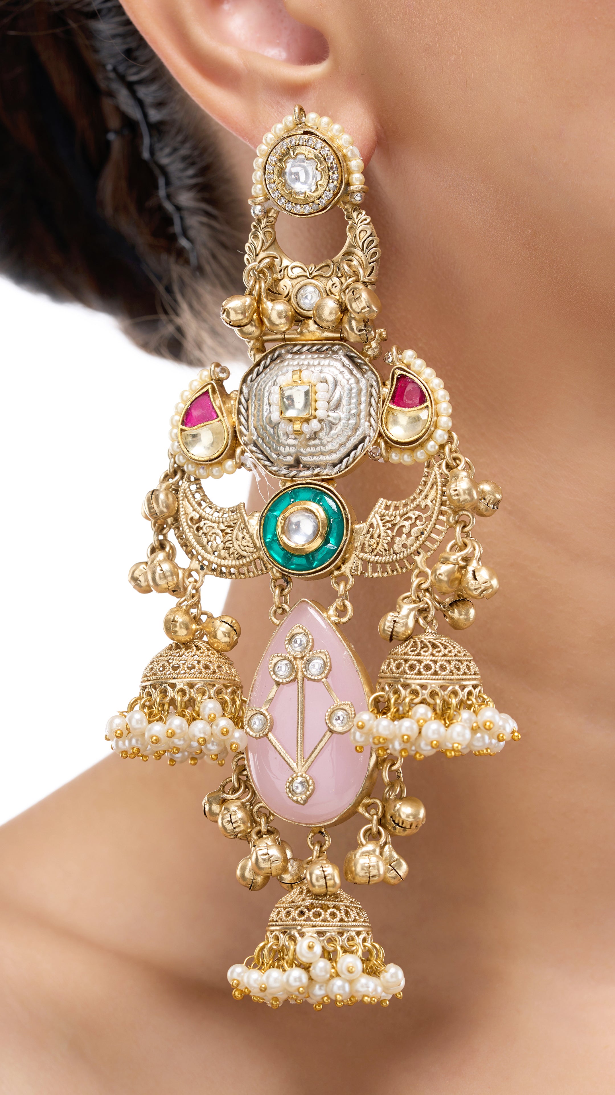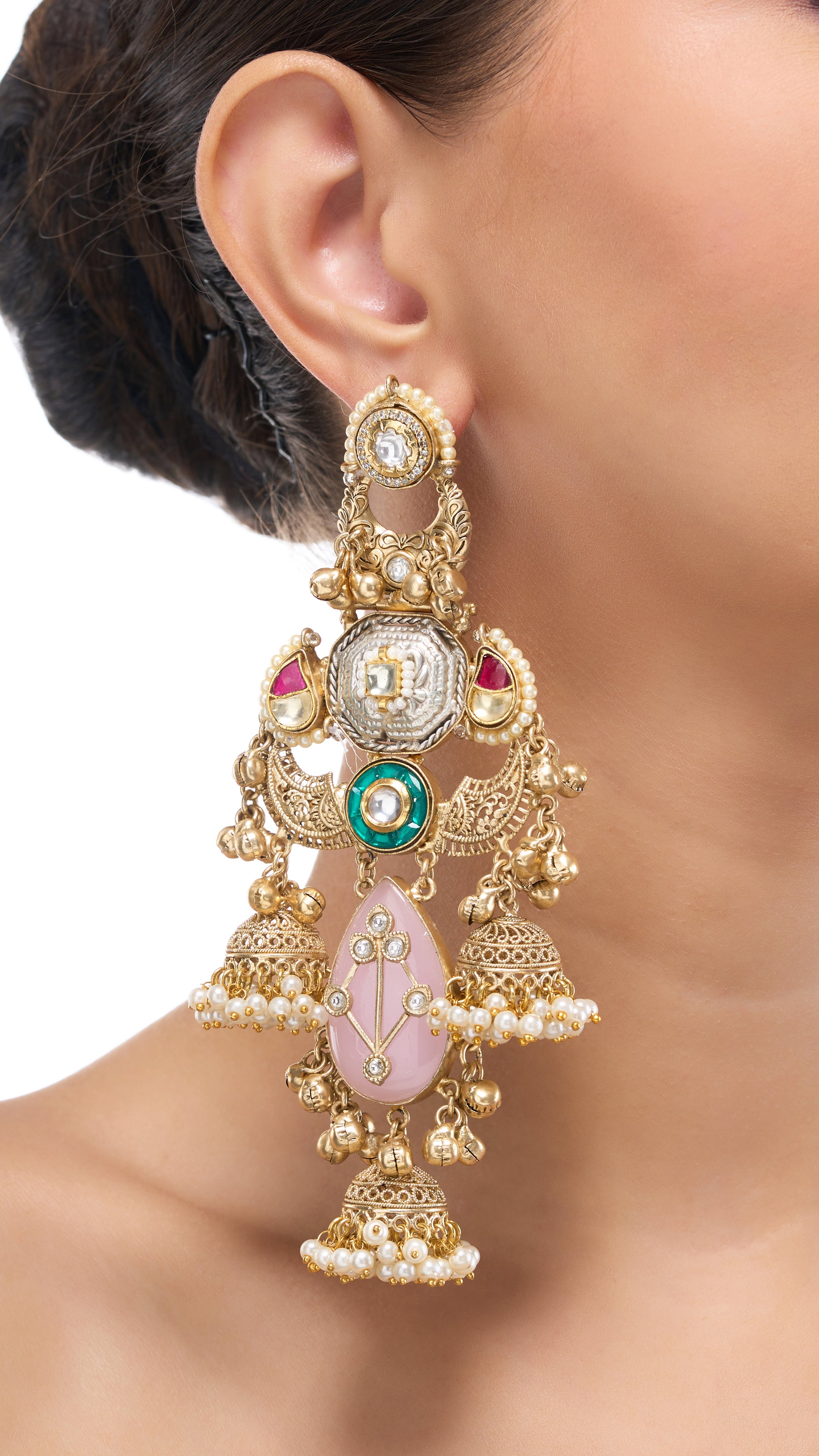 Elegant gold foil long earrings adorned with semi-precious quartz stones, offering a refined and glamorous touch to any outfit.