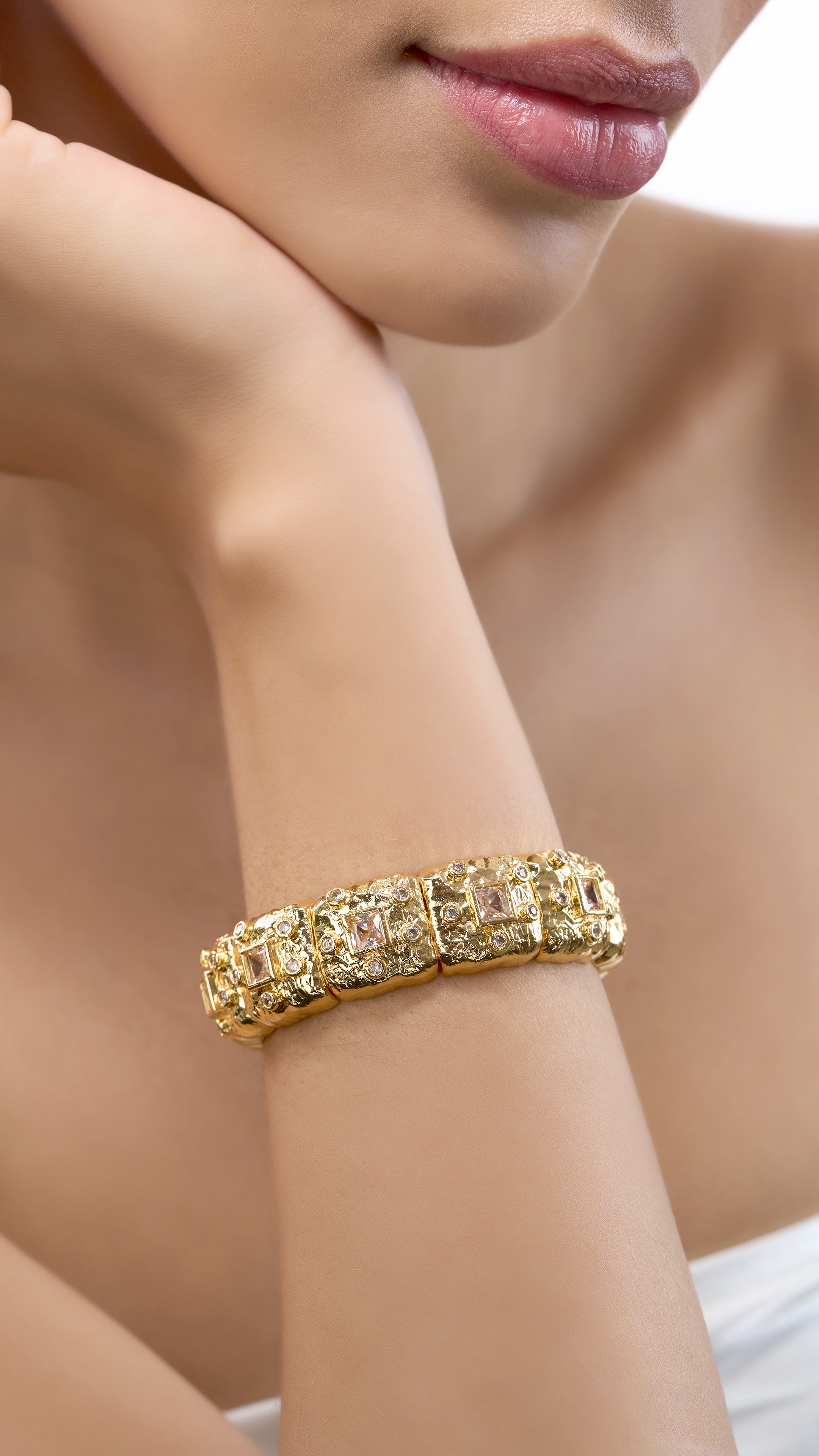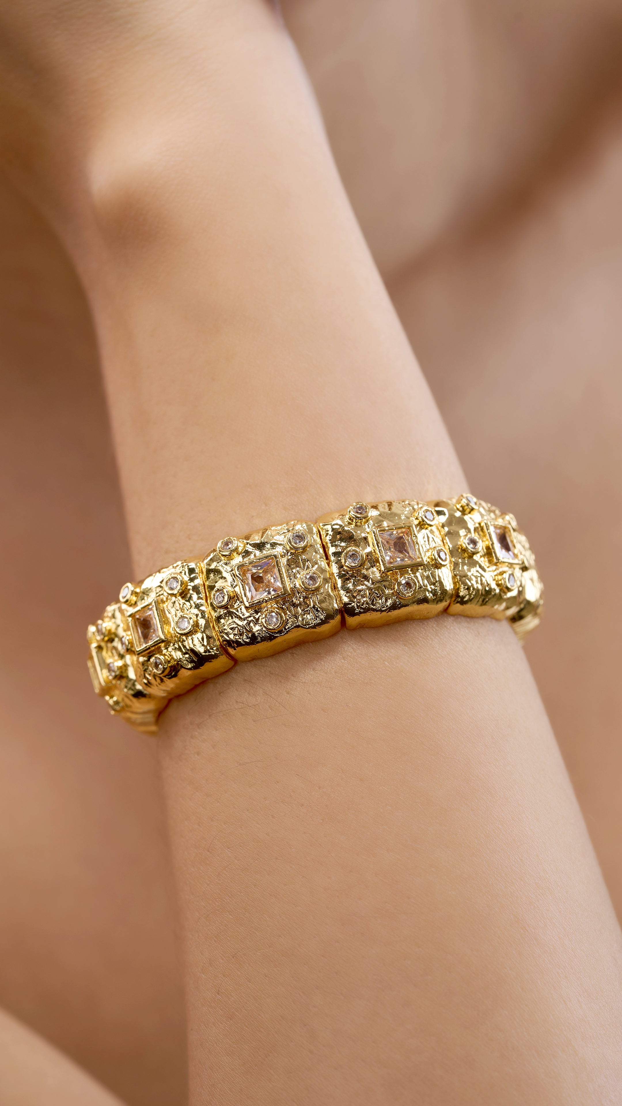 Stacking Gold Plated Bracelet with Semi-Precious Stones—a stylish and versatile accessory that adds a touch of elegance to any ensemble. This bracelet features a series of finely crafted gold-plated bands, each adorned with shimmering semi-precious stones. The stacking design allows for a customizable look, perfect for mixing and matching with other bracelets or wearing alone for a sophisticated statement. Ideal for both everyday wear and special occasions, this bracelet blends modern style with timeless charm.