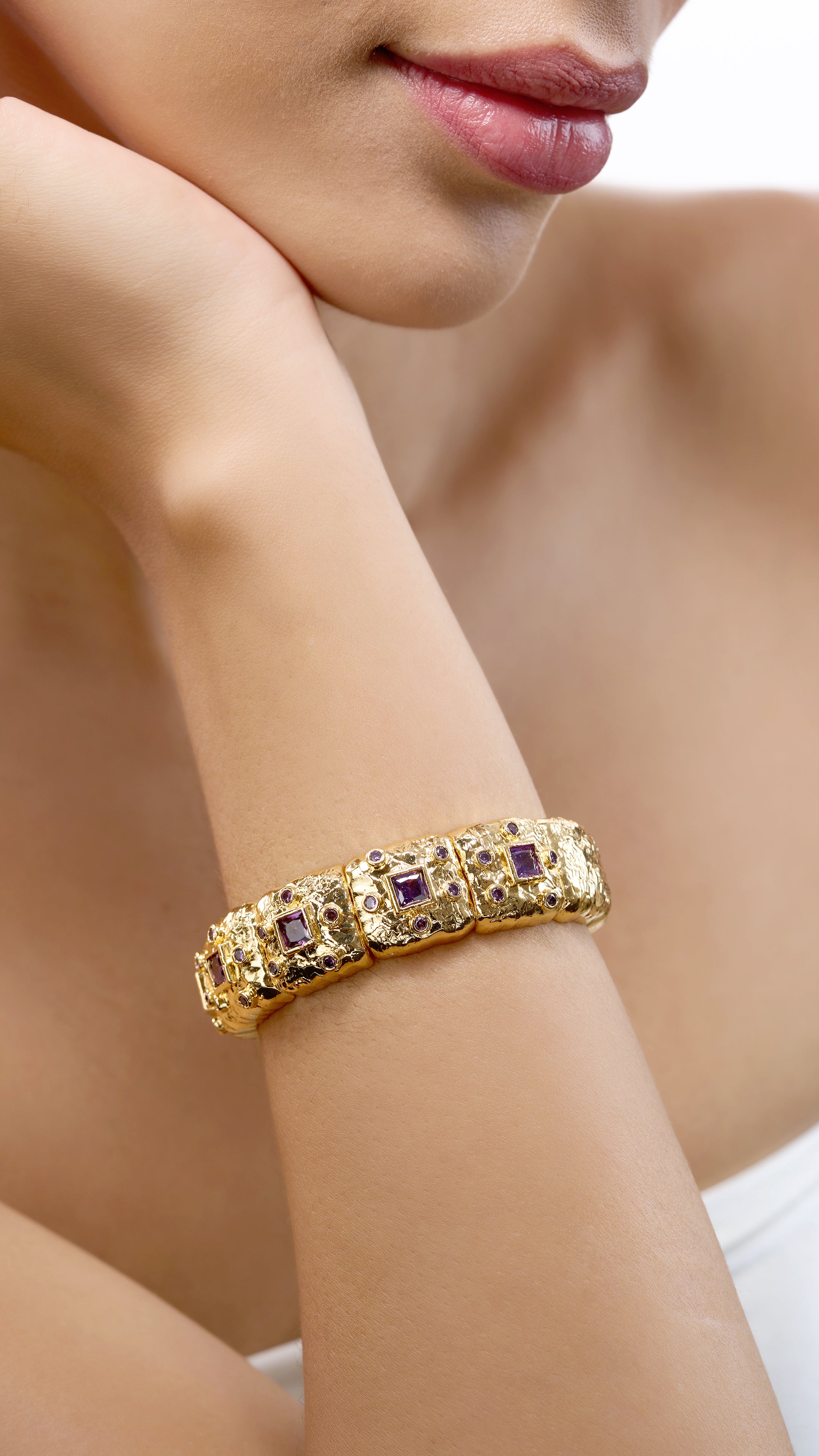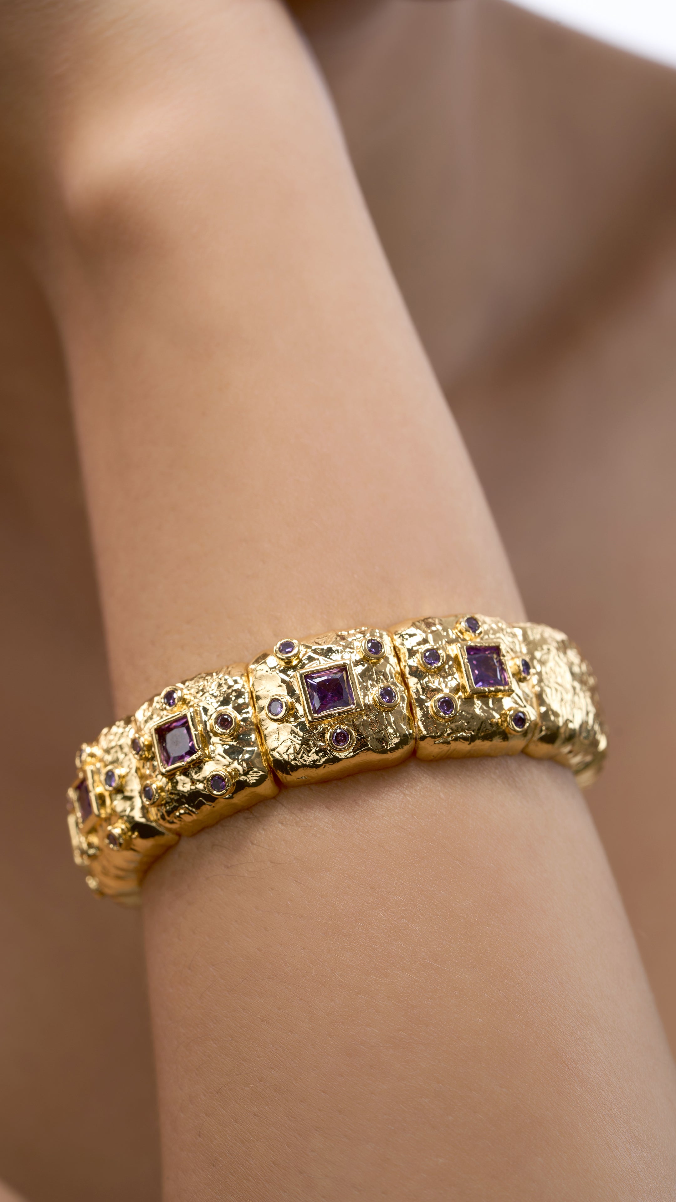 Stacking Gold Plated Bracelet with Semi-Precious Stones—a stylish and versatile accessory that adds a touch of elegance to any ensemble. This bracelet features a series of finely crafted gold-plated bands, each adorned with shimmering semi-precious stones. The stacking design allows for a customizable look, perfect for mixing and matching with other bracelets or wearing alone for a sophisticated statement. Ideal for both everyday wear and special occasions, this bracelet blends modern style with timeless charm.