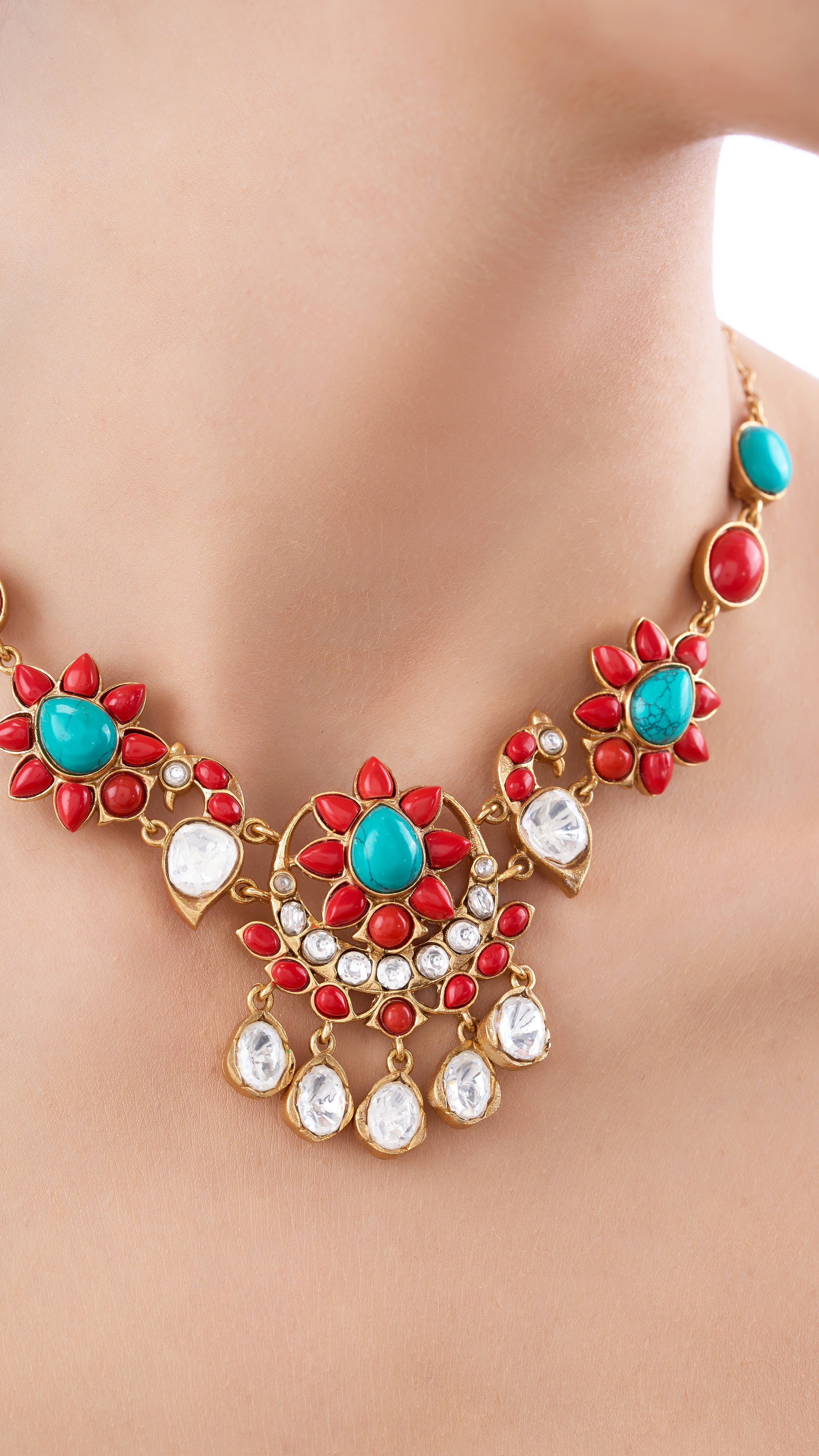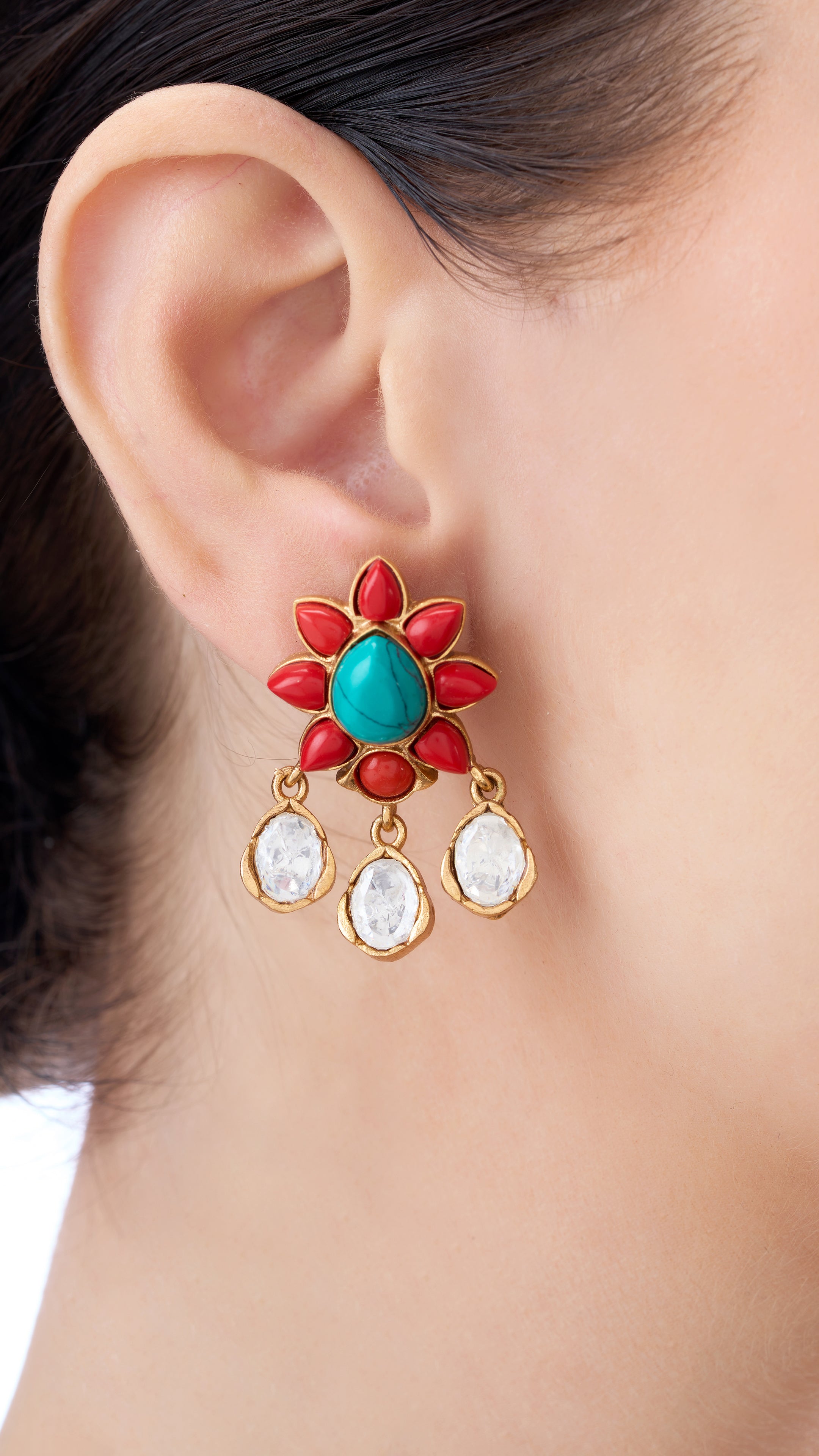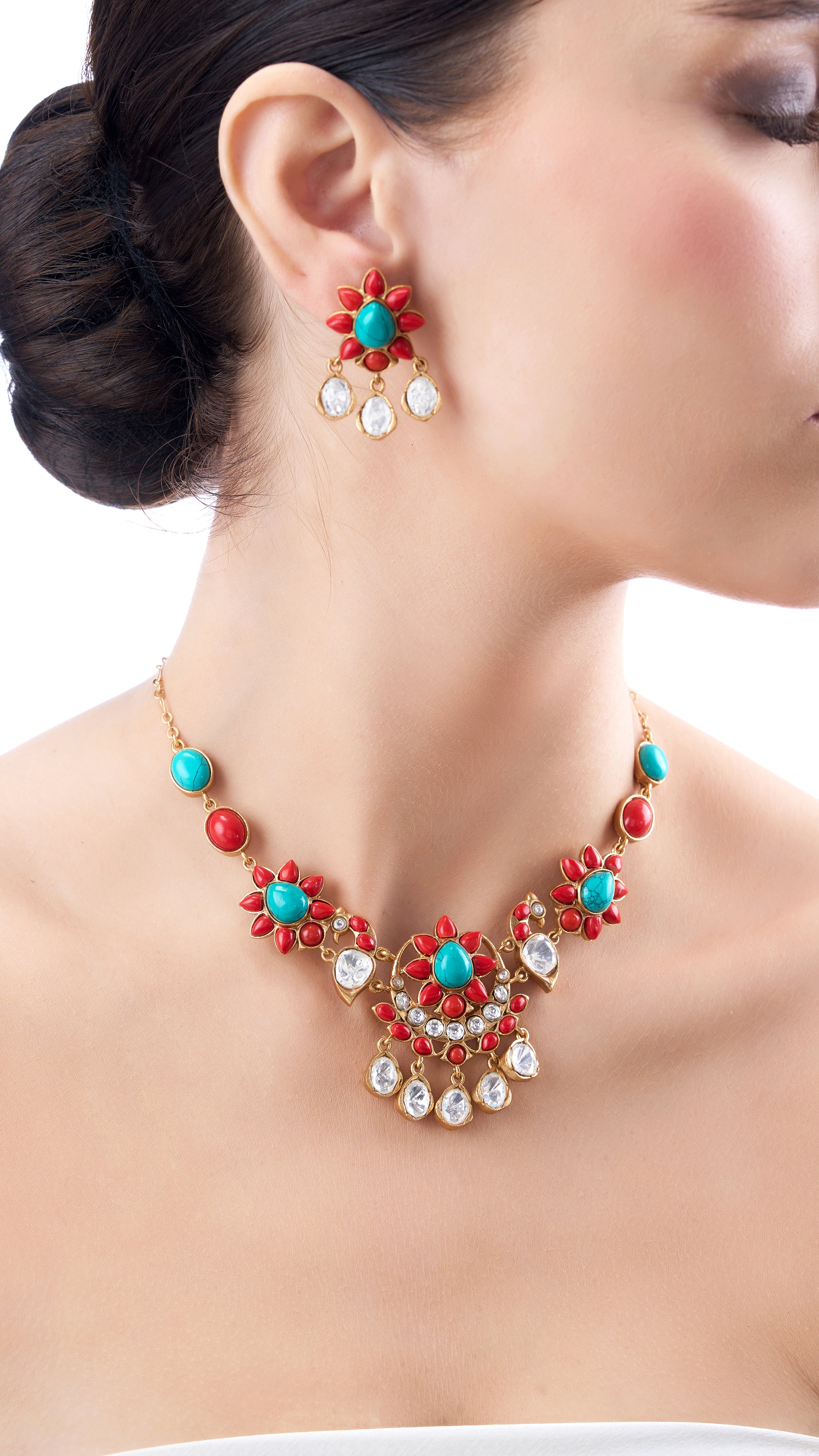 Avni polki chandbali set with semiprecious stones in turquoise and coral