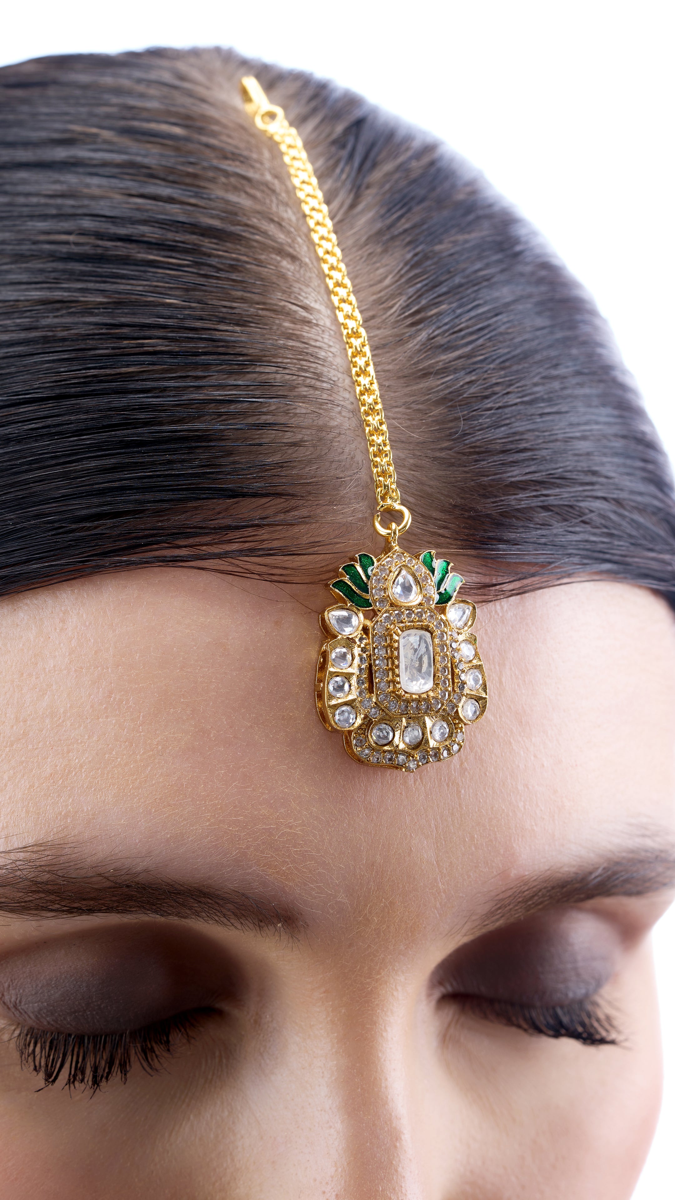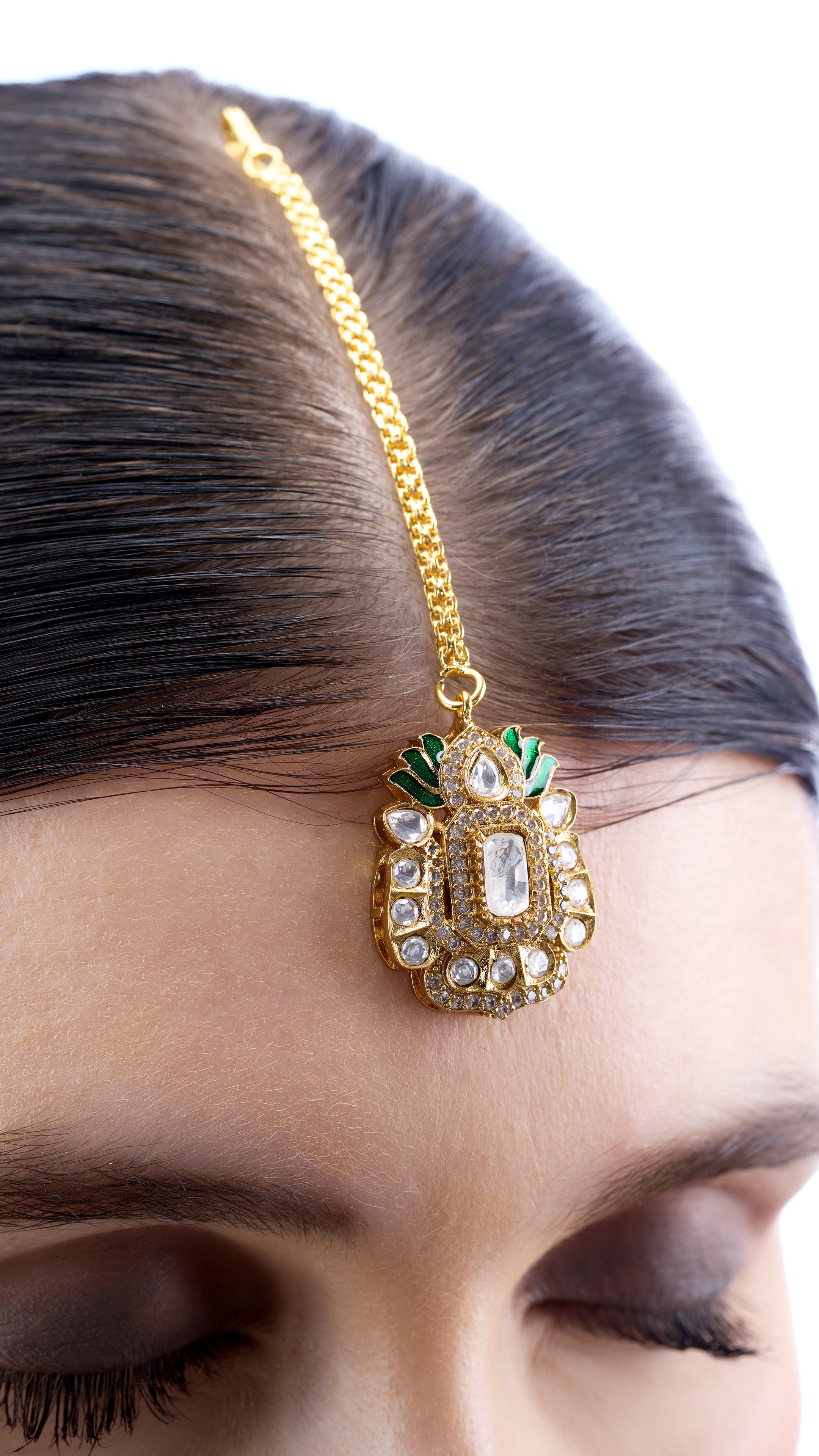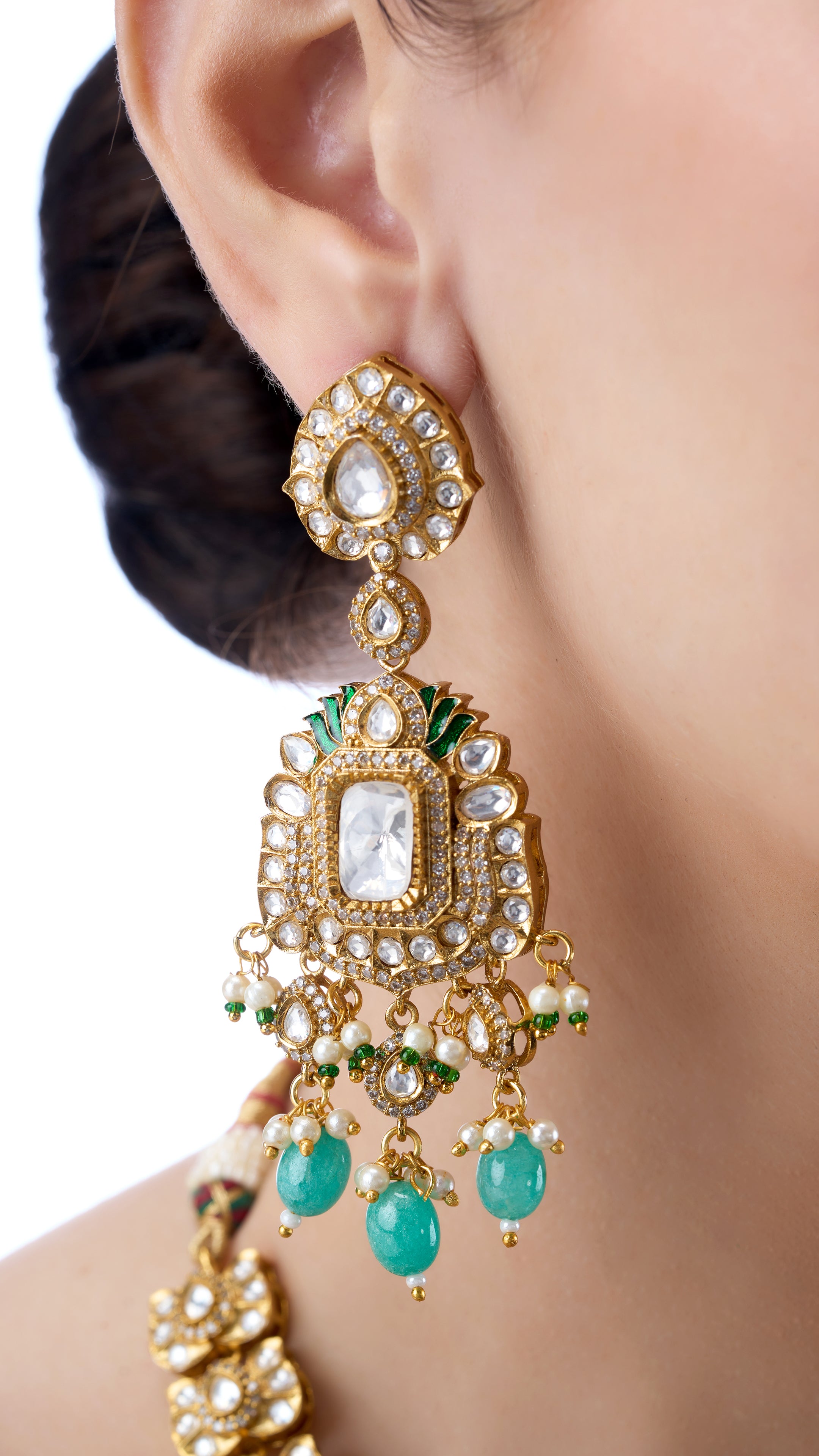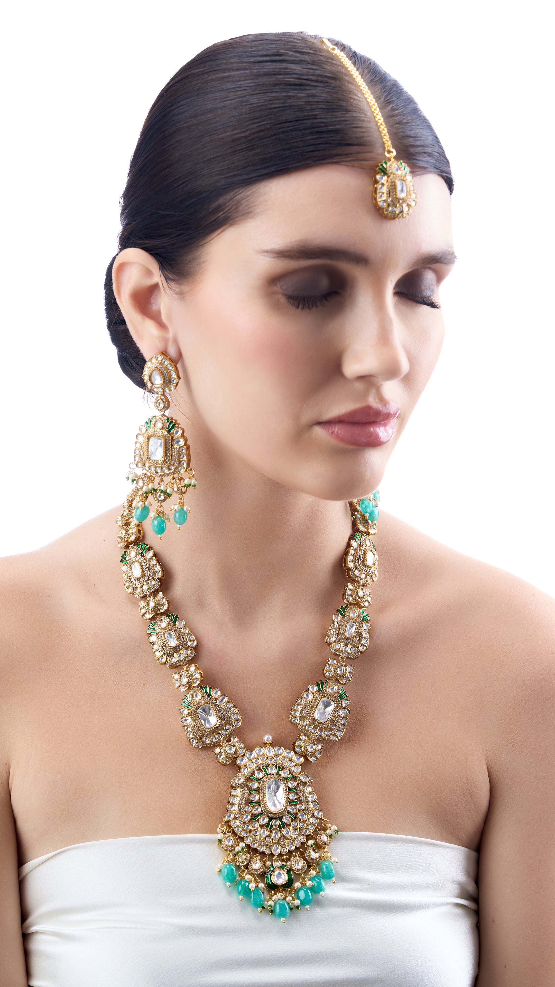 Long Polki necklace set, adorned with aqua semi-precious stones, blends classic design with a refreshing splash of color. Its graceful elegance makes it the perfect statement piece for any occasion.