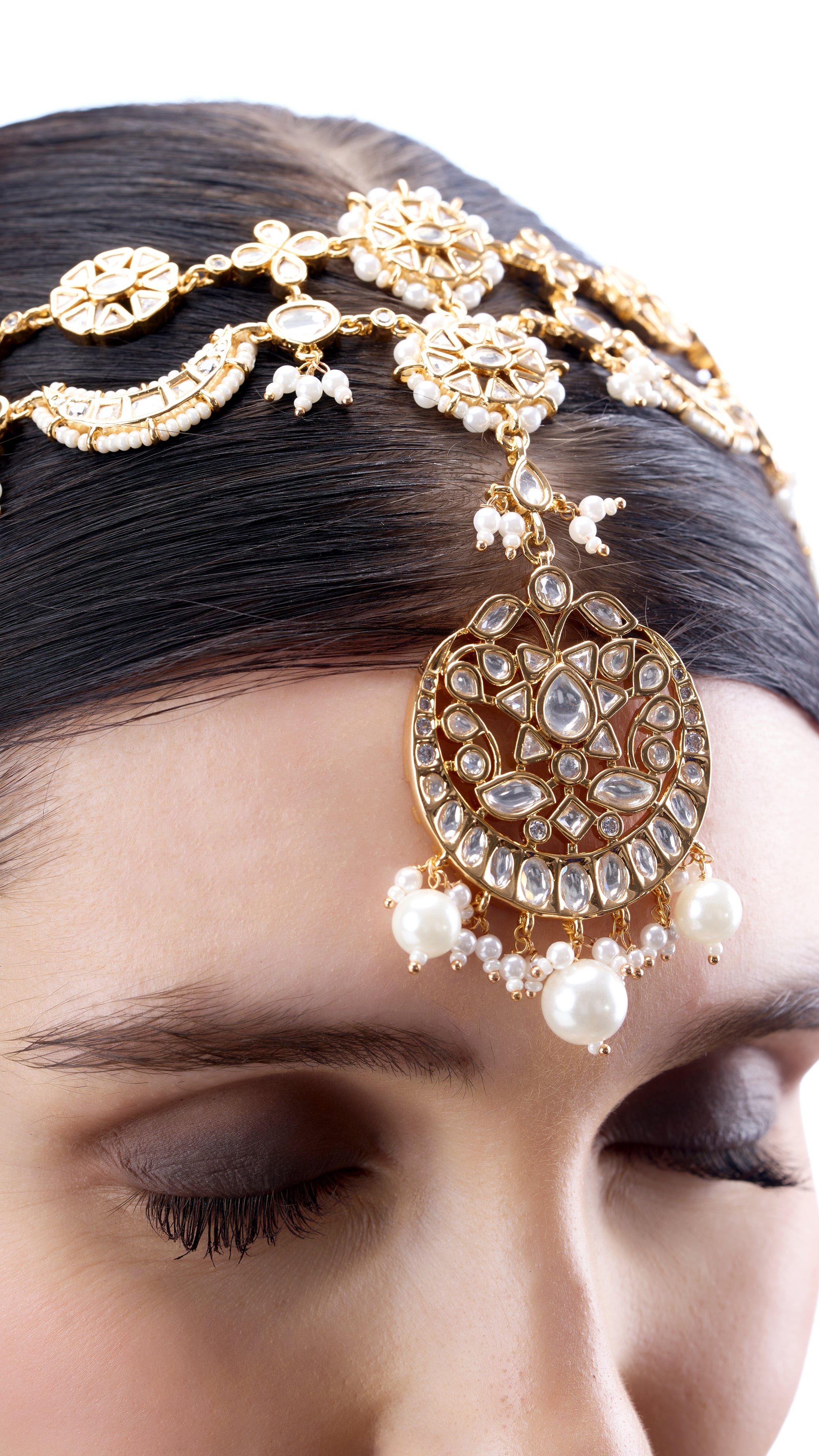 Double layered Kundan Matha Patti, adorned with lustrous pure pearls, showcases intricate craftsmanship and regal design. A stunning accessory that adds elegance and traditional charm, perfect for brides or festive occasions.