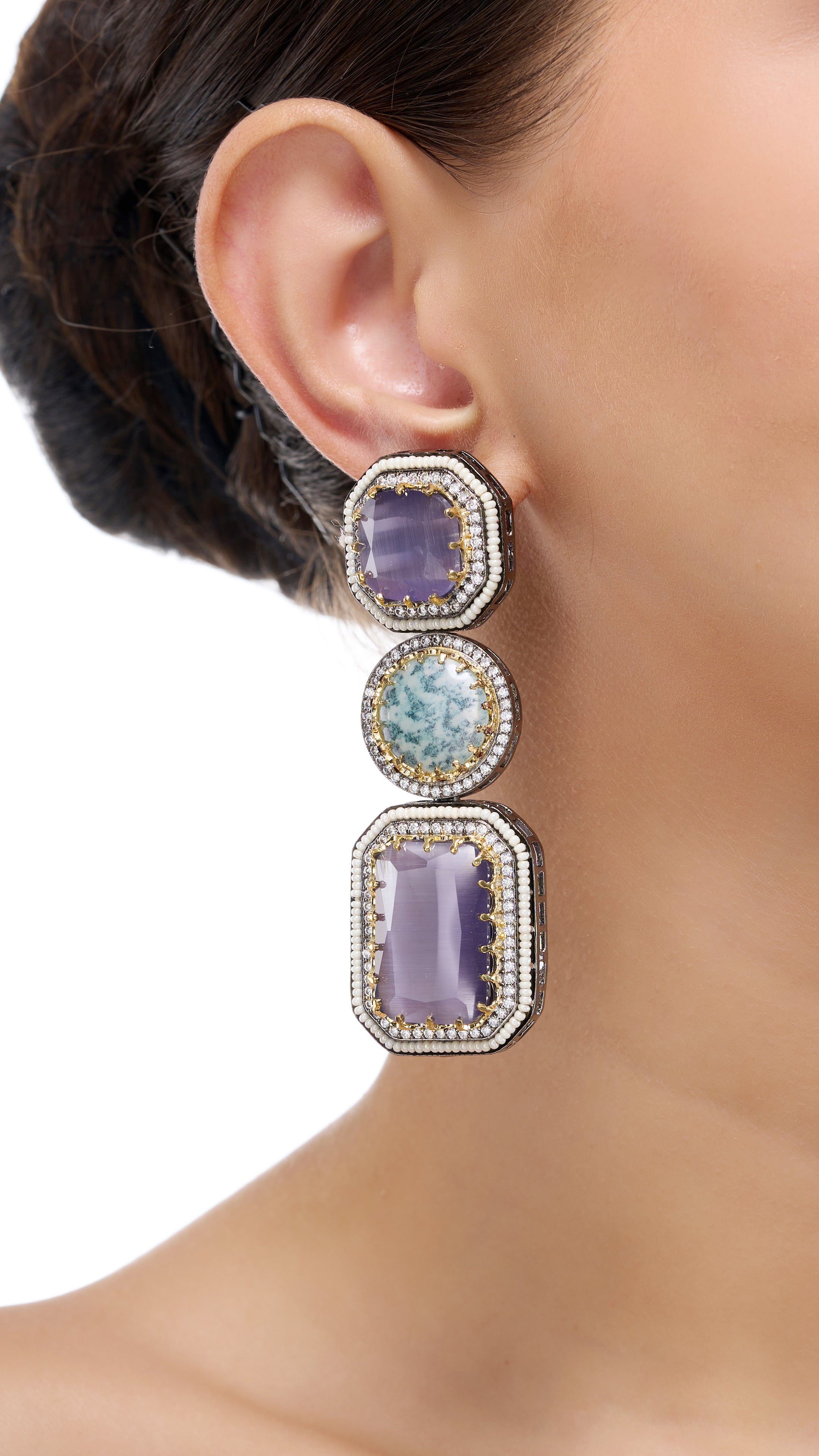 Stunning triple-layer earrings with pure stones in vibrant purple, offering a luxurious and eye-catching design that adds a touch of elegance to any outfit
