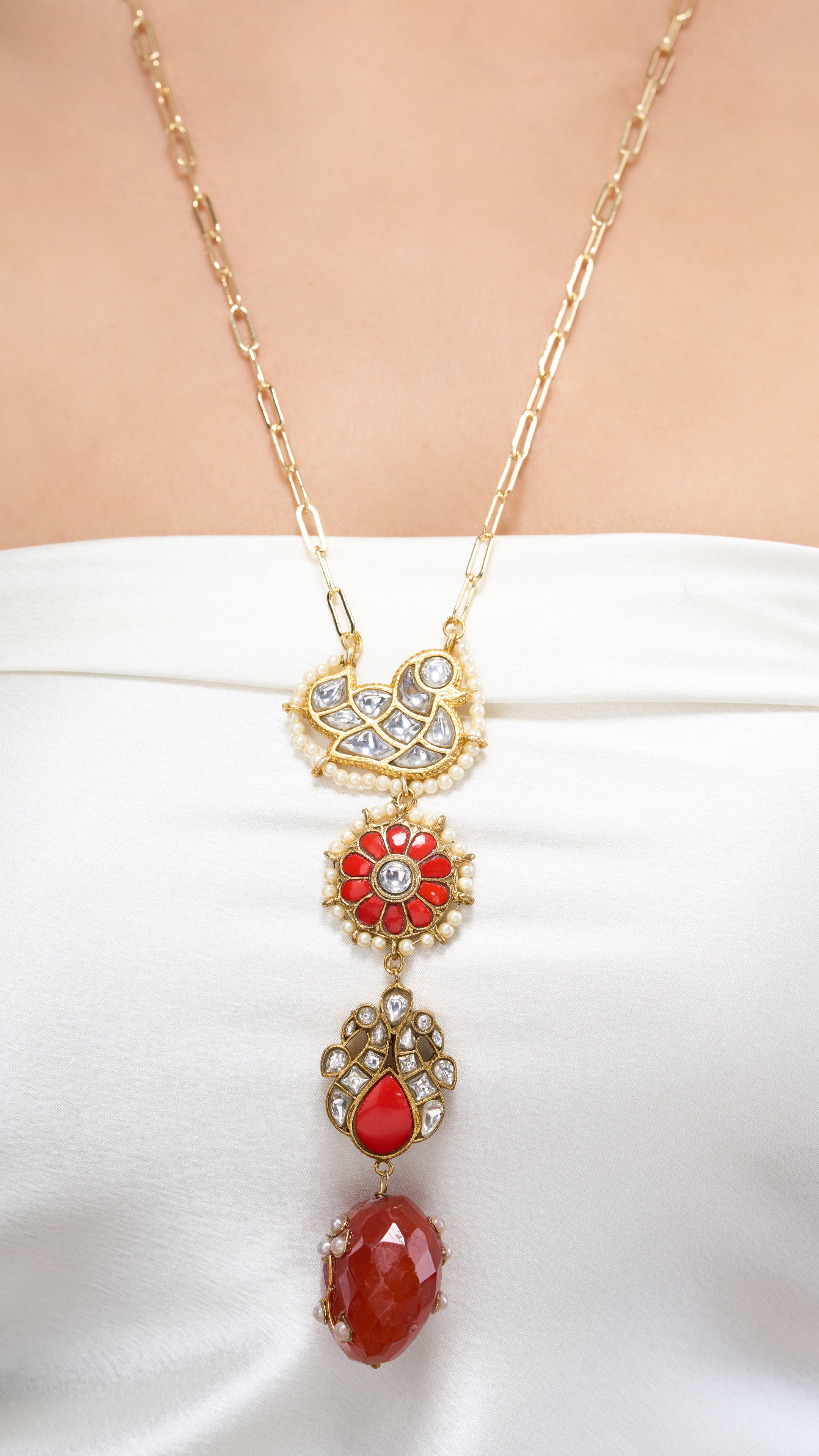 Charming hand enamel necklace featuring semi-precious coral stones, combining vibrant hues and intricate design for a sophisticated, eye-catching accessory.