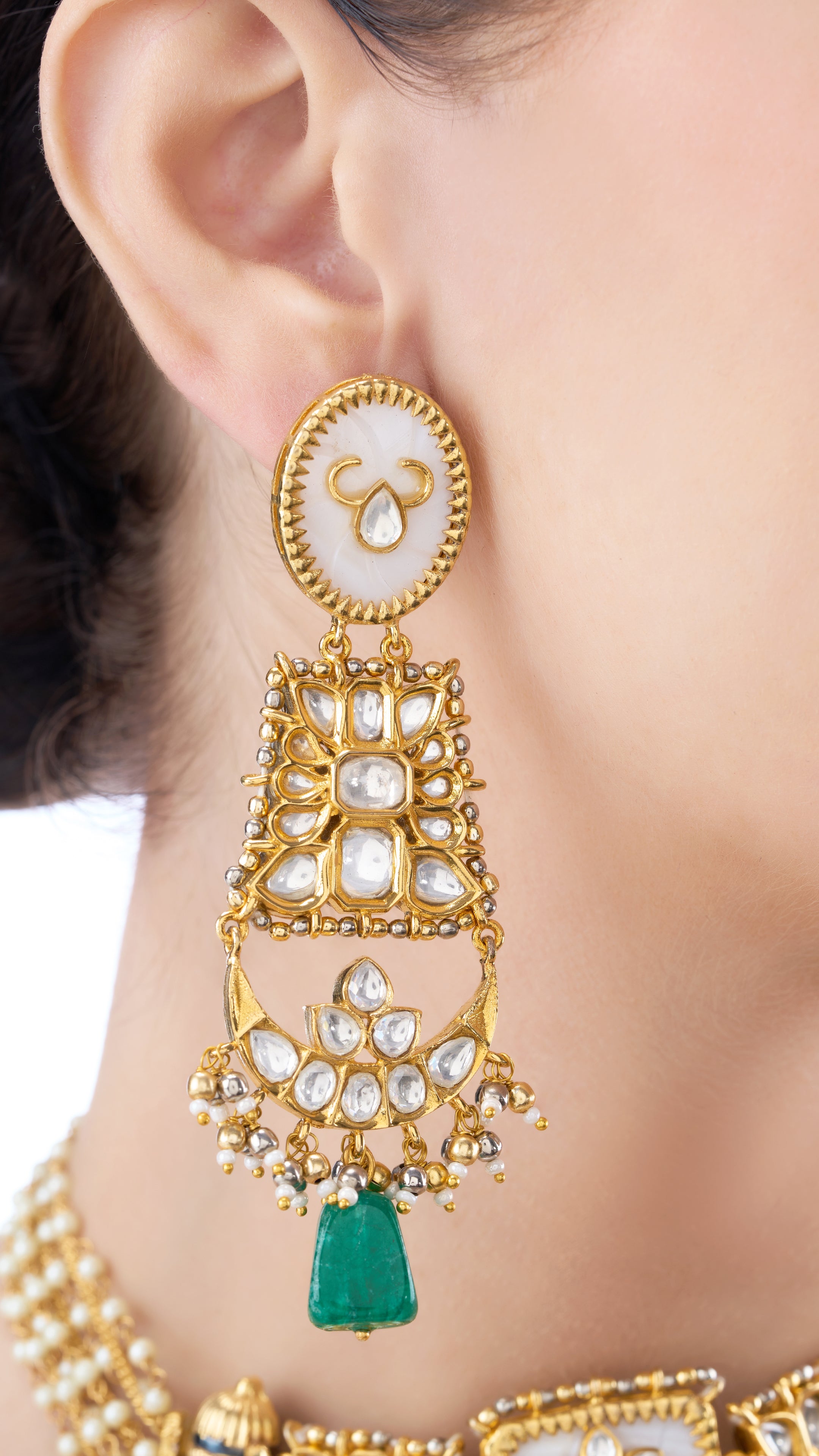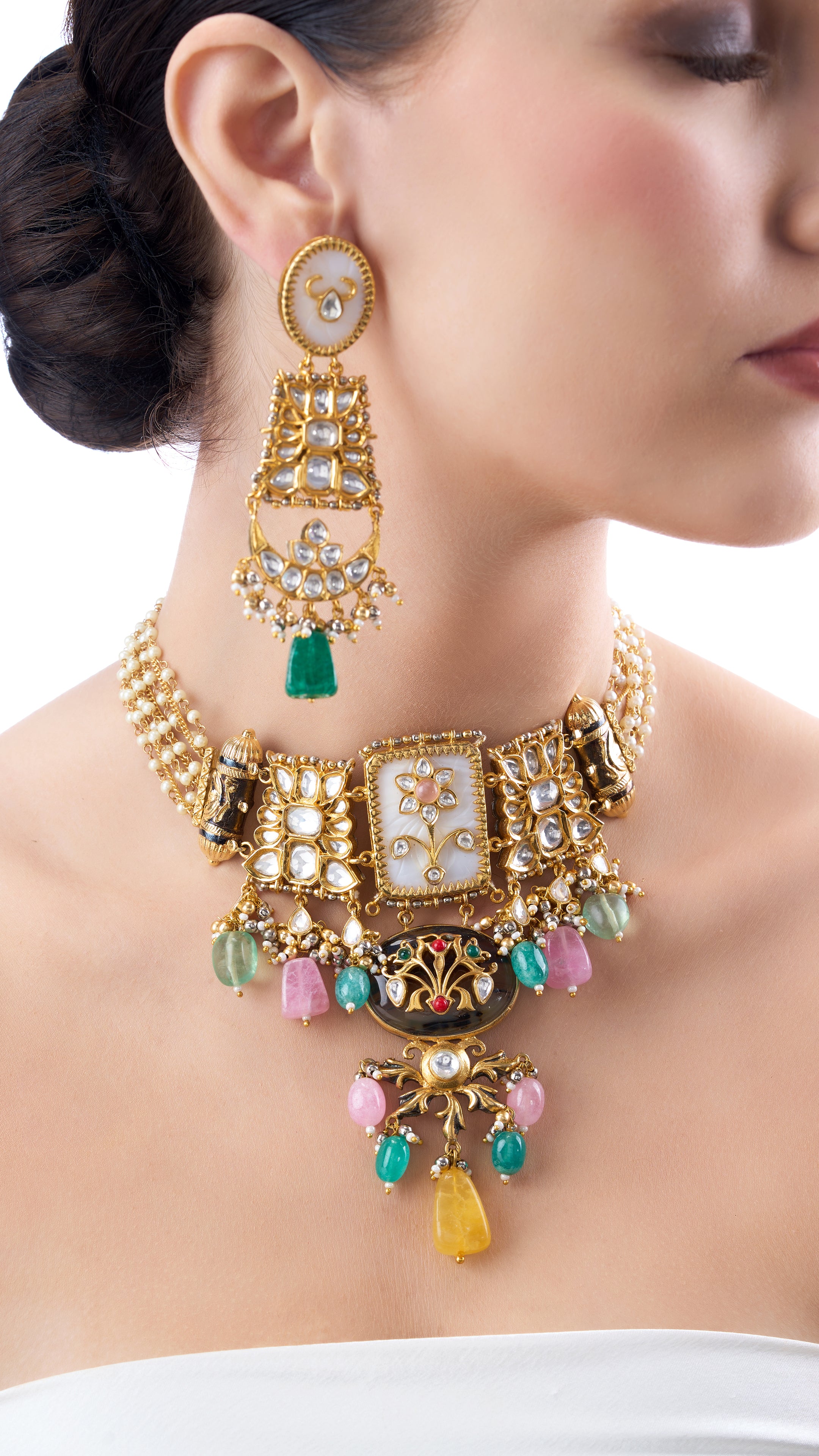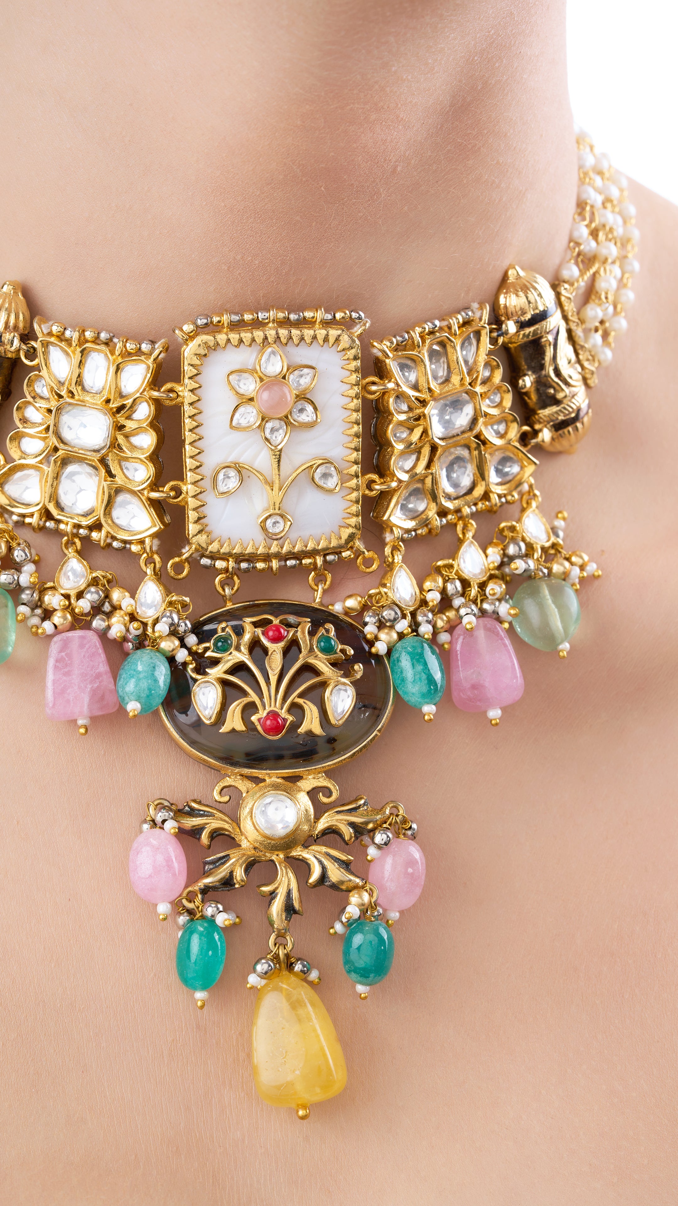 Vibrant multi-color Haldali choker necklace set featuring white semi-precious stones, blending bold colors with intricate design for a striking look.