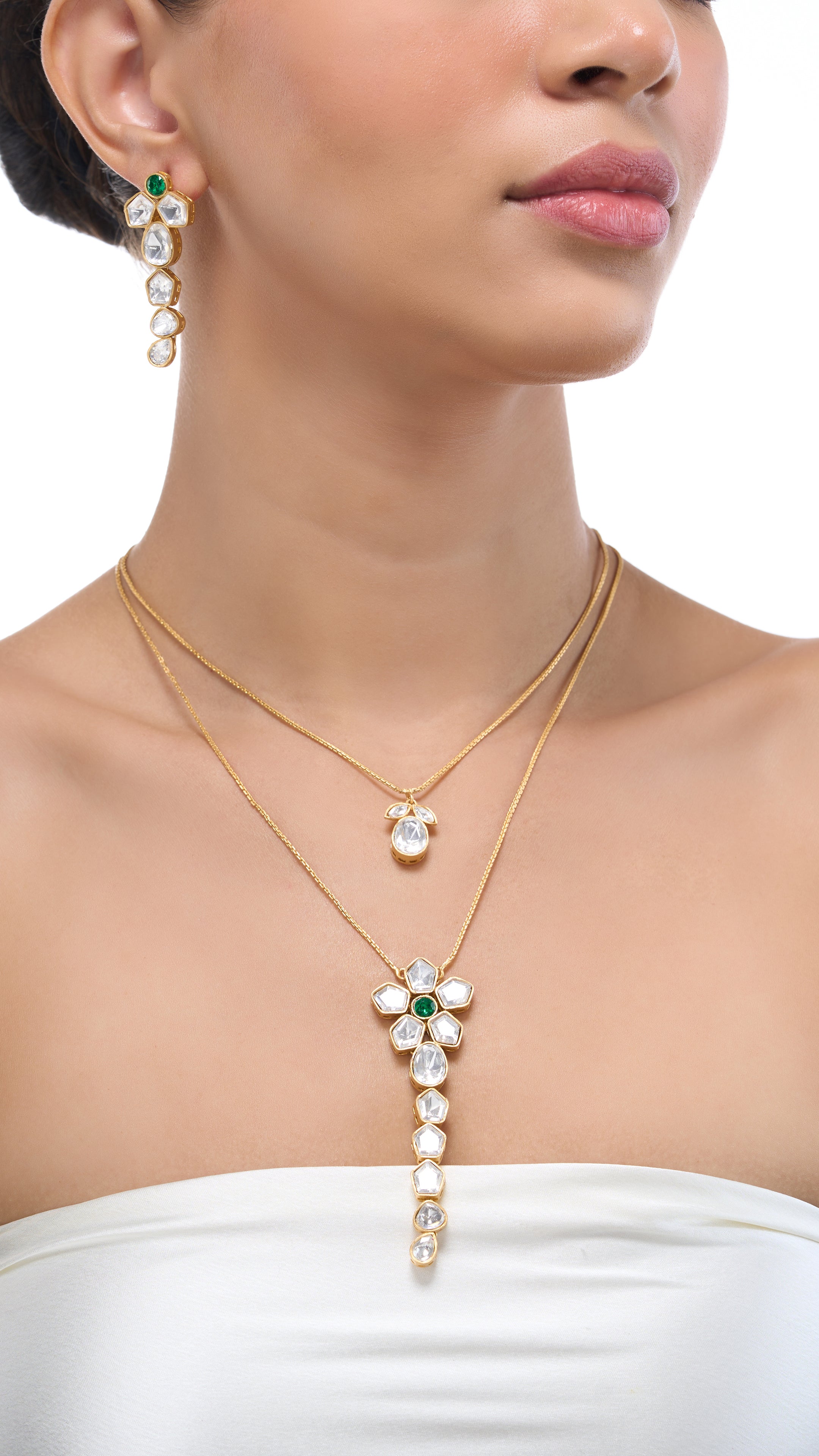 Charming double-layer flower Kundan necklace set in green, featuring intricate craftsmanship and vibrant hues. A statement piece that adds elegance and sophistication to any occasion