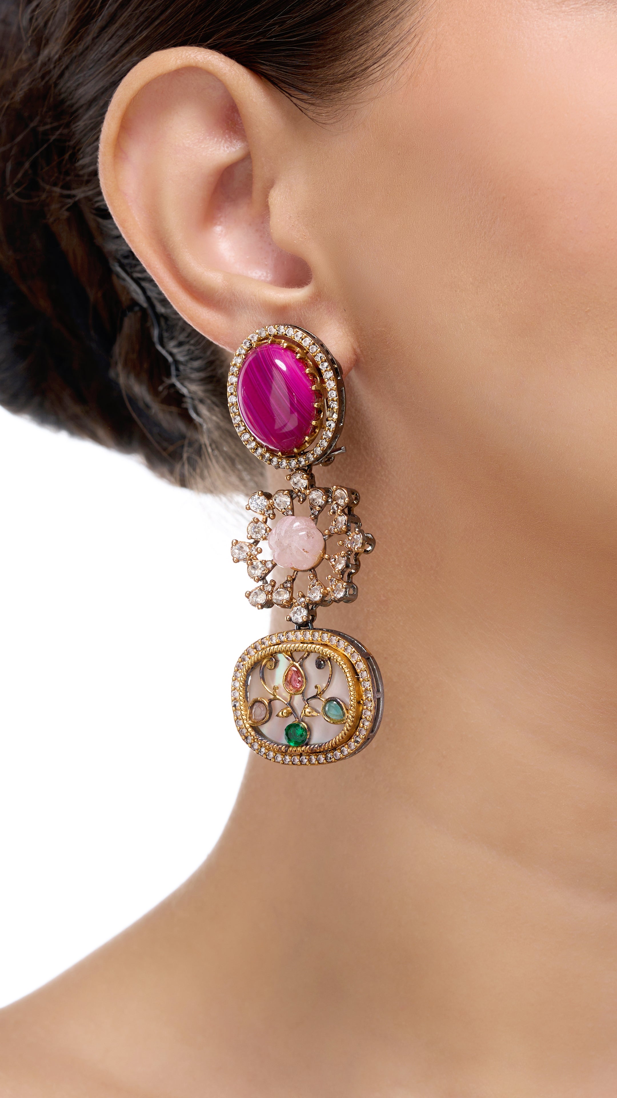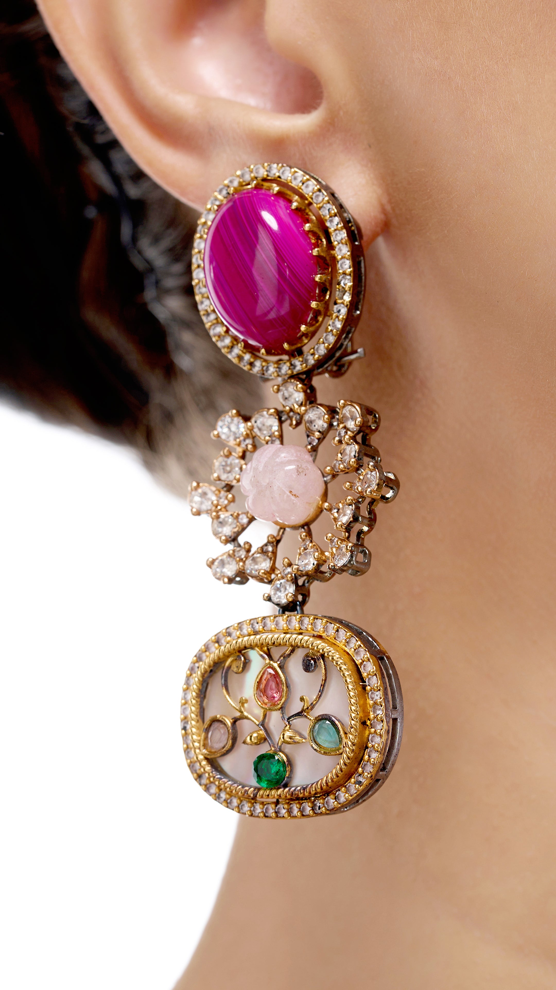 Elevate your look with our Triple Layer Hand Engraved Earrings on Mother of Pearl in Magenta. Each earring features three elegantly layered designs, meticulously hand-engraved for a unique, artisanal touch. The luminous Mother of Pearl base enhances the rich magenta accents, creating a stunning contrast. Perfect for adding a vibrant, yet refined flair to any outfit, these earrings embody a harmonious blend of traditional craftsmanship and contemporary elegance.
