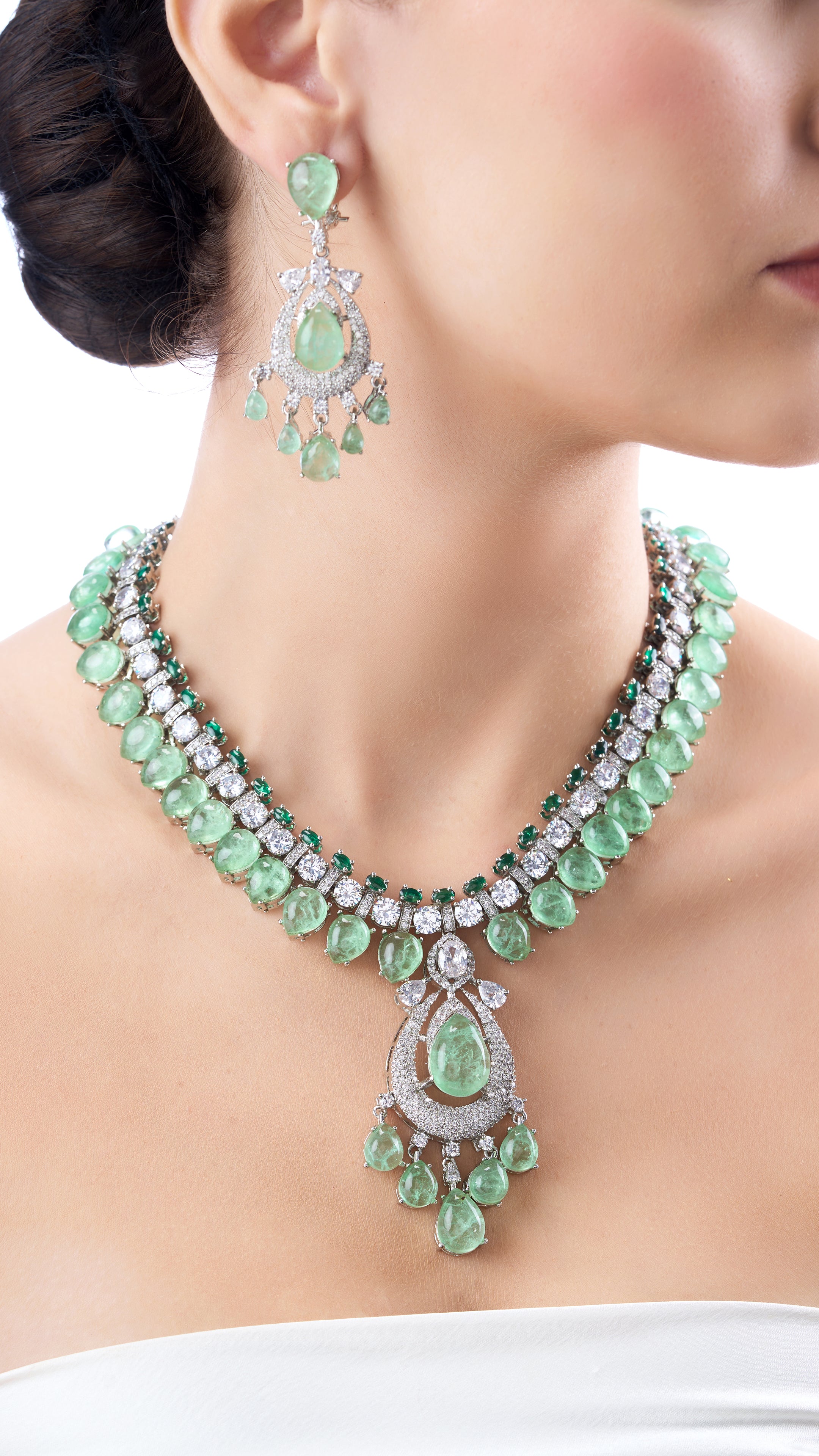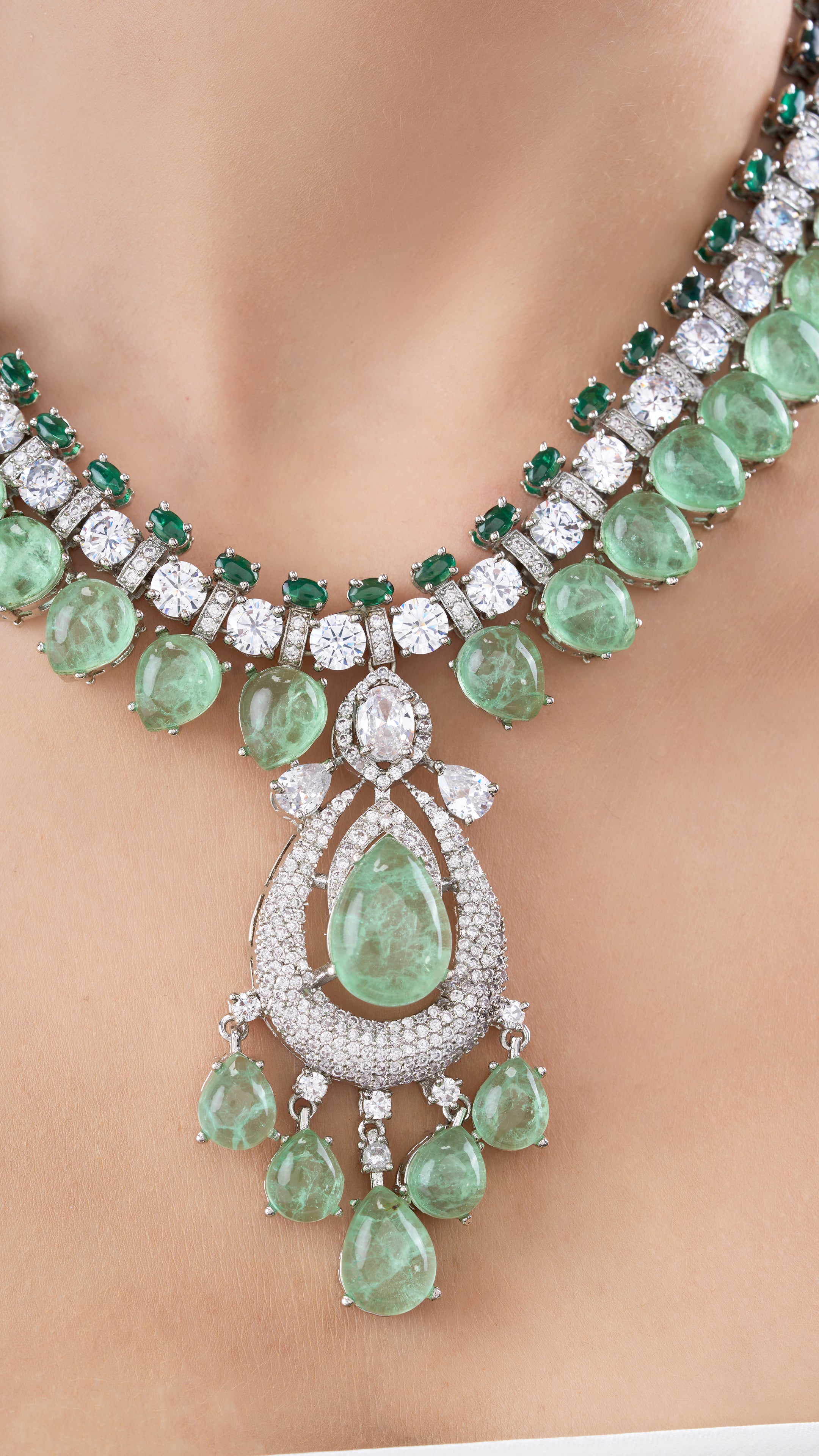 Stunning double-layer necklace set featuring Moissanite and semi-precious aqua stones, combining sparkling brilliance with serene color for an elegant look.