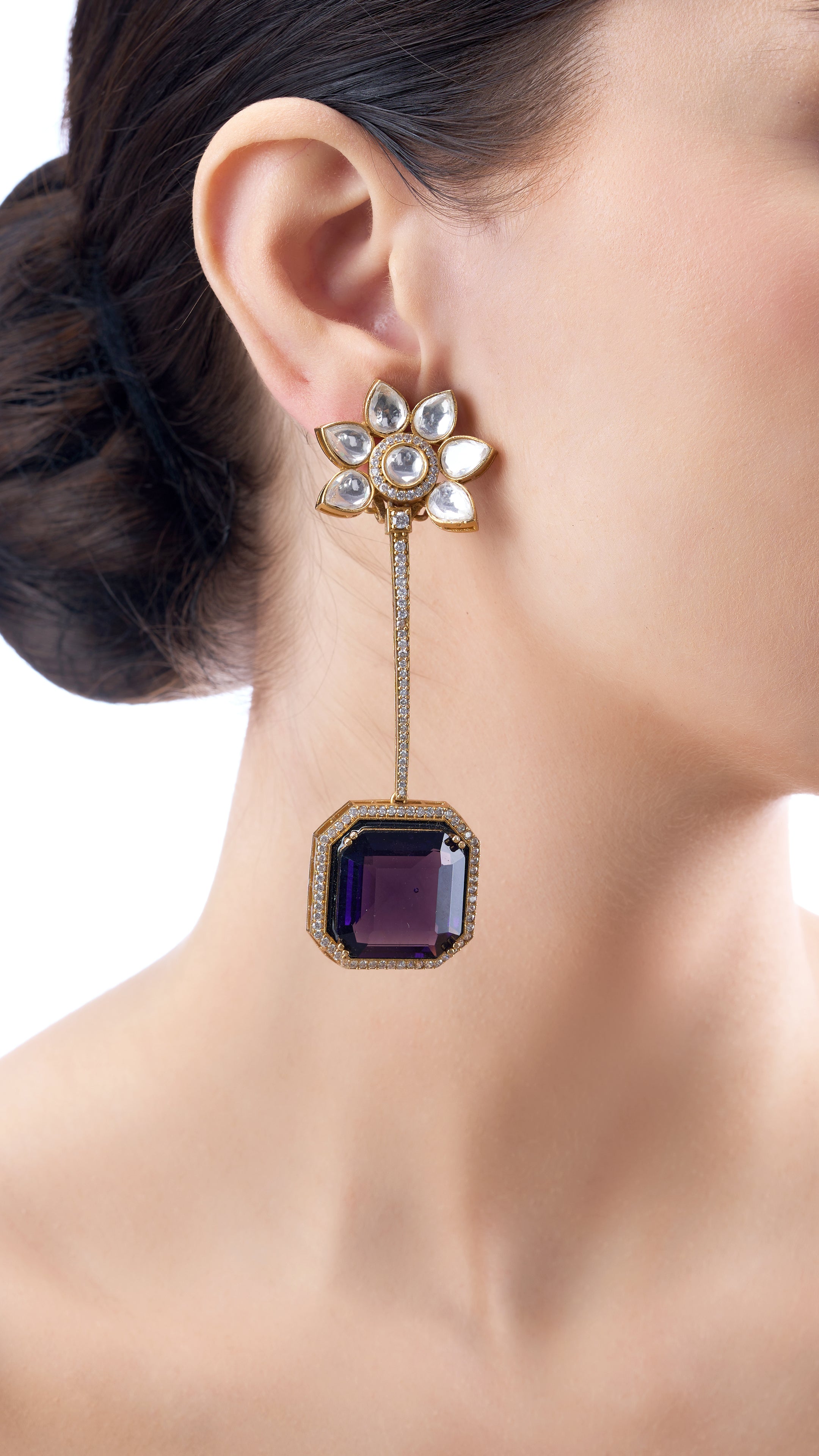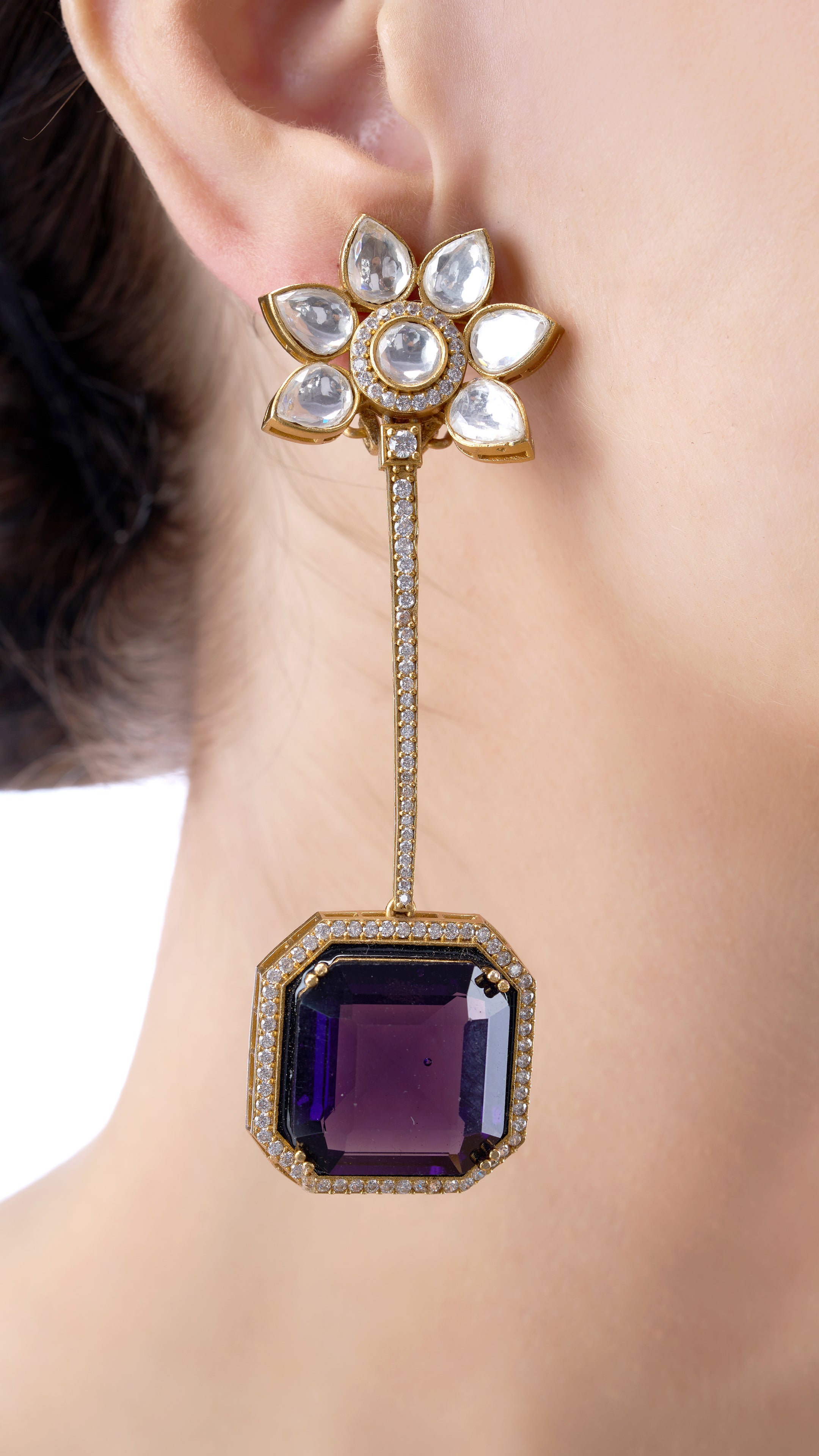 Delicate flower Polki single-drop earrings featuring purple semi-precious stones, blending timeless design with vibrant color for an elegant look.
