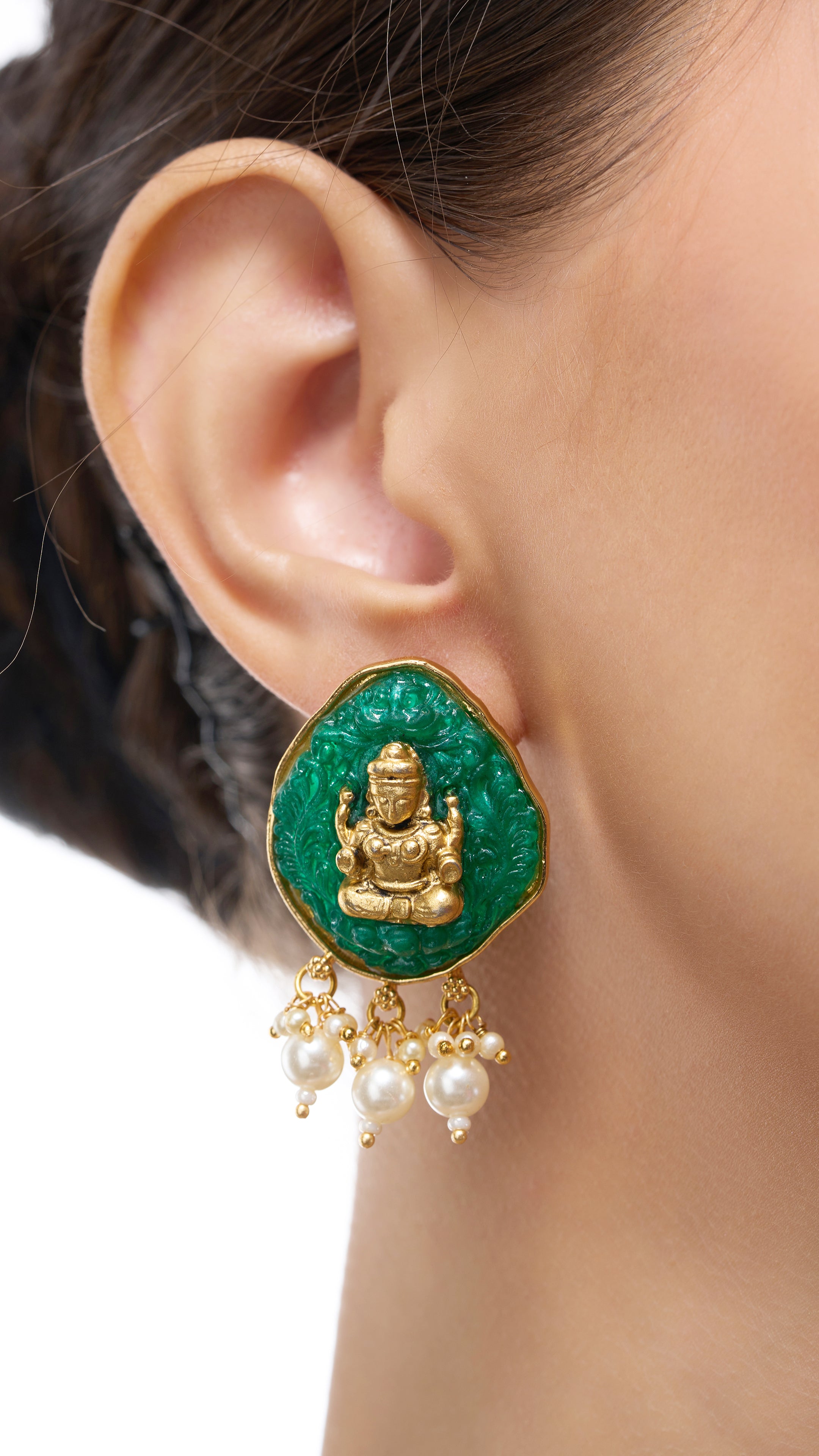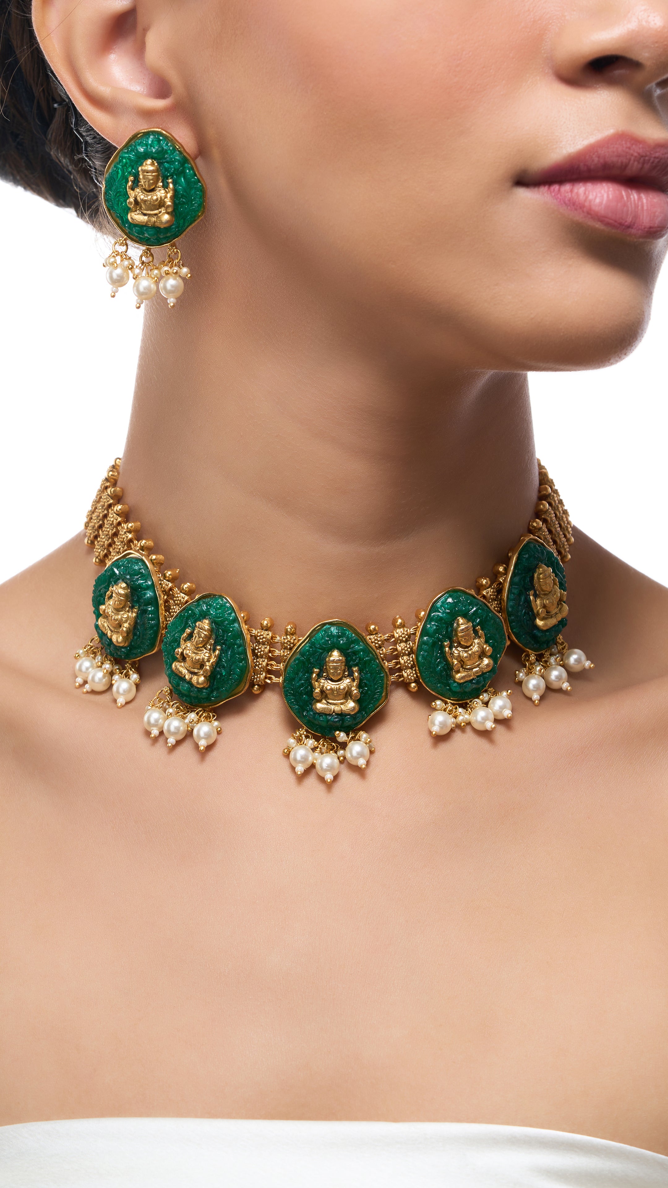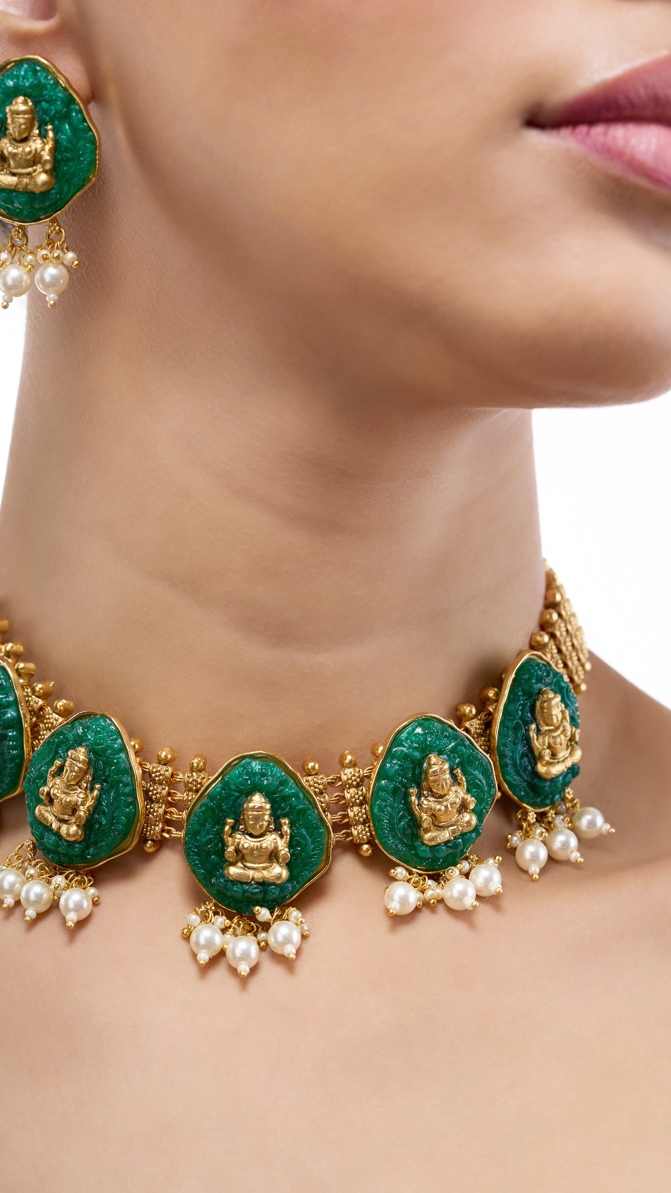 Elegantly crafted, the Gold Foil Laxmi Necklace dances with intricate filigree, embracing the soul in a lush embrace of green.