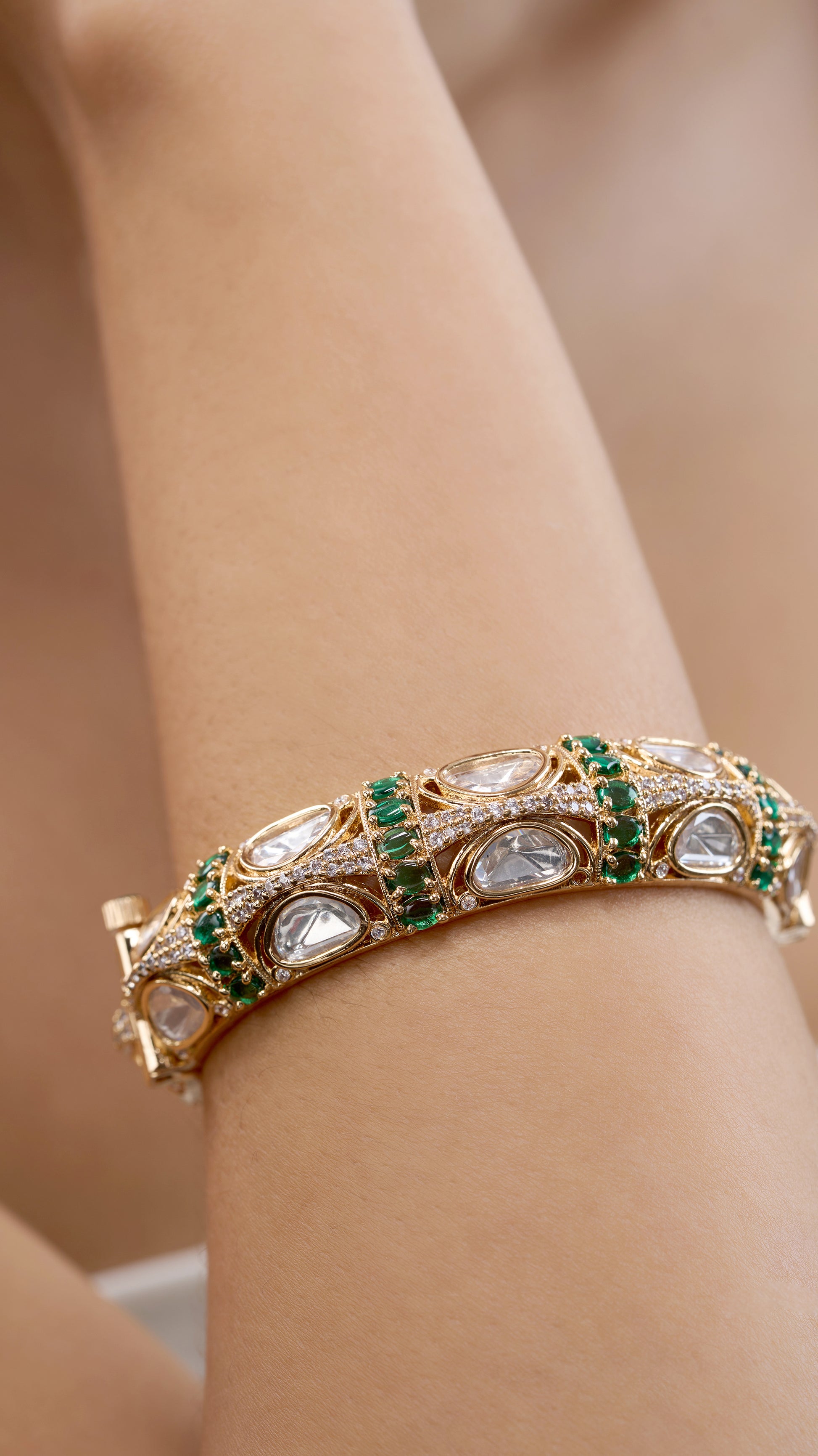 Uncut Polki Bangle adorned with radiant green hydro stones. The combination of uncut Polki's raw charm and the vivid green stones offers a unique look. Perfect for enhancing any outfit with a touch of classic beauty.