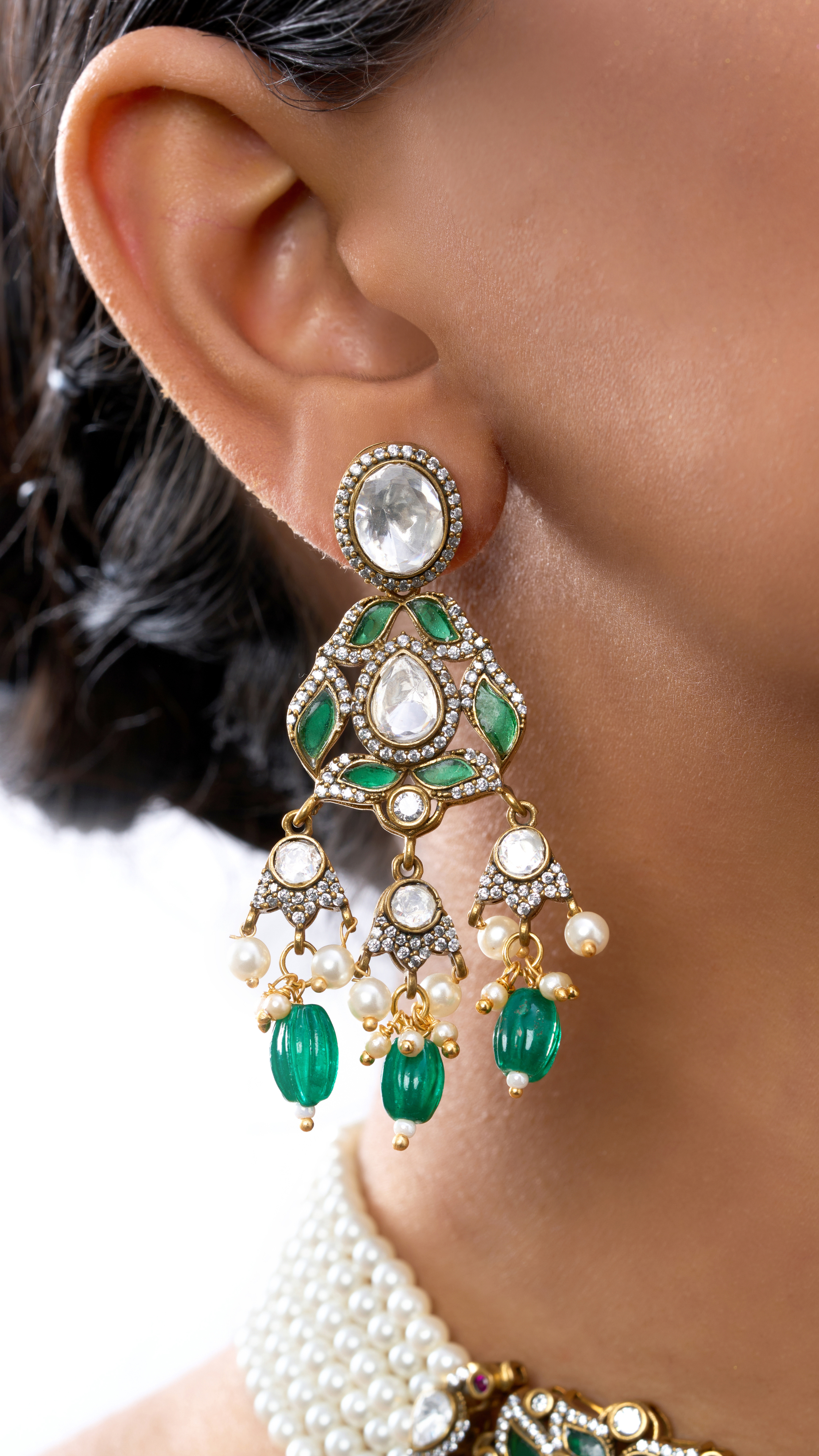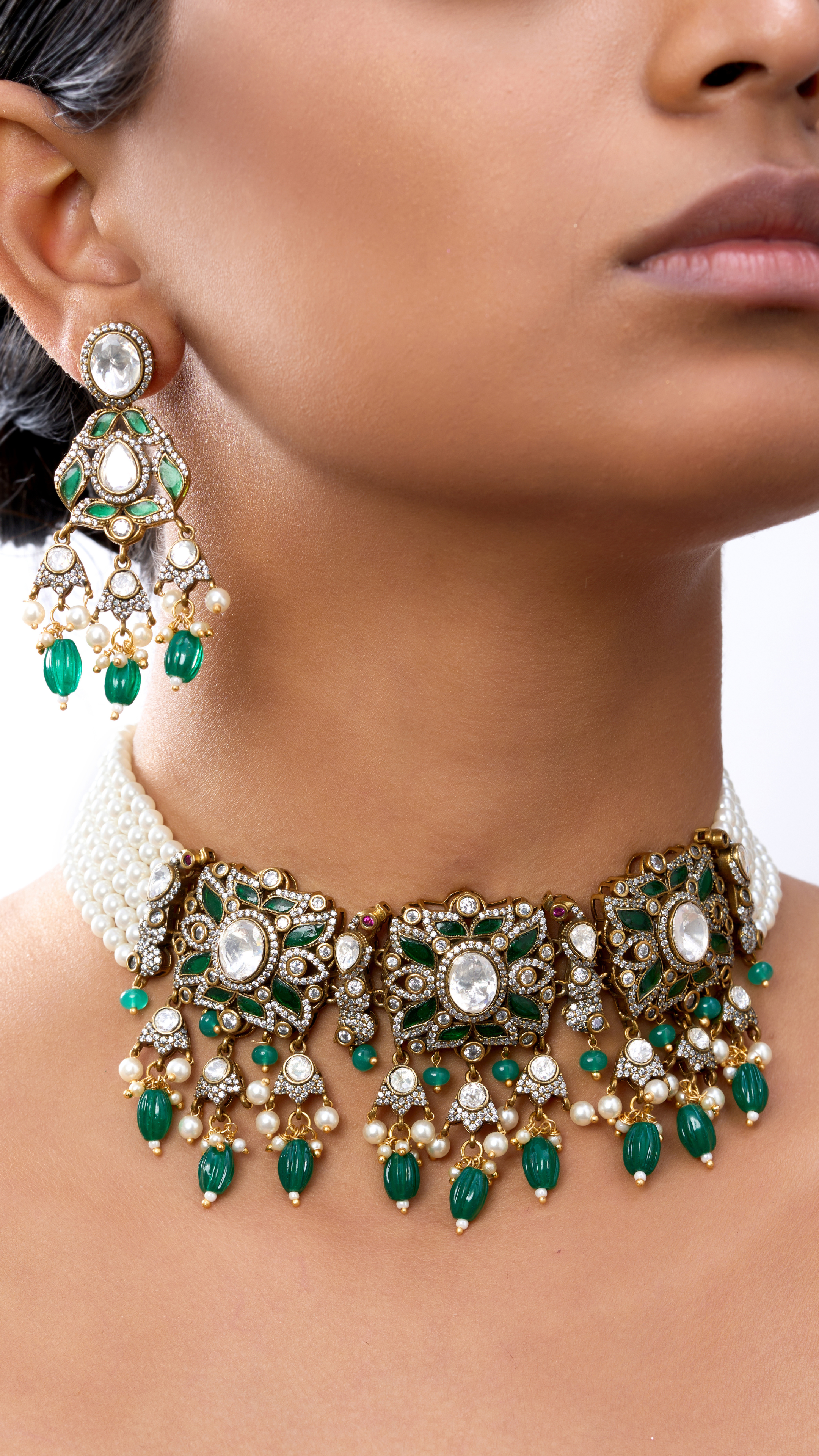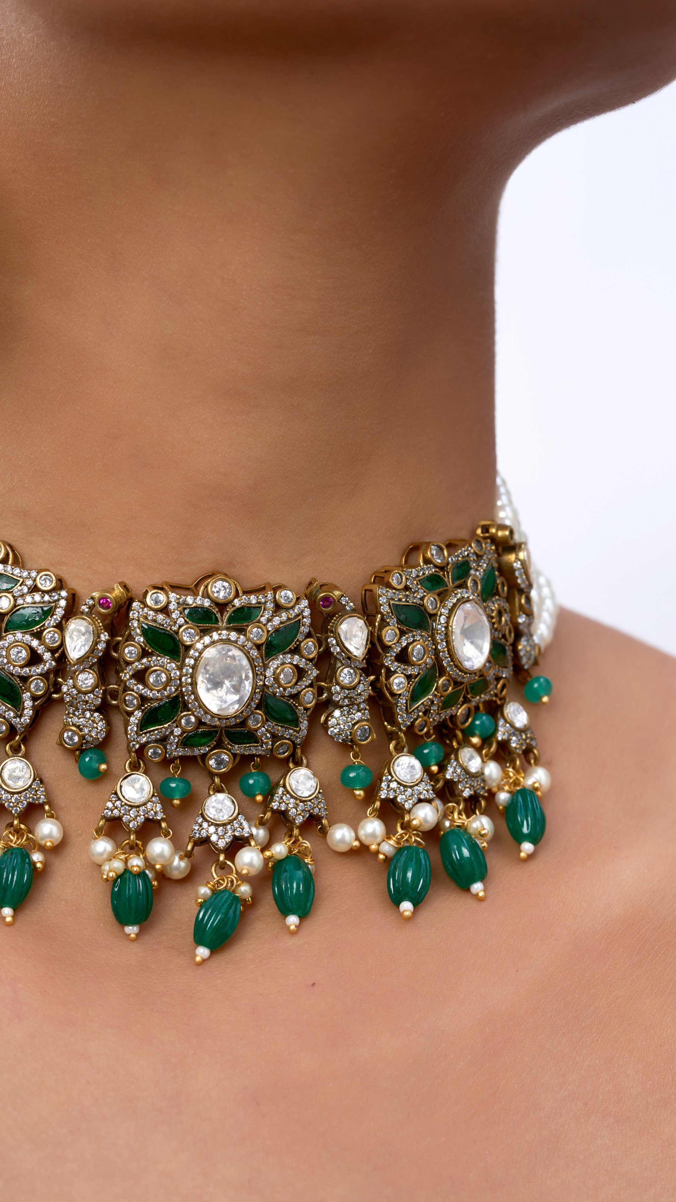 Introducing the Emerald Victorian Polki Choker, a fusion of vintage elegance and modern sophistication. This exquisite piece features lustrous Polki stones set amidst vibrant emeralds, evoking the opulence of the Victorian era. Meticulously crafted, the choker exudes timeless allure with its intricate detailing and regal design. Each emerald radiates with rich color and beauty, complementing the sparkle of the Polki. Whether worn for a special occasion or to elevate everyday attire, this choker captivates with its undeniable charm. Adorn your neckline with the Emerald Victorian Polki Choker and indulge in the luxurious beauty of this exquisite piece.