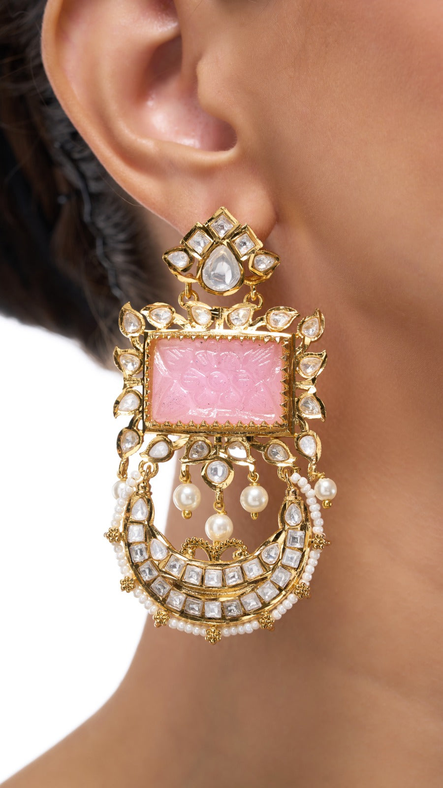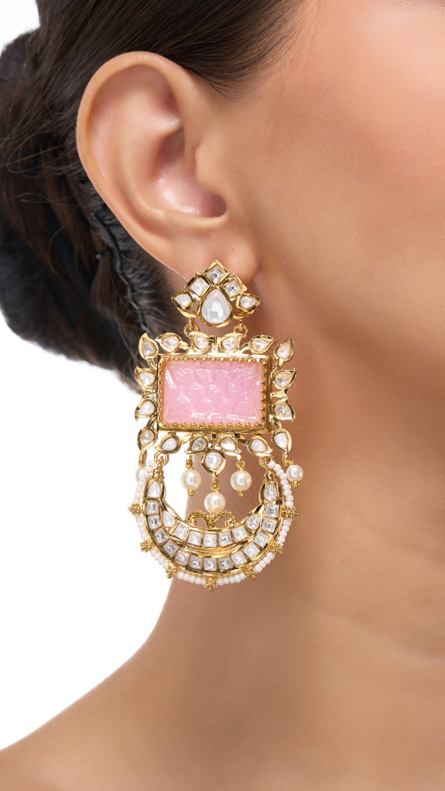 Elegant Monalisa stone Kundan earrings in pink, blending intricate craftsmanship with a vibrant hue for a classic and refined accessory.