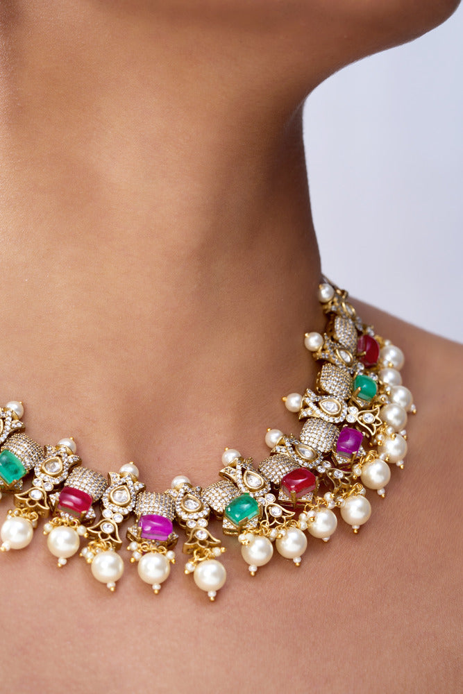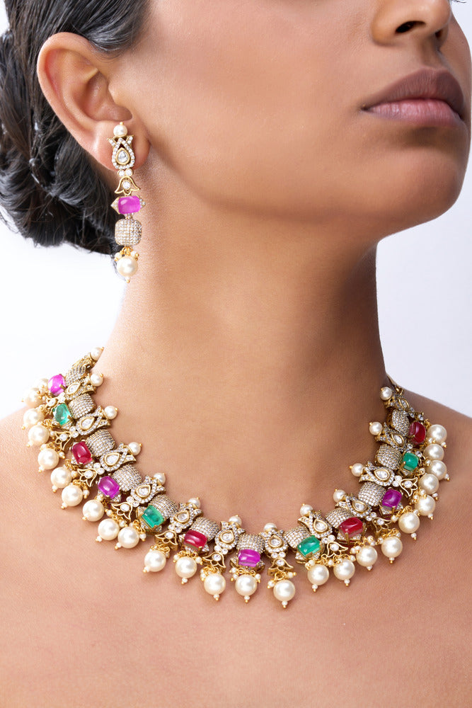 Swara polki with pure multi colour stones necklace set