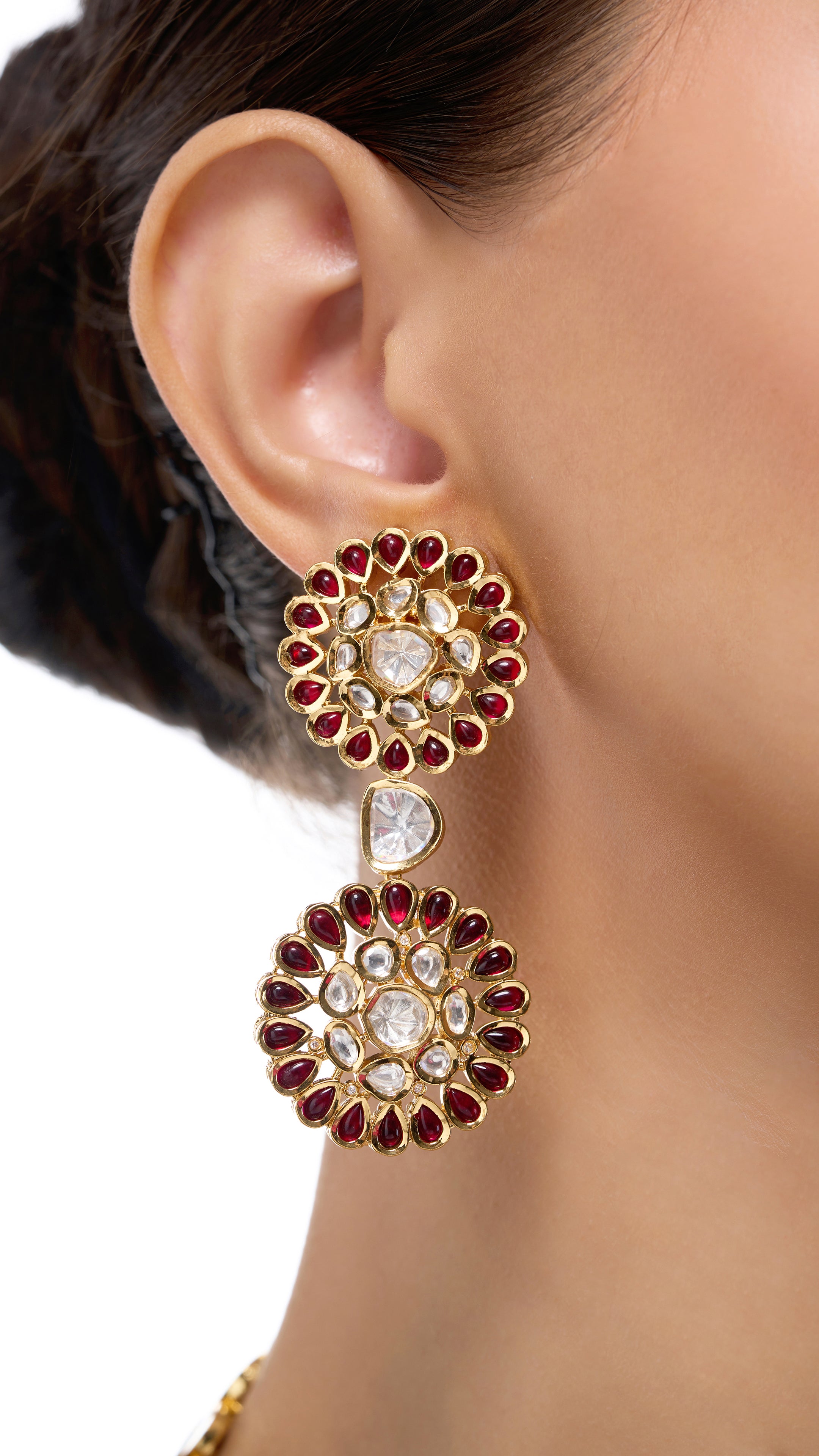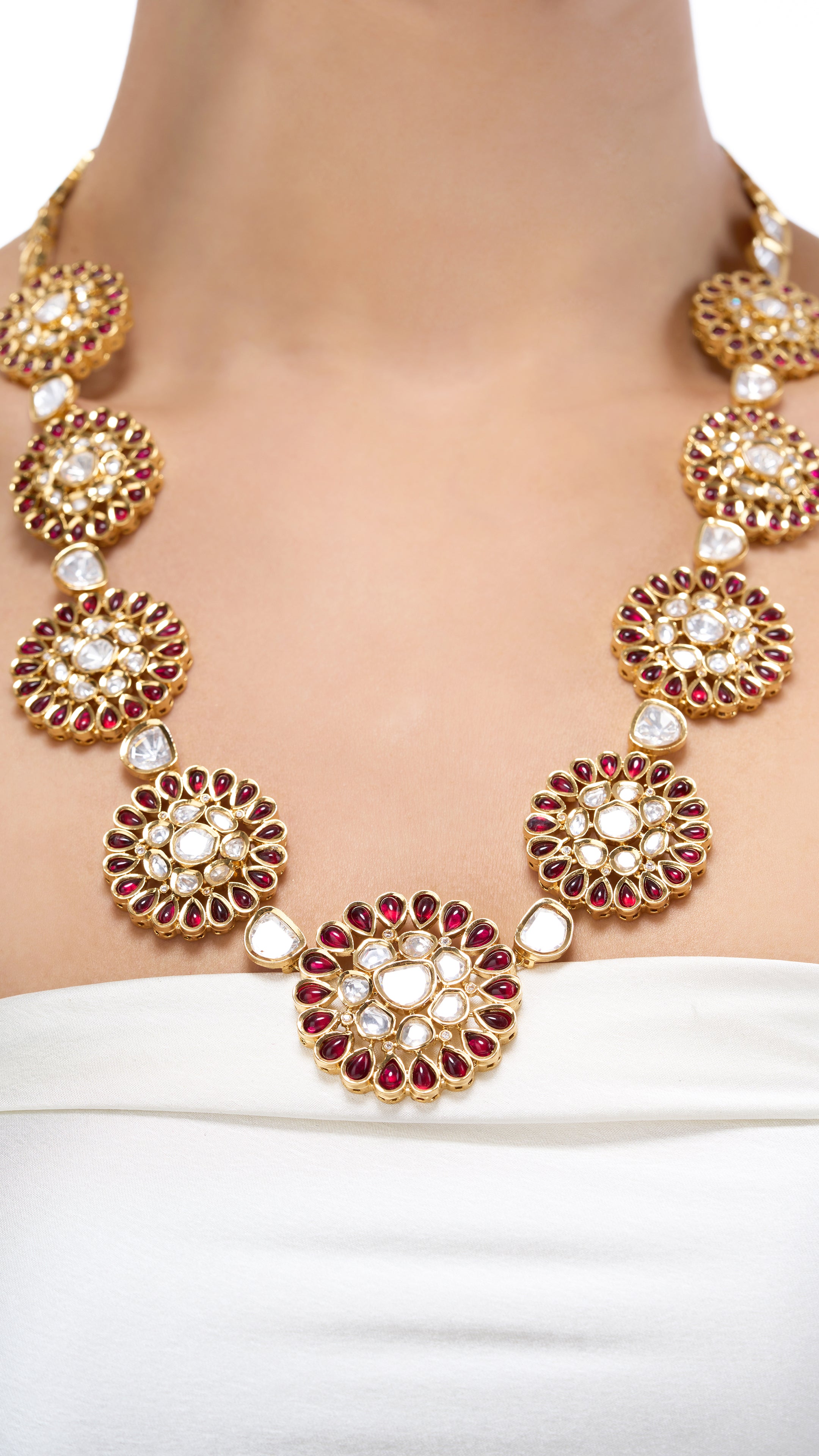 Add elegance to any ensemble with our Gold Foil Semi-Precious Polki Necklace featuring a stunning ruby centerpiece. Made with high-quality materials, this necklace exudes sophistication and luxury. Enhance your look and make a statement with this handcrafted piece. Perfect for any occasion.