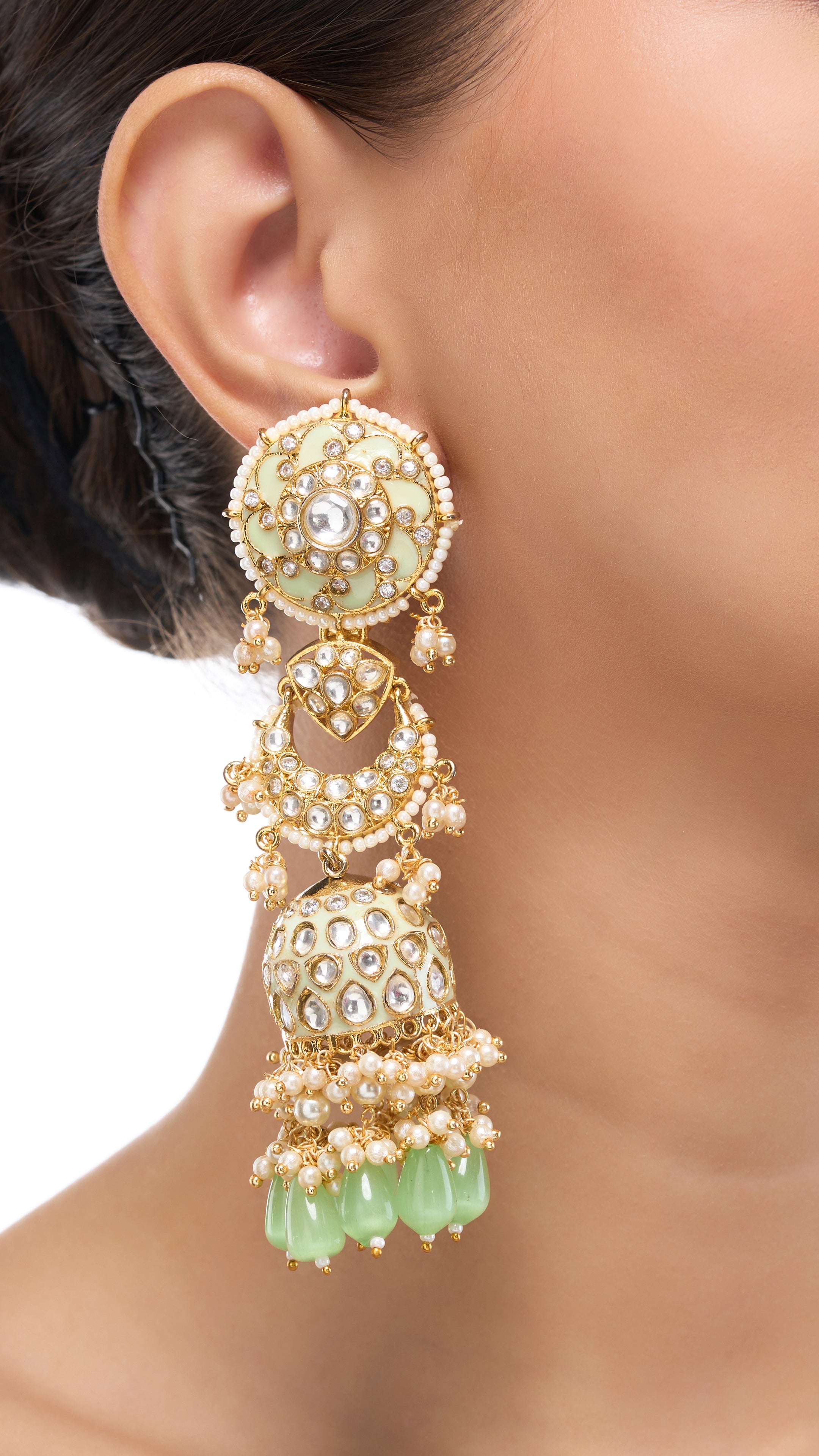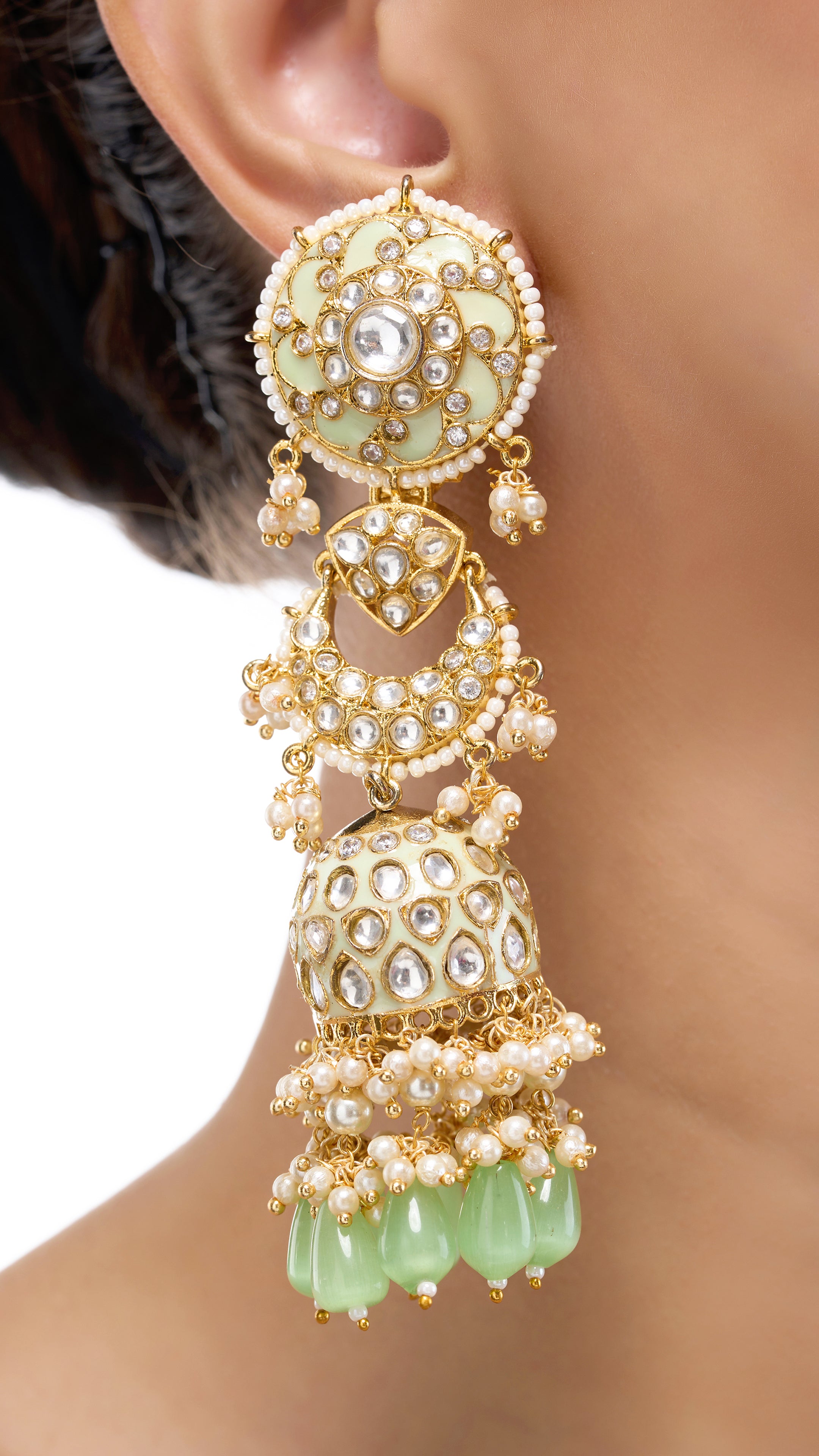 Elegant long Kundan enamel jhumki in green, featuring intricate detailing and a graceful design, perfect for a classic, stylish look.