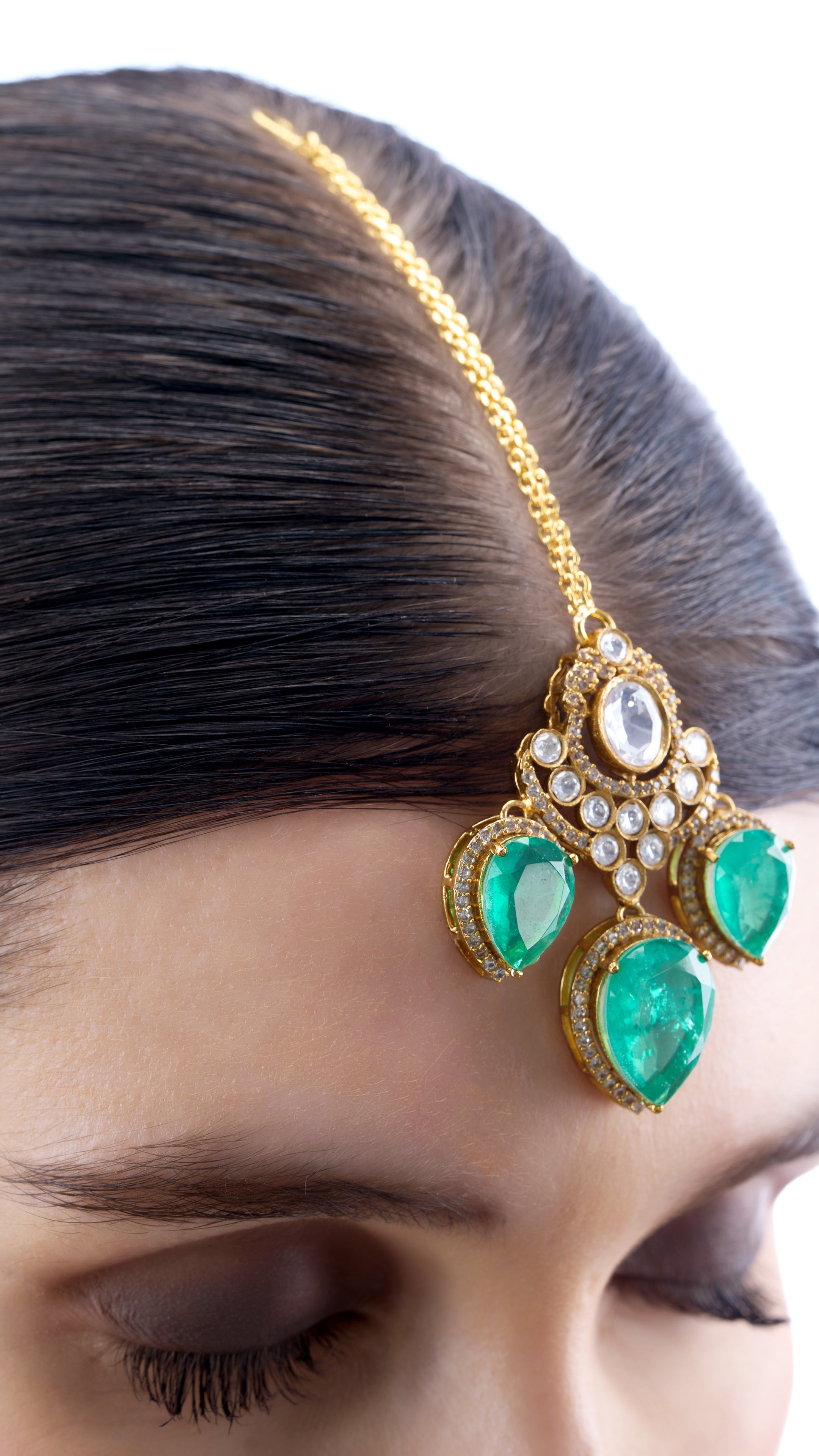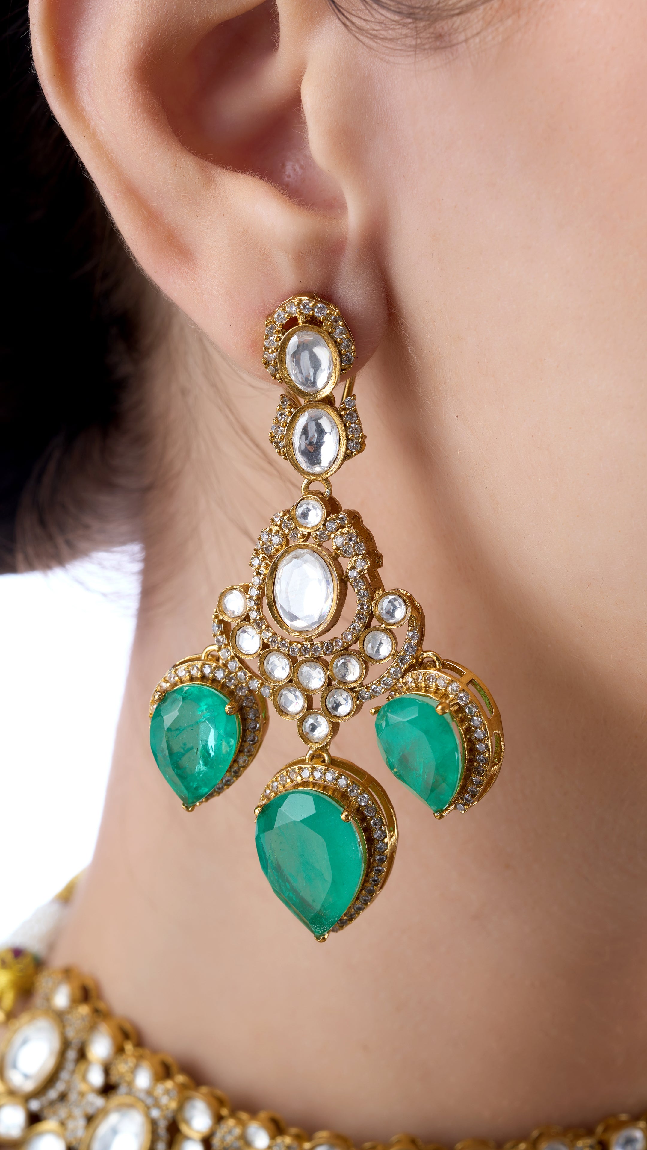 Bridal chandelier Polki choker, embellished with green semi-precious stones, features intricate detailing and a bold design. A stunning statement piece that adds royal elegance and a pop of color to your wedding ensemble.