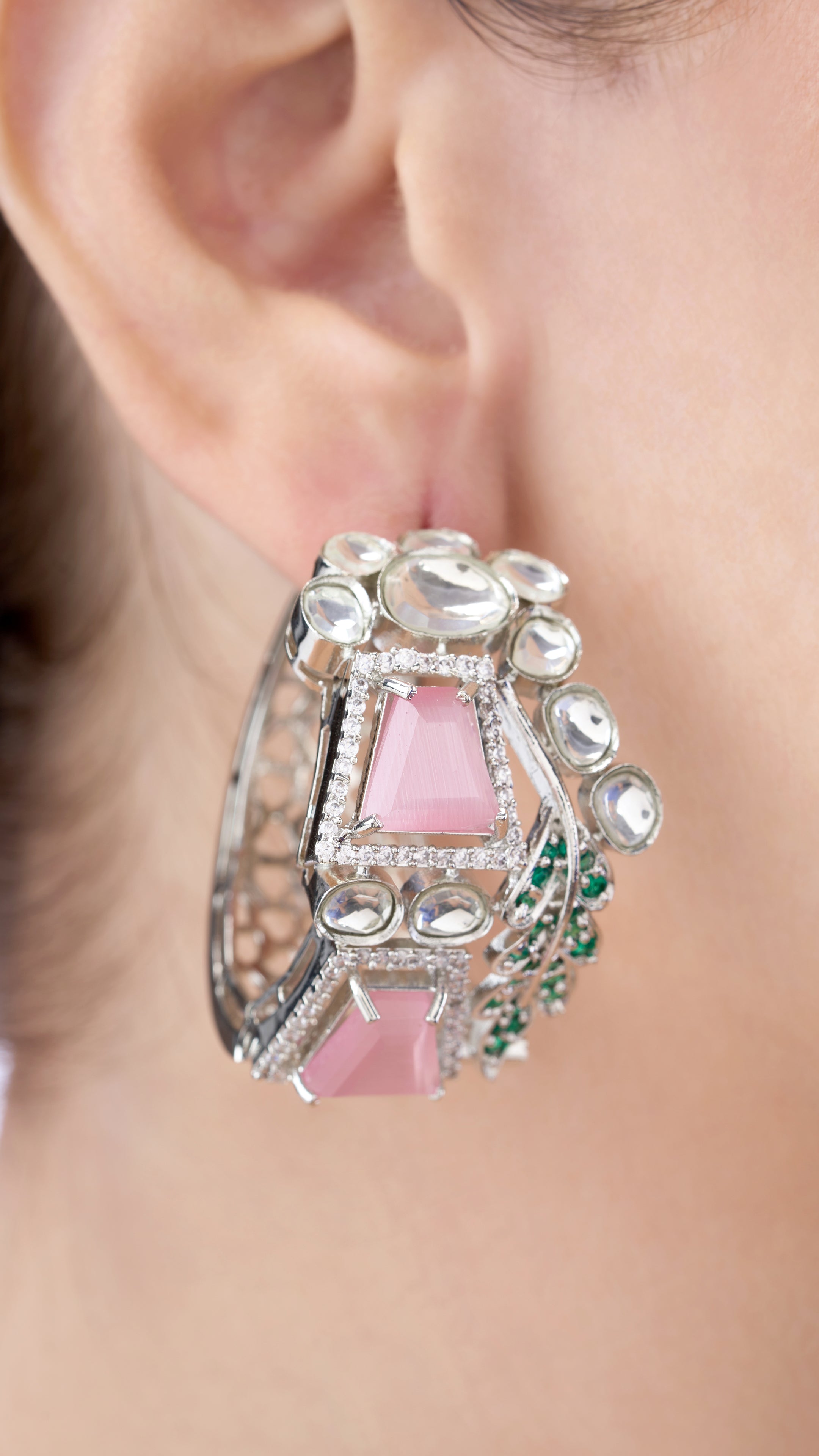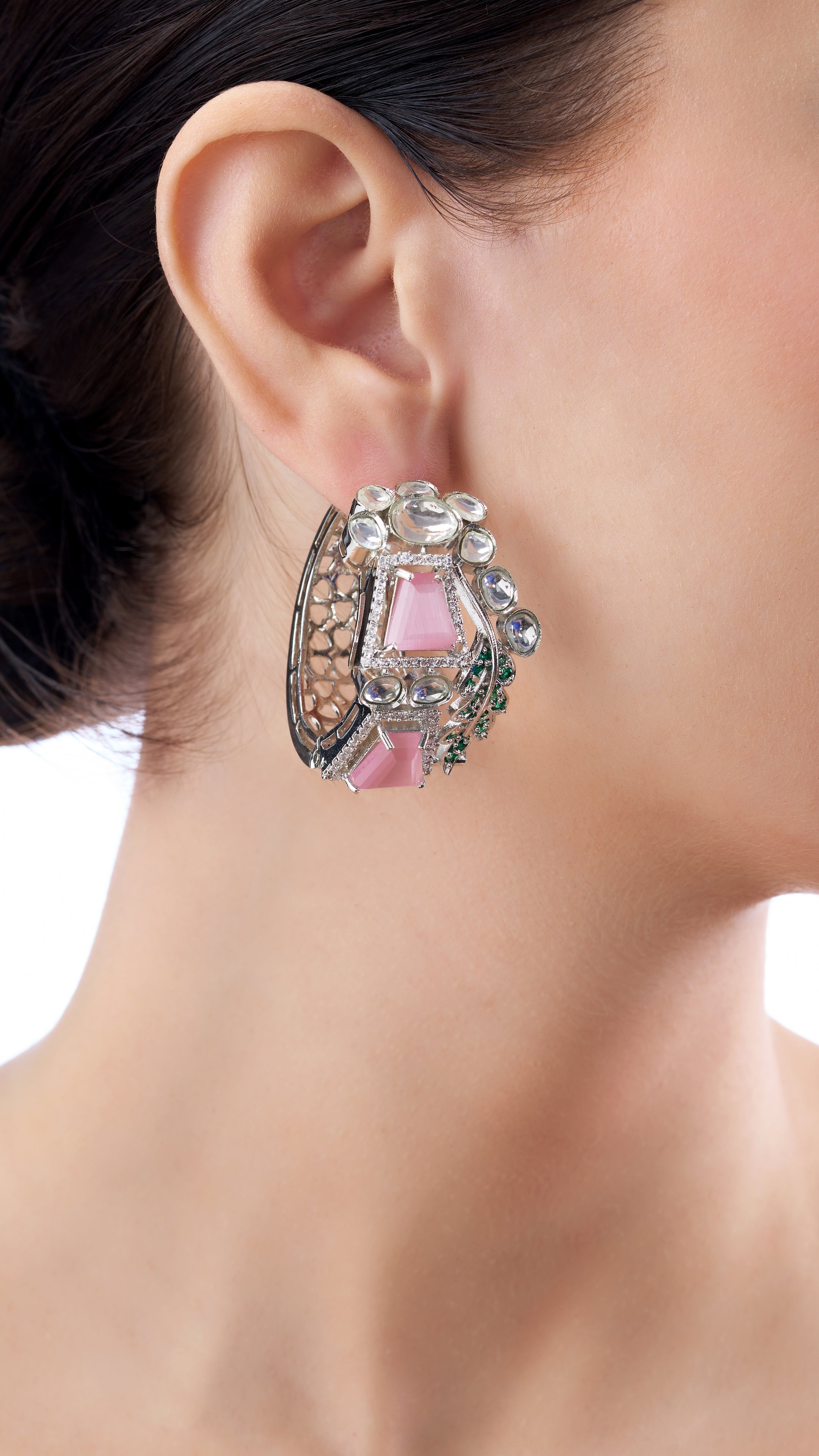 Abstract mesh Kundan hoops, embellished with quartz semi-precious stones, offer a bold fusion of modern design and traditional craftsmanship. A statement piece that adds vibrant color and sophistication to any look.