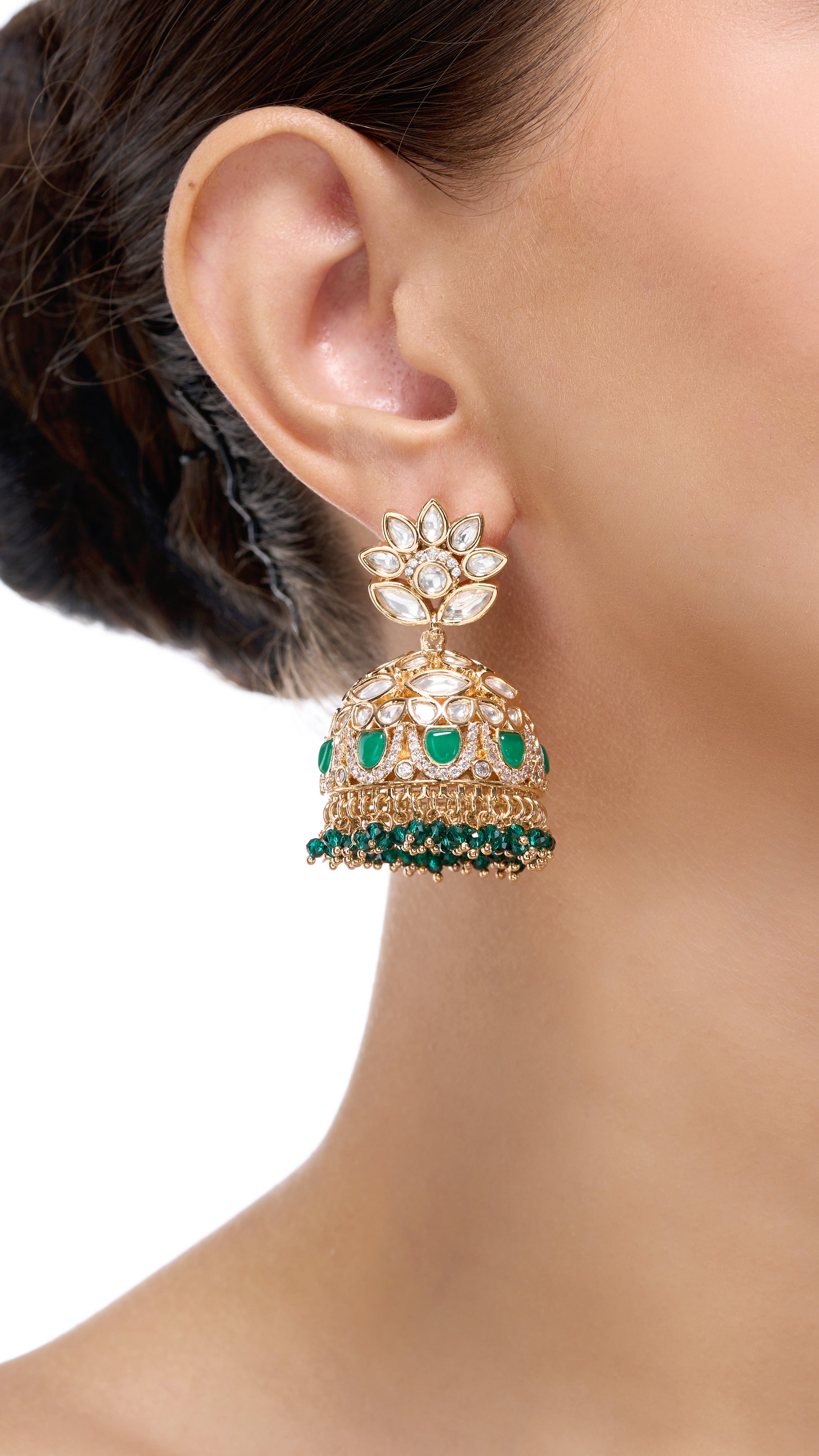 Gold Foil Kundan Flower Jhumki in Green—an exquisite fusion of tradition and elegance. These jhumkis feature intricate floral designs adorned with shimmering Kundan stones and highlighted by a luxurious gold foil finish. The rich green accents add a vibrant touch, making these jhumkis perfect for special occasions or adding a regal flair to any outfit. With their timeless design and captivating details, these jhumkis are a must-have for those who appreciate classic beauty with a modern twist.