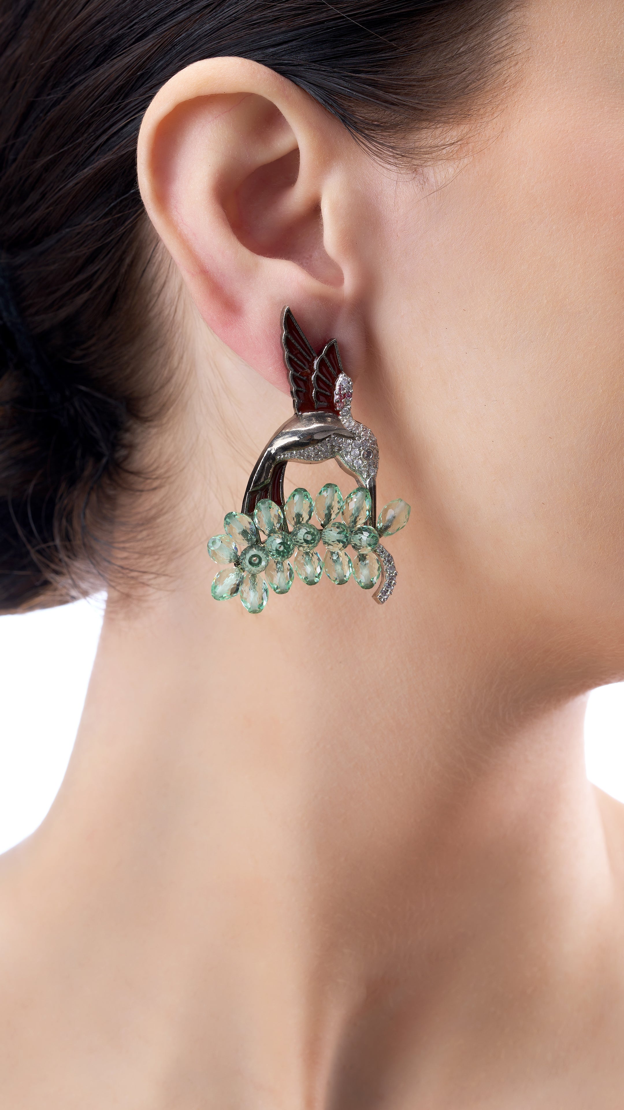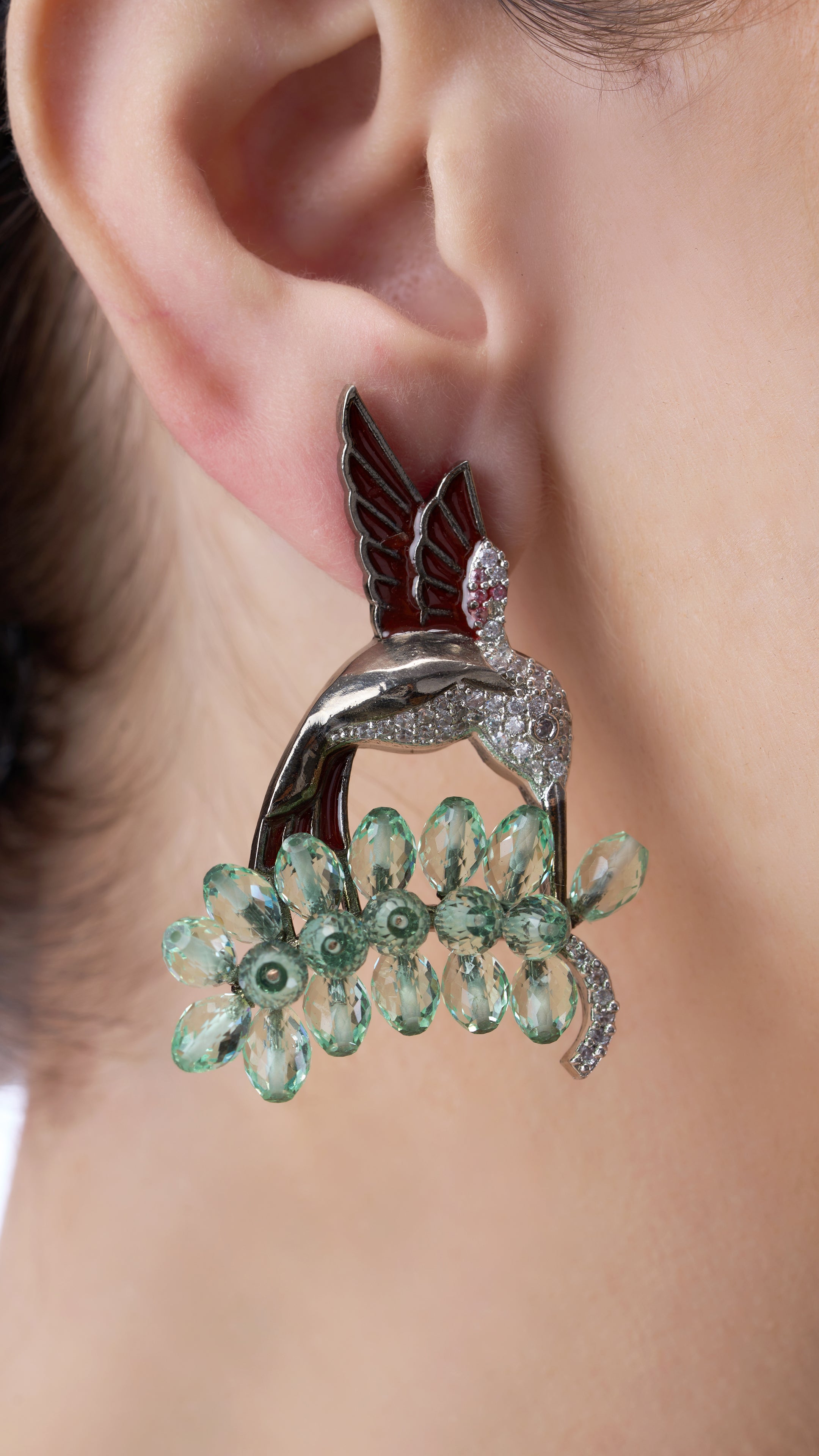 Bird Victorian earrings, adorned with semi-precious stones in lime green, offer a charming blend of nature-inspired design and elegant color.