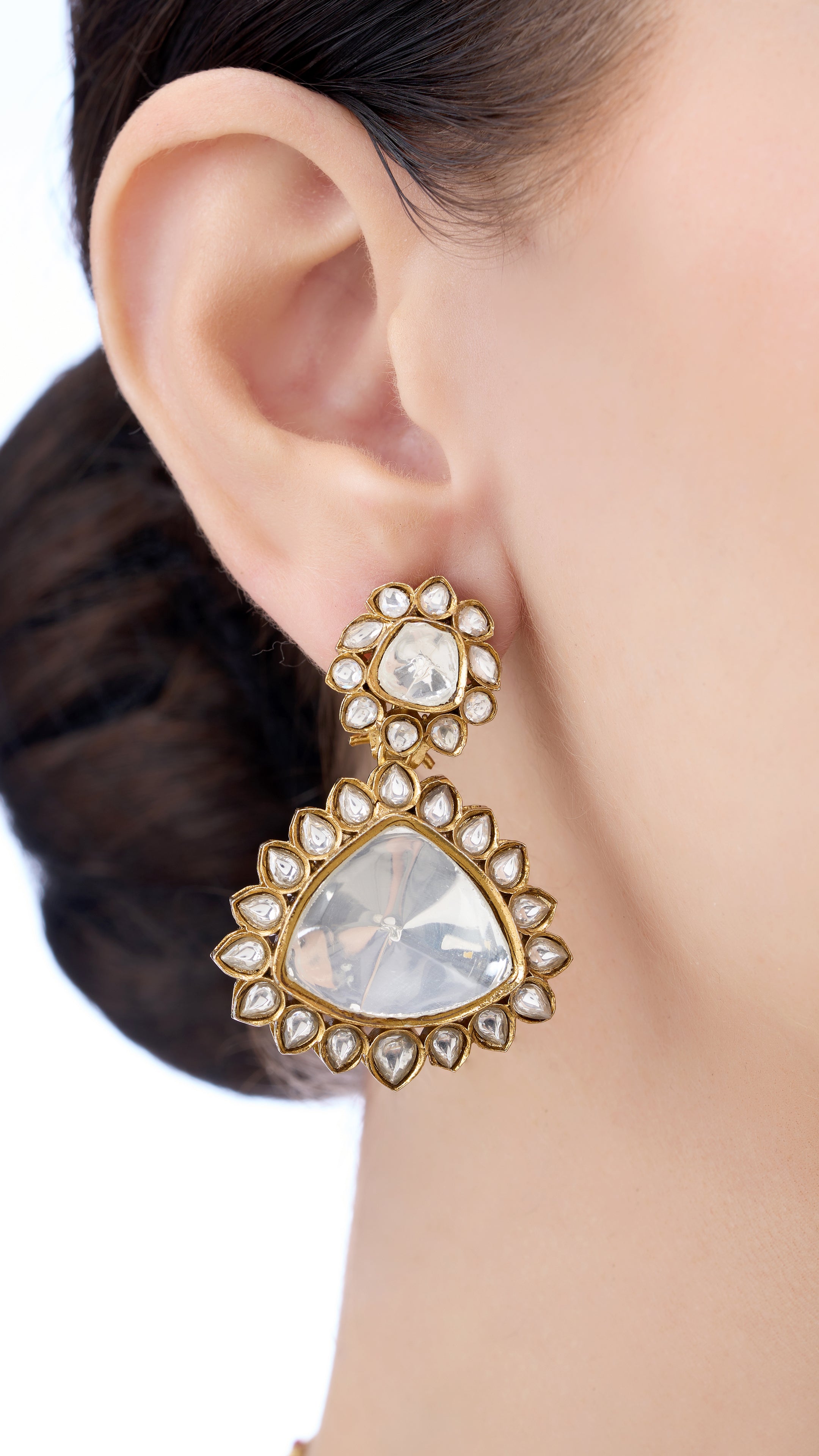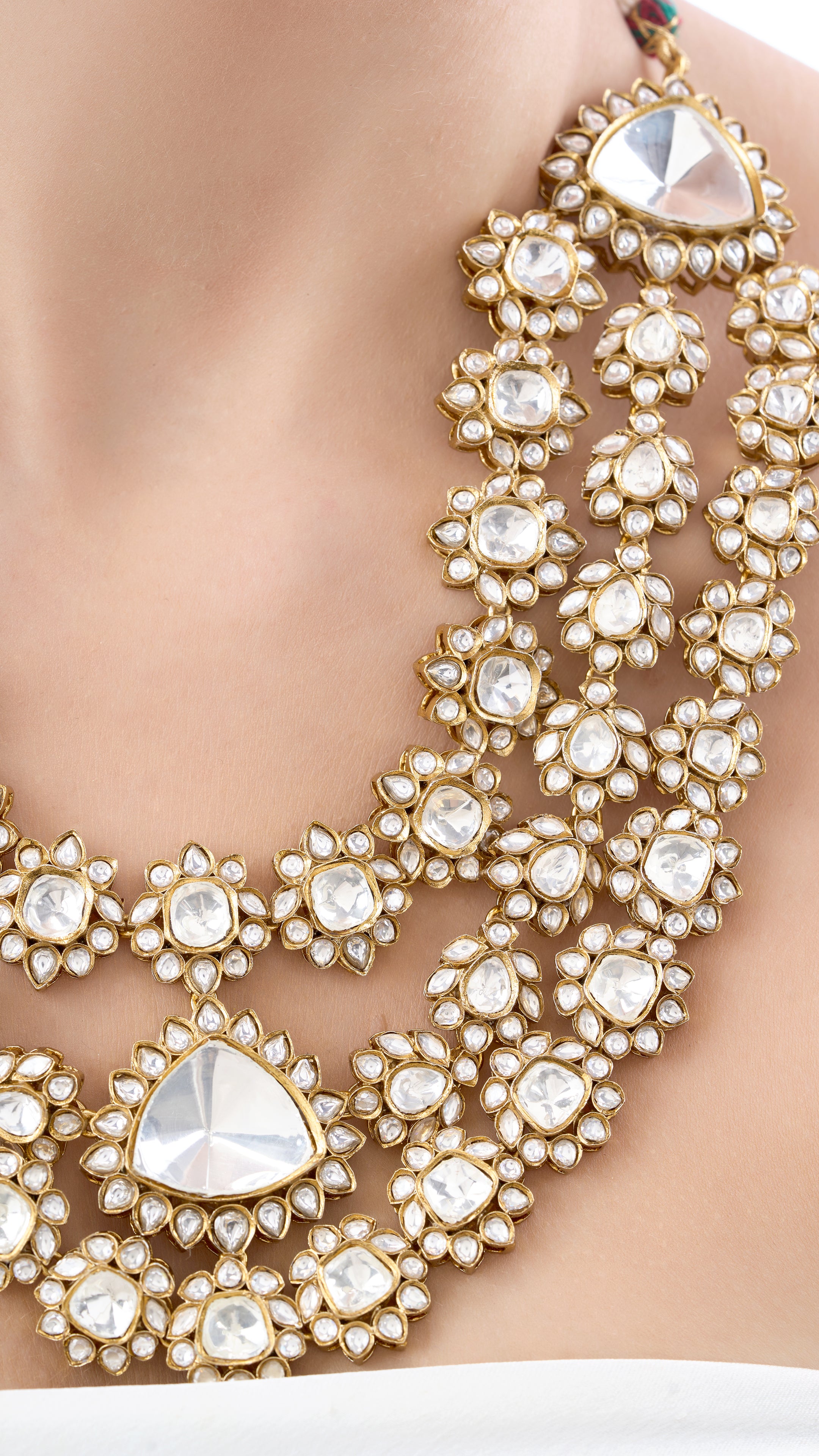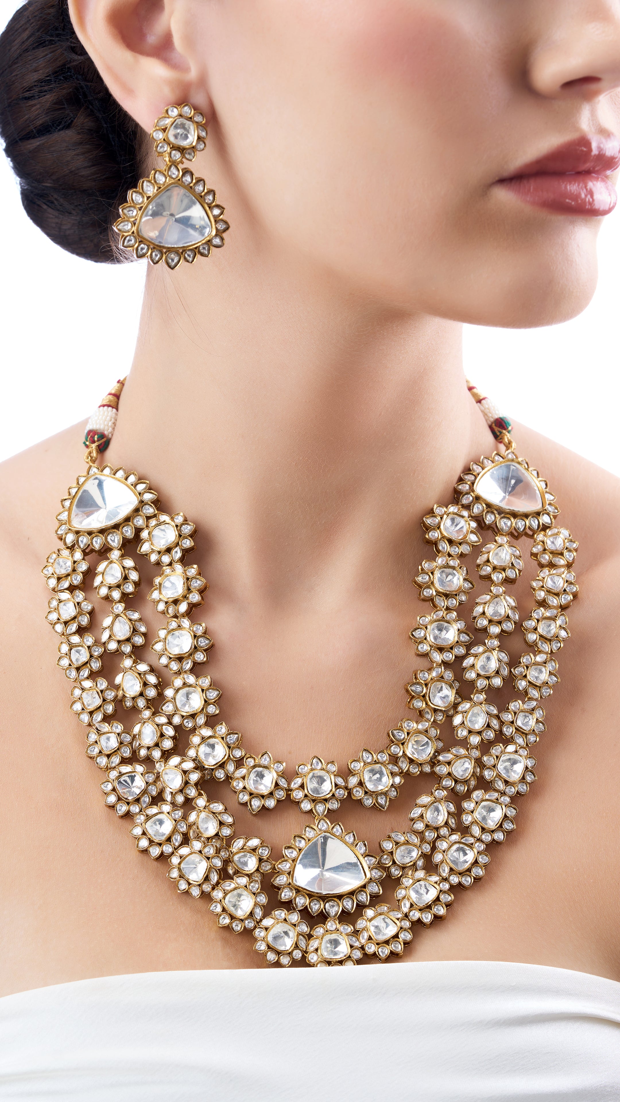 Triple-layer Polki necklace set showcases a rich design with layered stones, offering a bold and contemporary twist on traditional elegance. Ideal for making a statement at any celebration or event.
