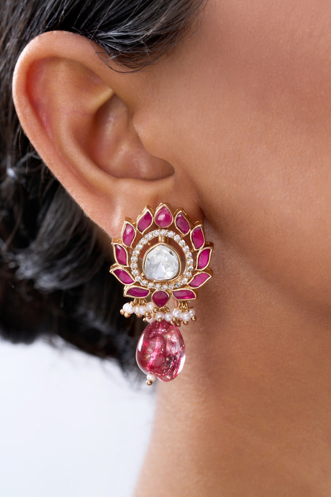 Introducing our Polki & Ruby set, the perfect mix of effortless chic and elegant design. The light weight materials make this set comfortable to wear, while the delicate rubies add a touch of sophistication. Upgrade your style with this must-have accessory.