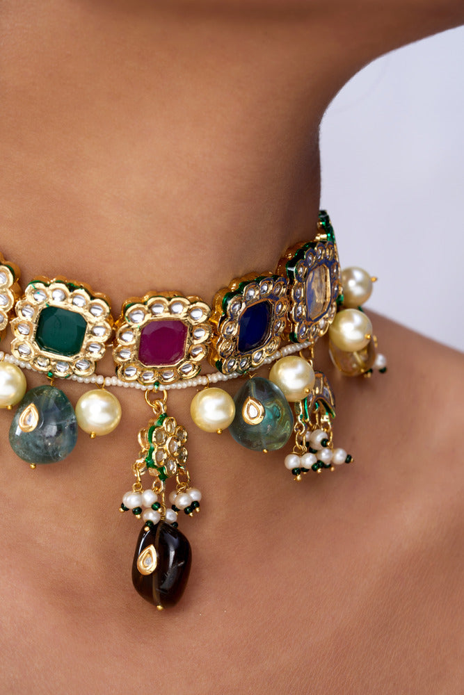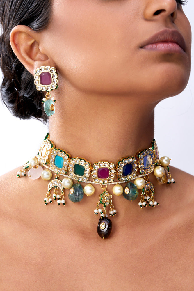 Introducing our Prismatica Kundan Ensemble, featuring a stunning array of Kundan and pure stones. Expertly crafted by industry professionals, this ensemble offers a visually appealing and elegant aesthetic, perfect for any occasion. Add a touch of sophistication and luxury to your wardrobe with Prismatica Kundan Ensemble.