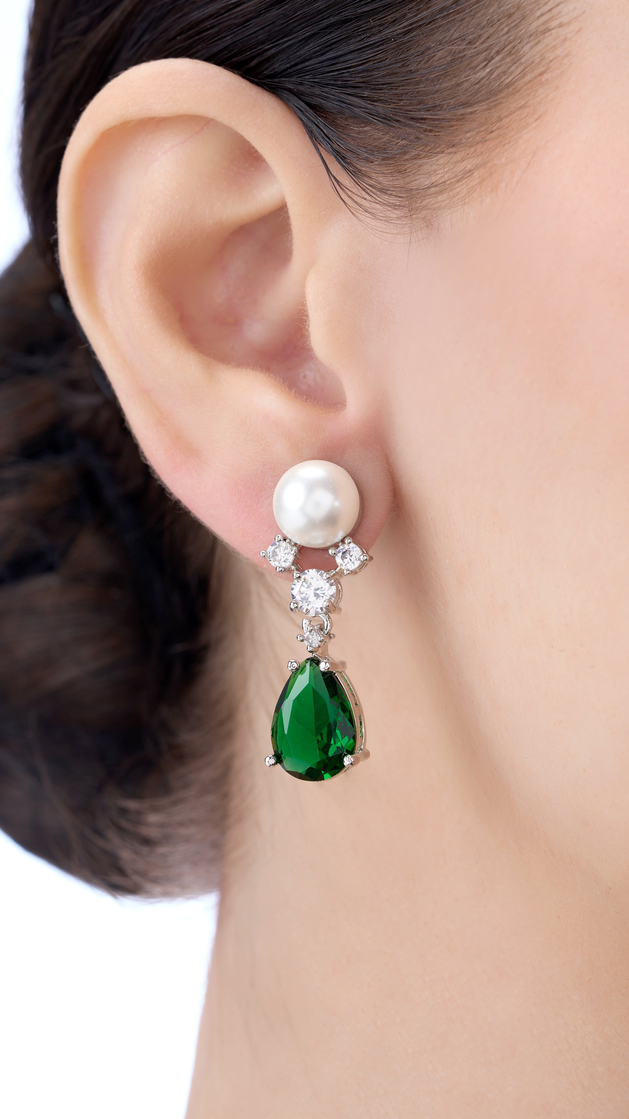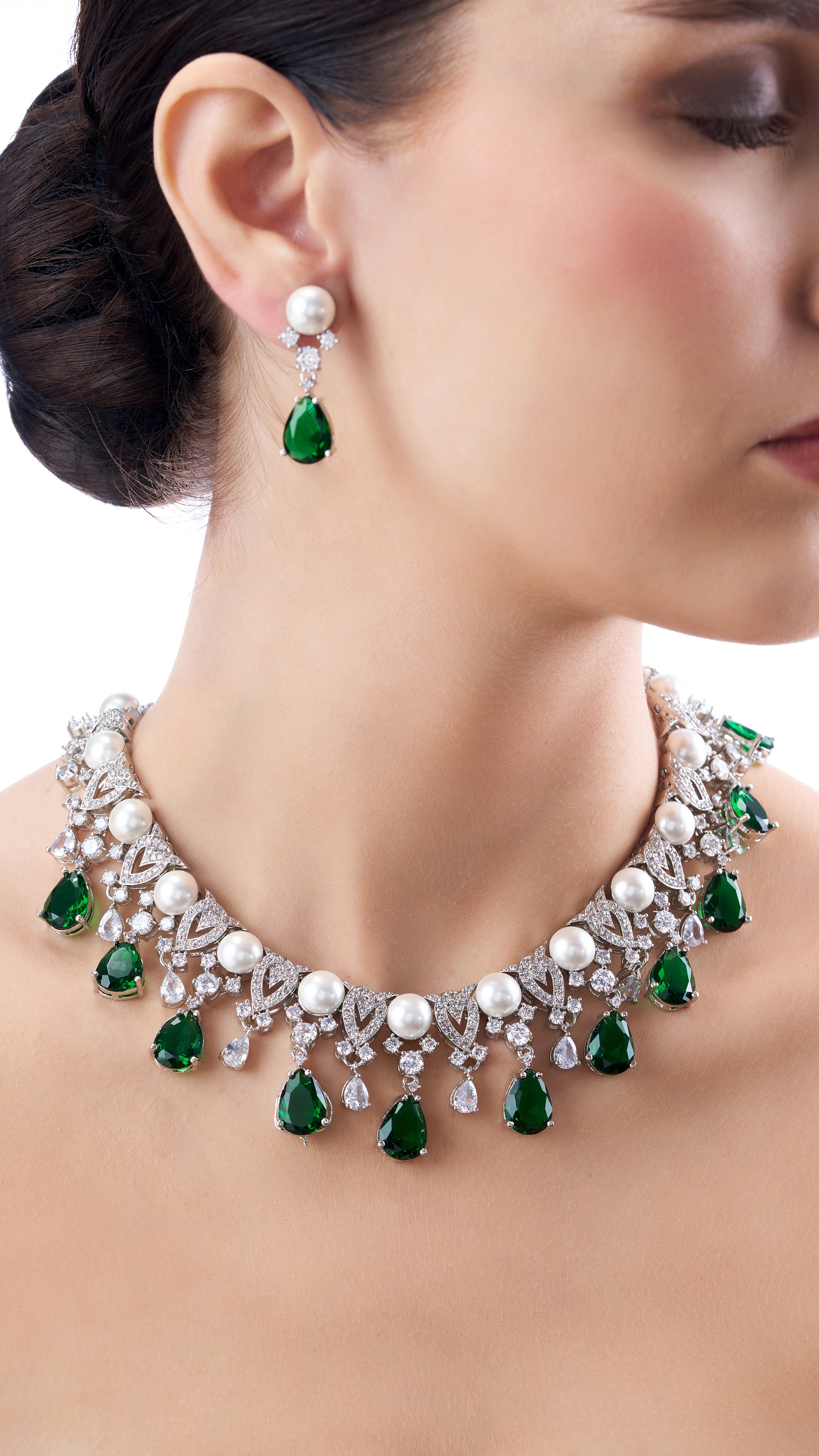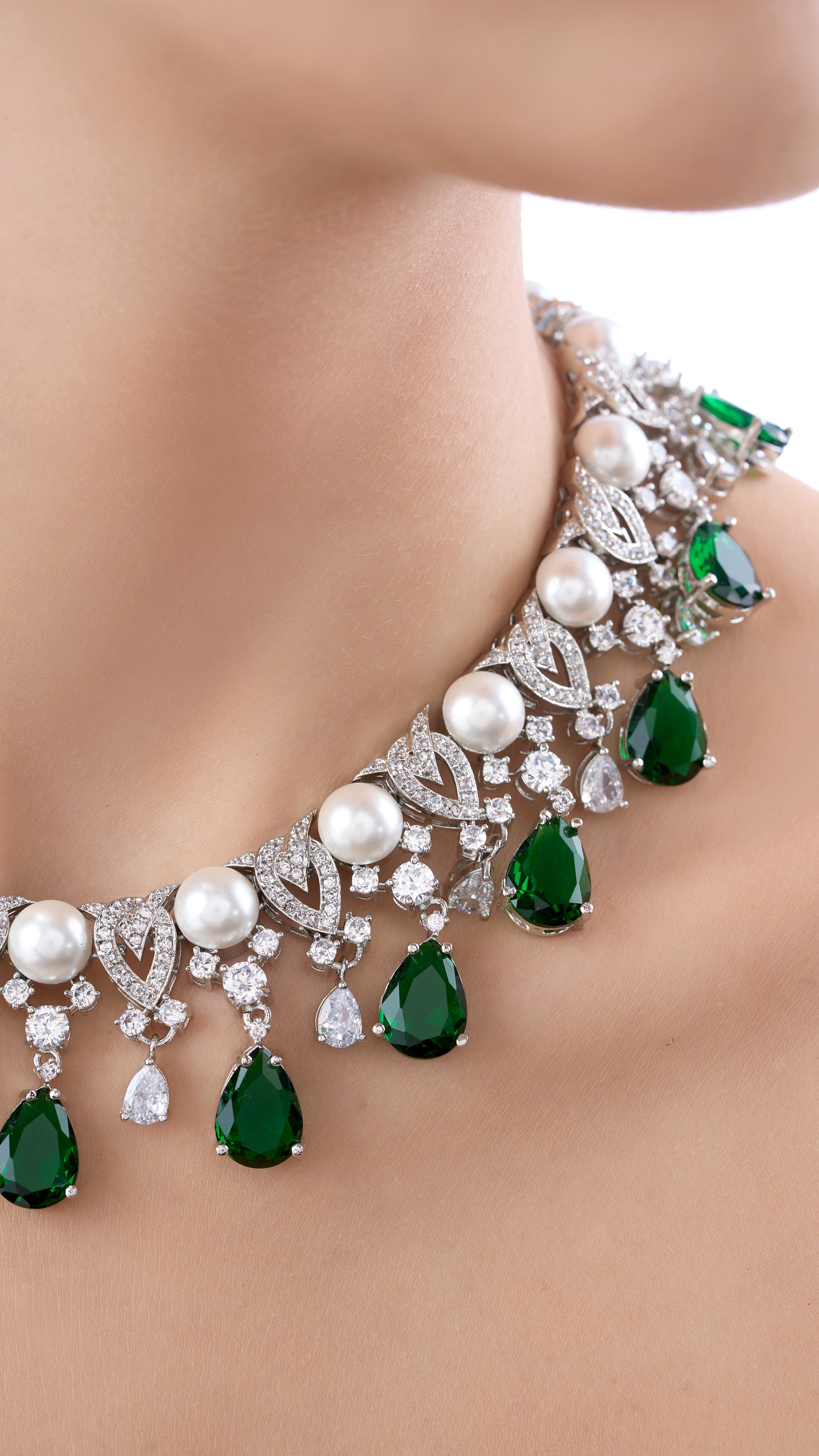 Elegant Moissanite necklace set featuring pure pearls and semi-precious green stones, blending sparkling brilliance with vibrant color for a sophisticated look.