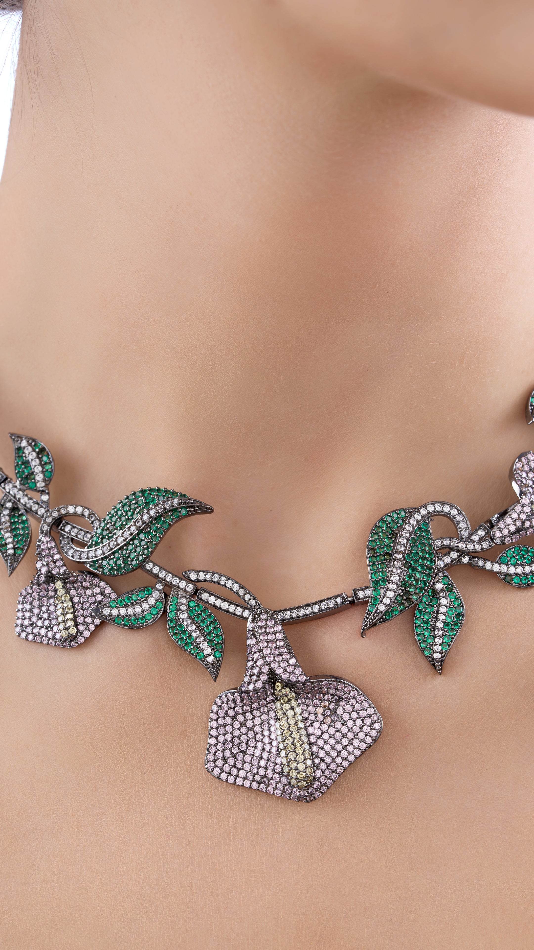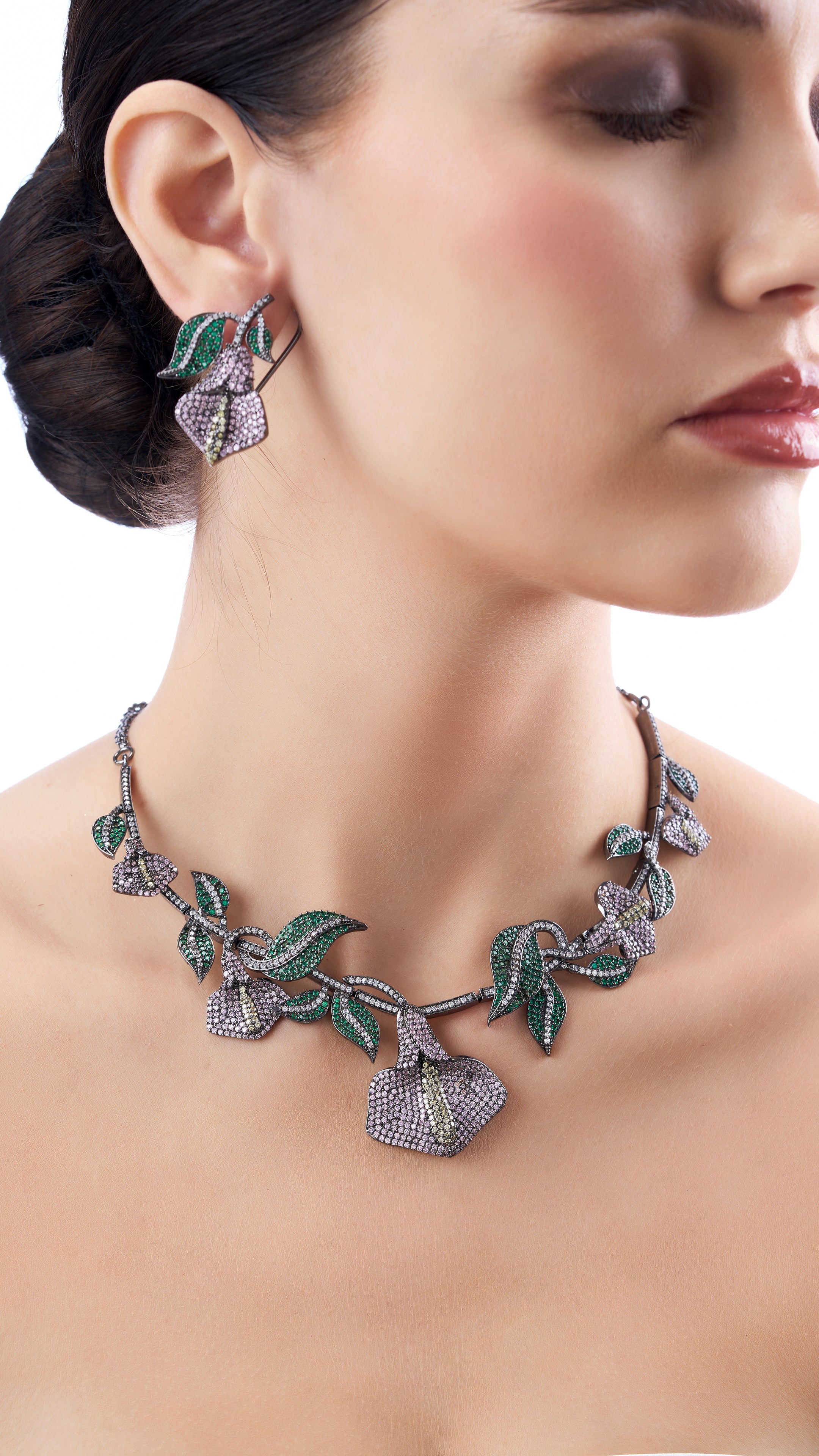 Mahima abstract crystal victoran flower leaf necklace set in purple and green