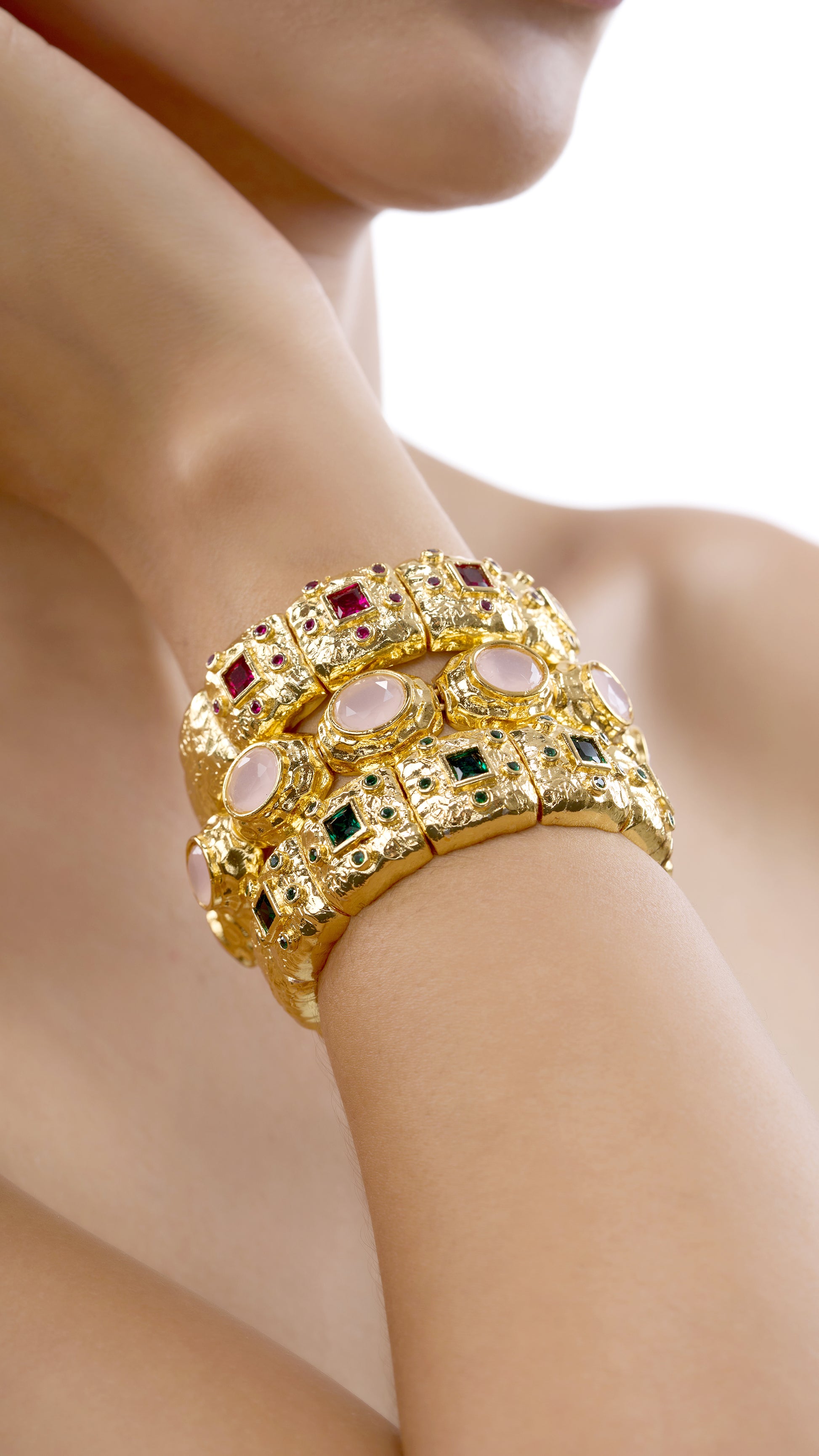 Stacking Gold Plated Bracelet with Semi-Precious Stones—a stylish and versatile accessory that adds a touch of elegance to any ensemble. This bracelet features a series of finely crafted gold-plated bands, each adorned with shimmering semi-precious stones. The stacking design allows for a customizable look, perfect for mixing and matching with other bracelets or wearing alone for a sophisticated statement. Ideal for both everyday wear and special occasions, this bracelet blends modern style with timeless charm.