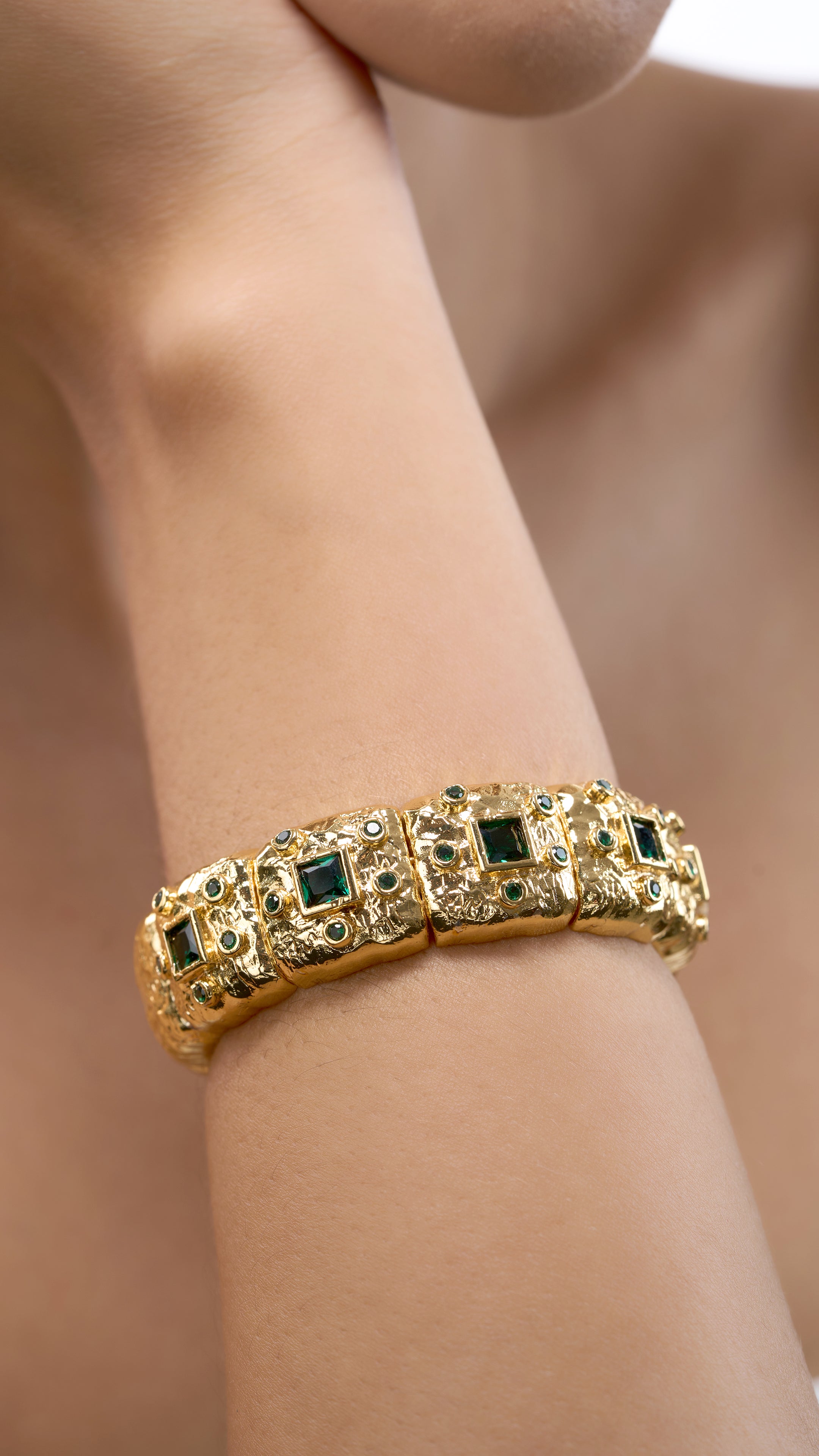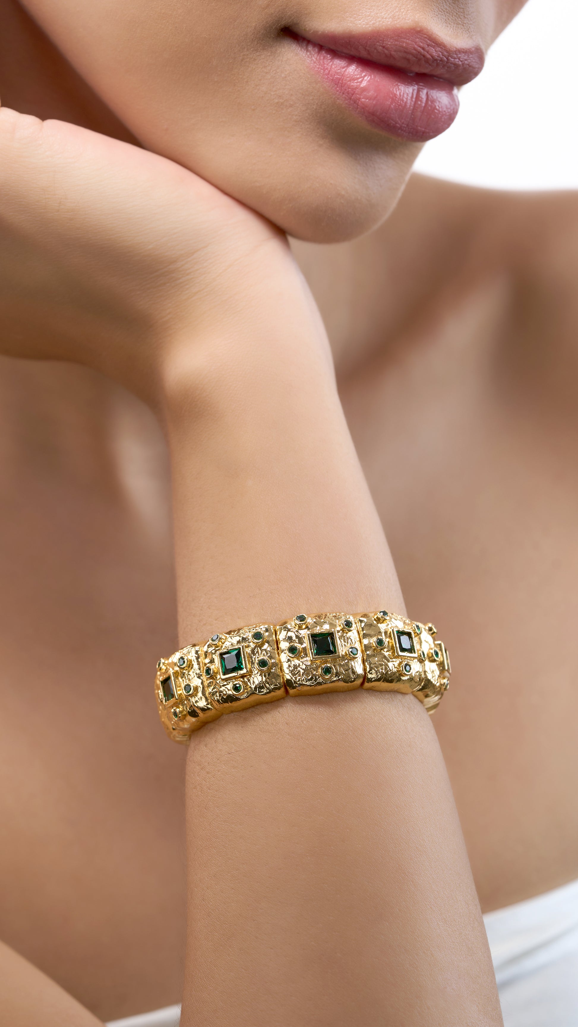 Stacking Gold Plated Bracelet with Semi-Precious Stones—a stylish and versatile accessory that adds a touch of elegance to any ensemble. This bracelet features a series of finely crafted gold-plated bands, each adorned with shimmering semi-precious stones. The stacking design allows for a customizable look, perfect for mixing and matching with other bracelets or wearing alone for a sophisticated statement. Ideal for both everyday wear and special occasions, this bracelet blends modern style with timeless charm.