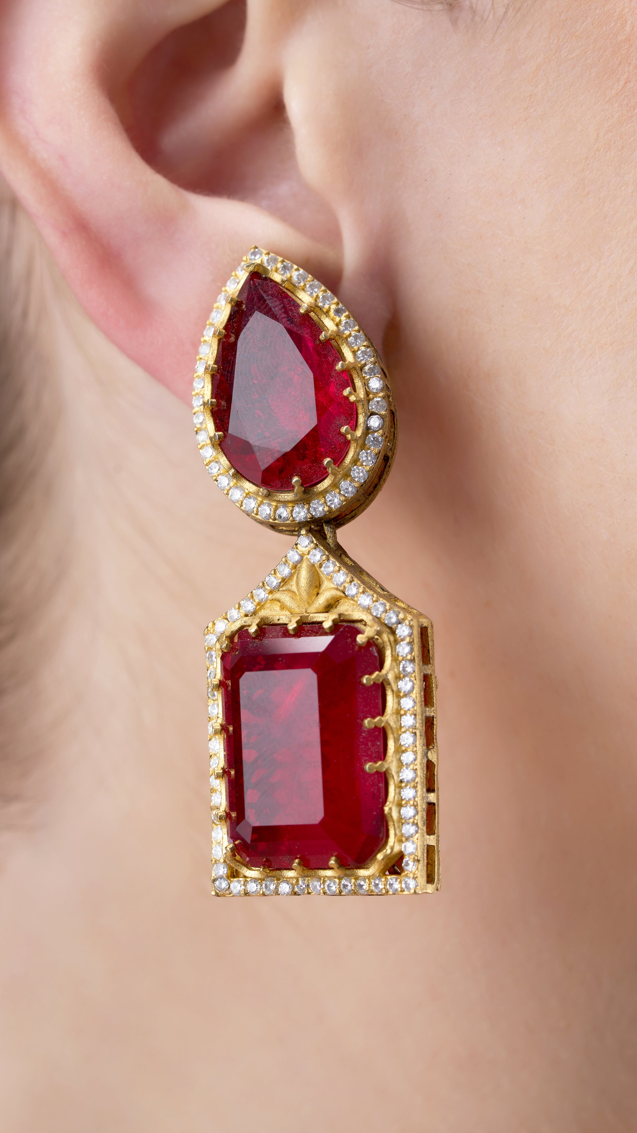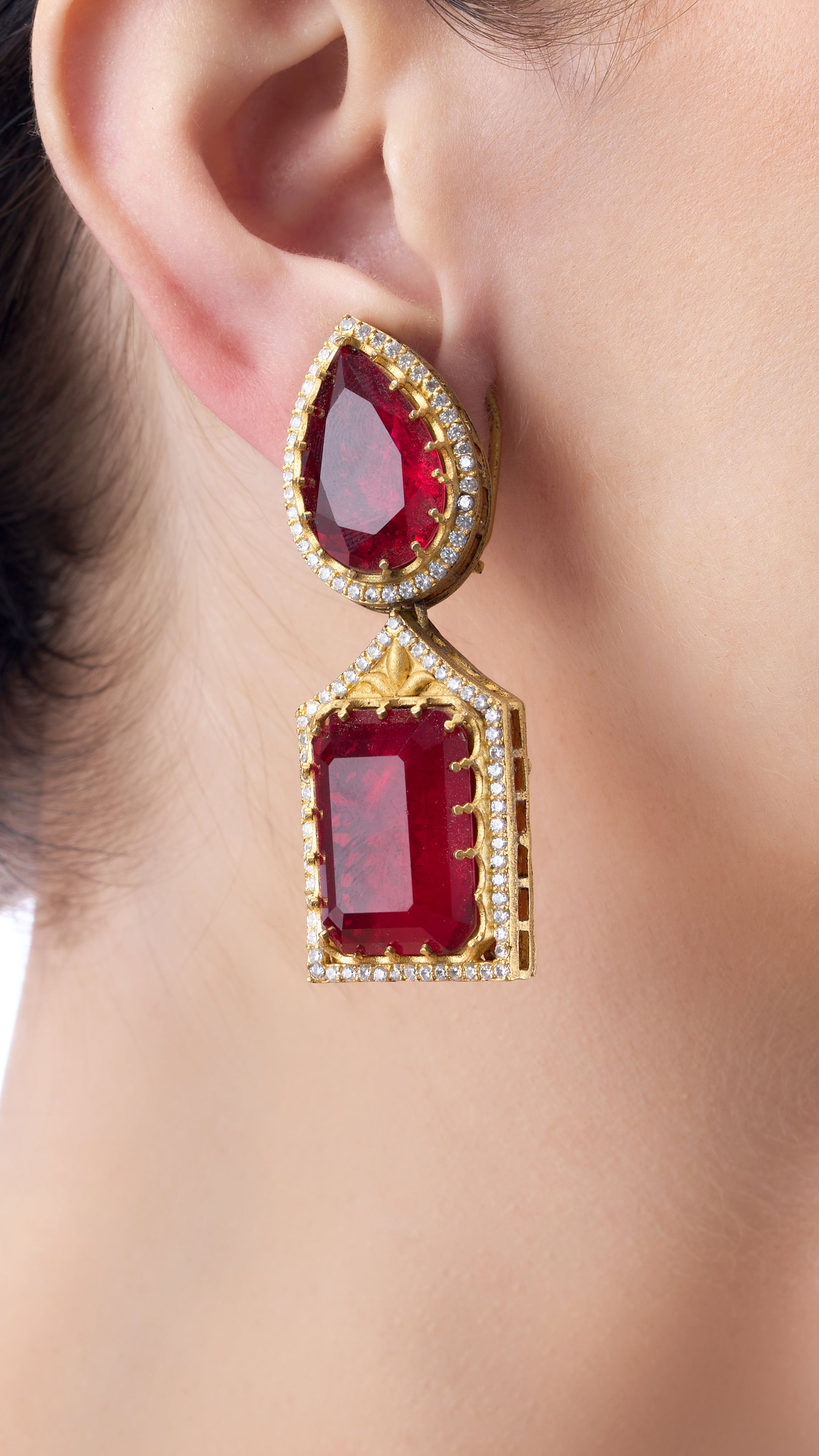 Double-stone earring set, featuring rich red semi-precious stones, exudes striking color and contemporary charm in every detail.
