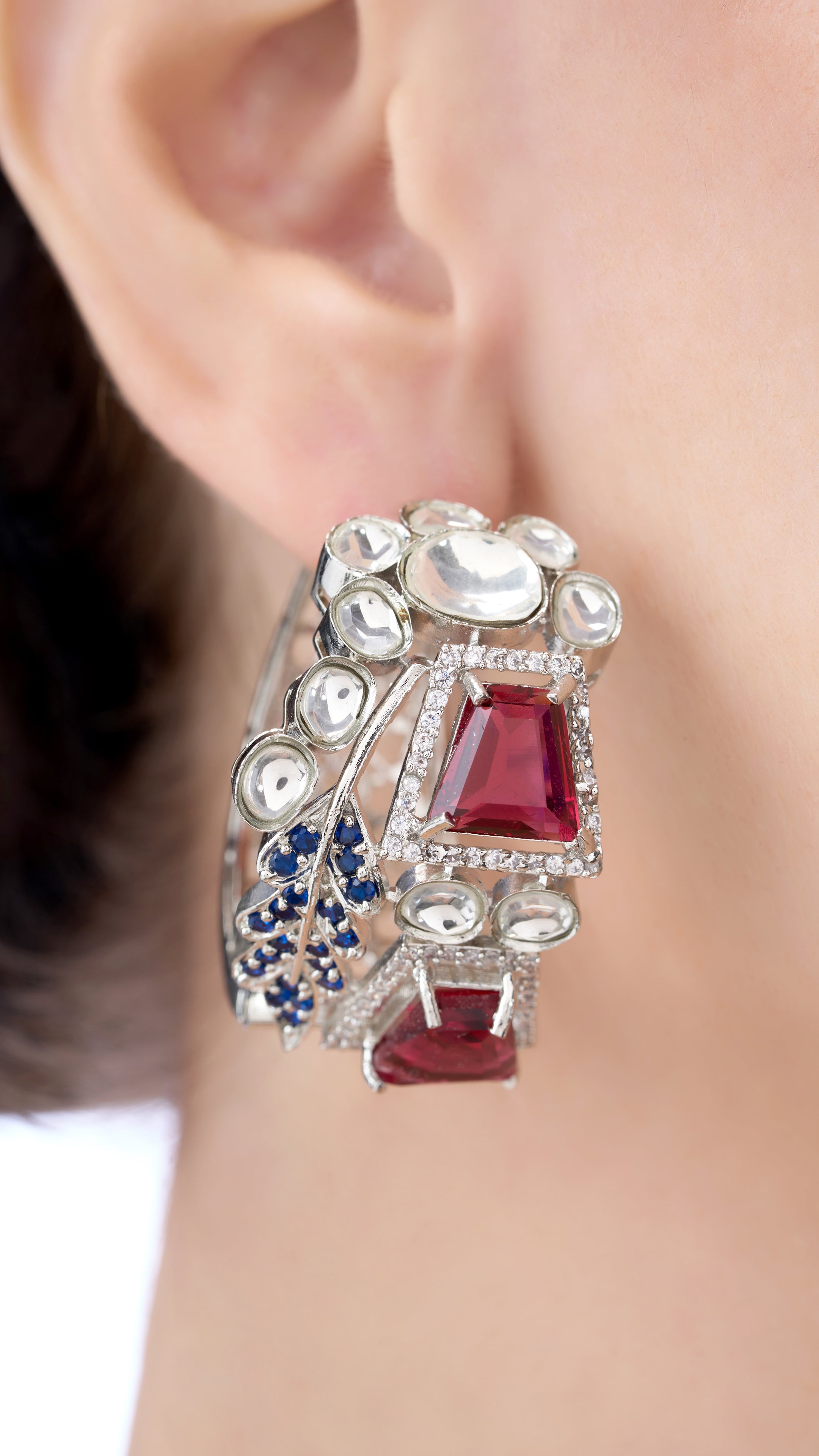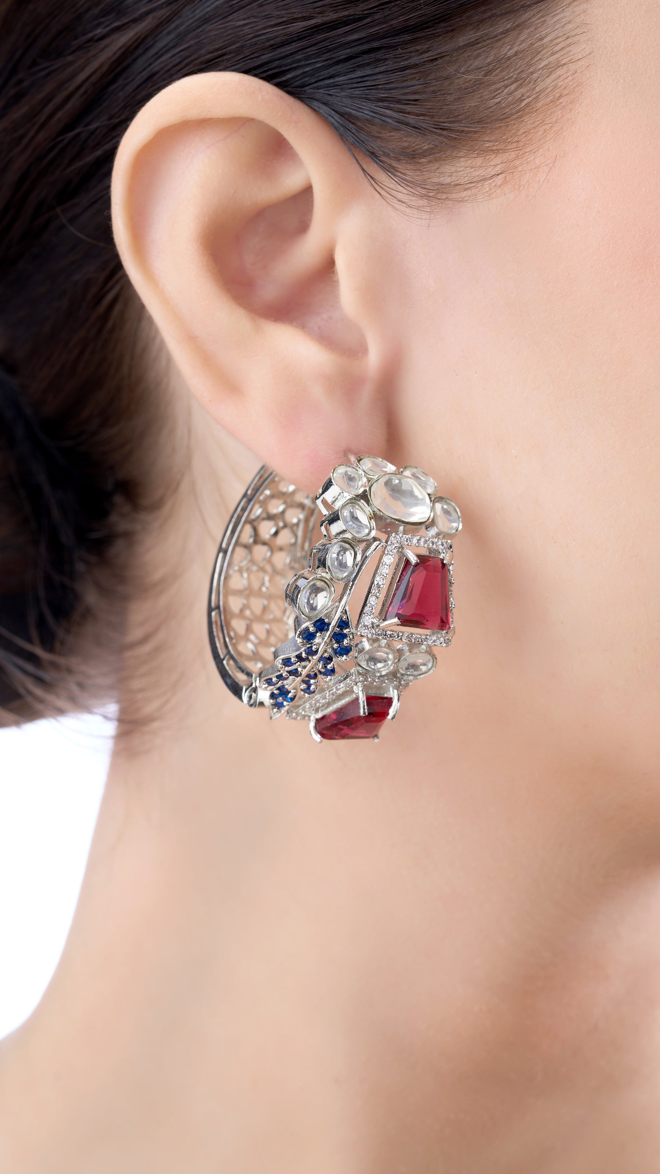 Abstract mesh Kundan hoops, embellished with red semi-precious stones, offer a bold fusion of modern design and traditional craftsmanship. A statement piece that adds vibrant color and sophistication to any look.