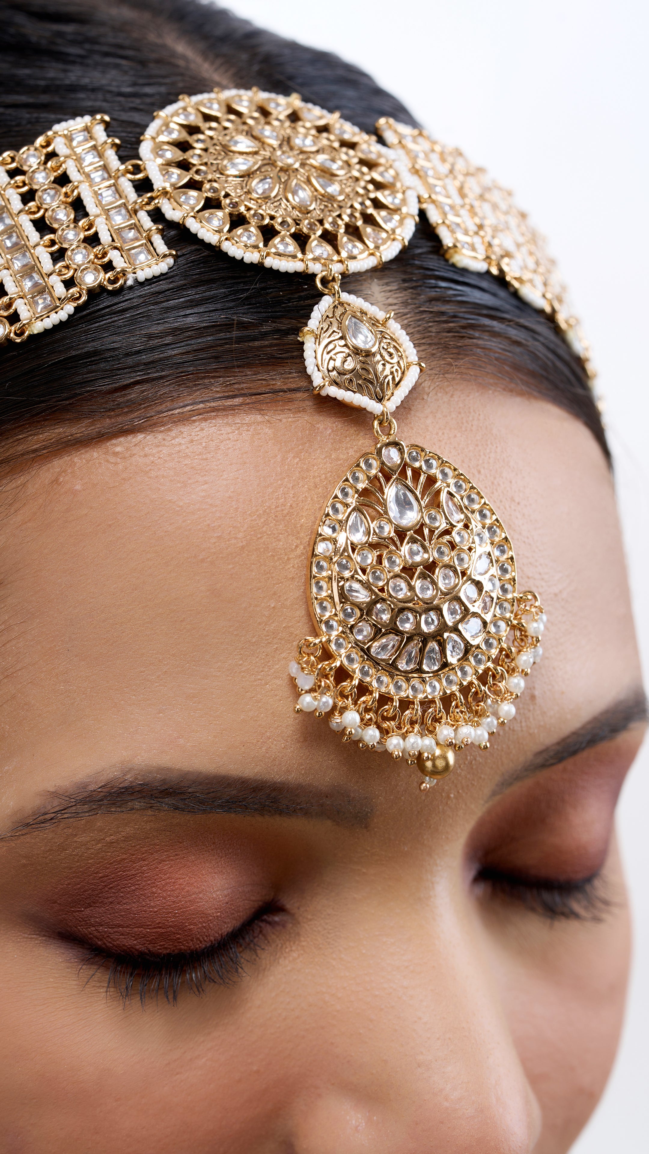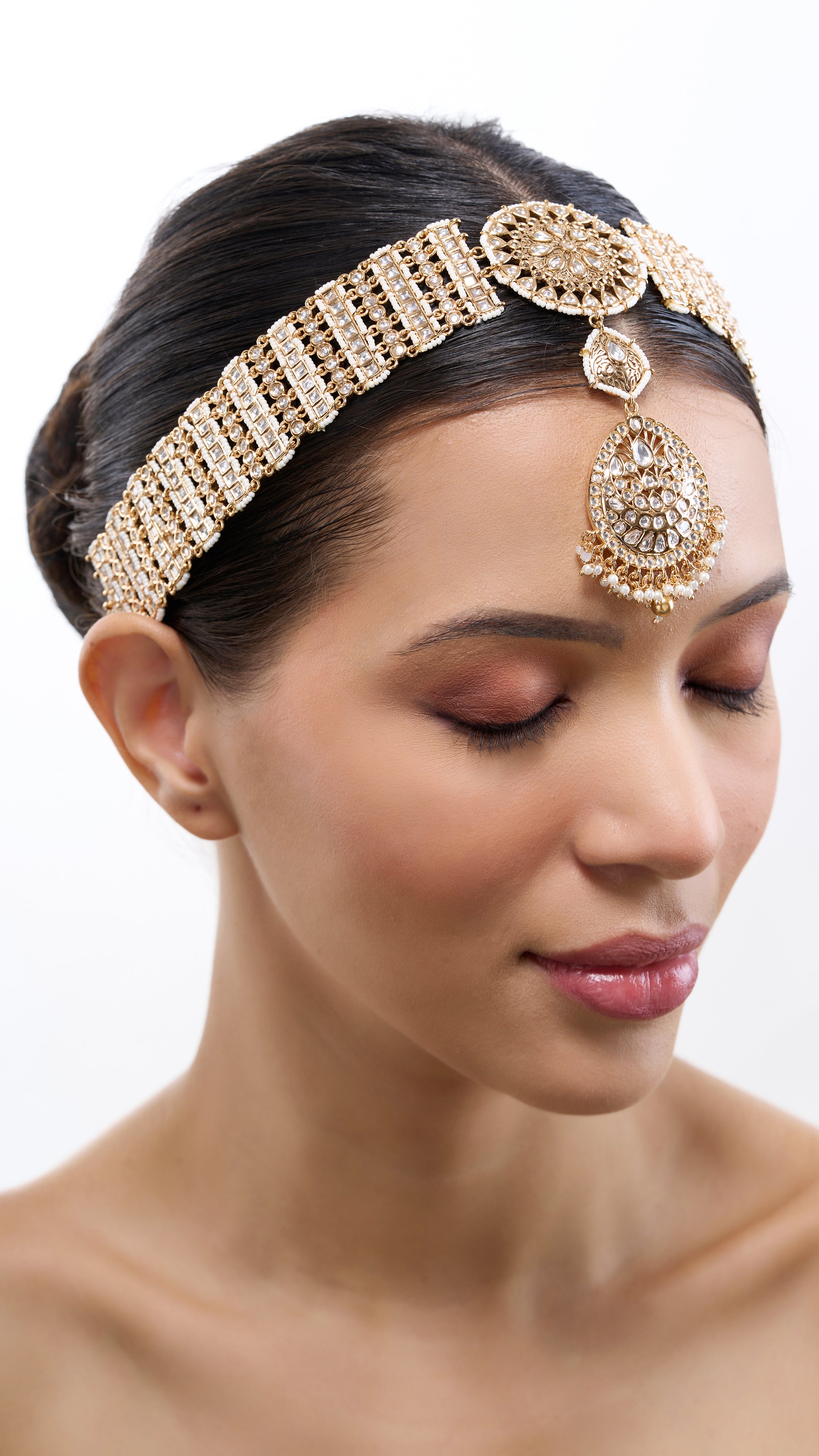 Gold Foil Kundan Matha Patti—a luxurious headband that blends traditional elegance with modern style. This exquisite piece features intricate Kundan detailing set against a radiant gold foil backdrop. The Matha Patti adds a regal touch to any outfit, making it perfect for special occasions or enhancing your bridal look. With its elegant design and timeless appeal, this headband is a stunning addition to any jewelry collection.