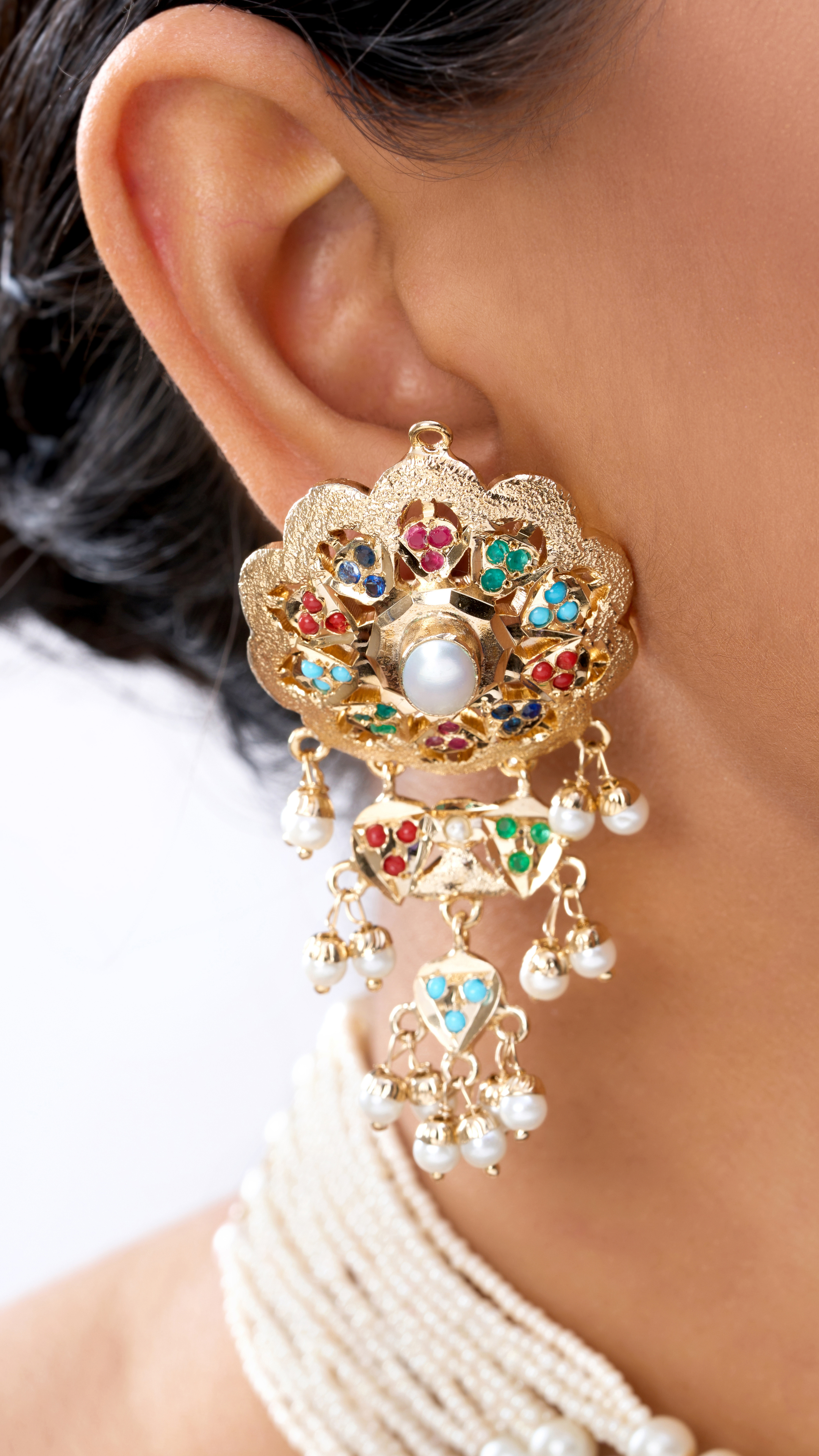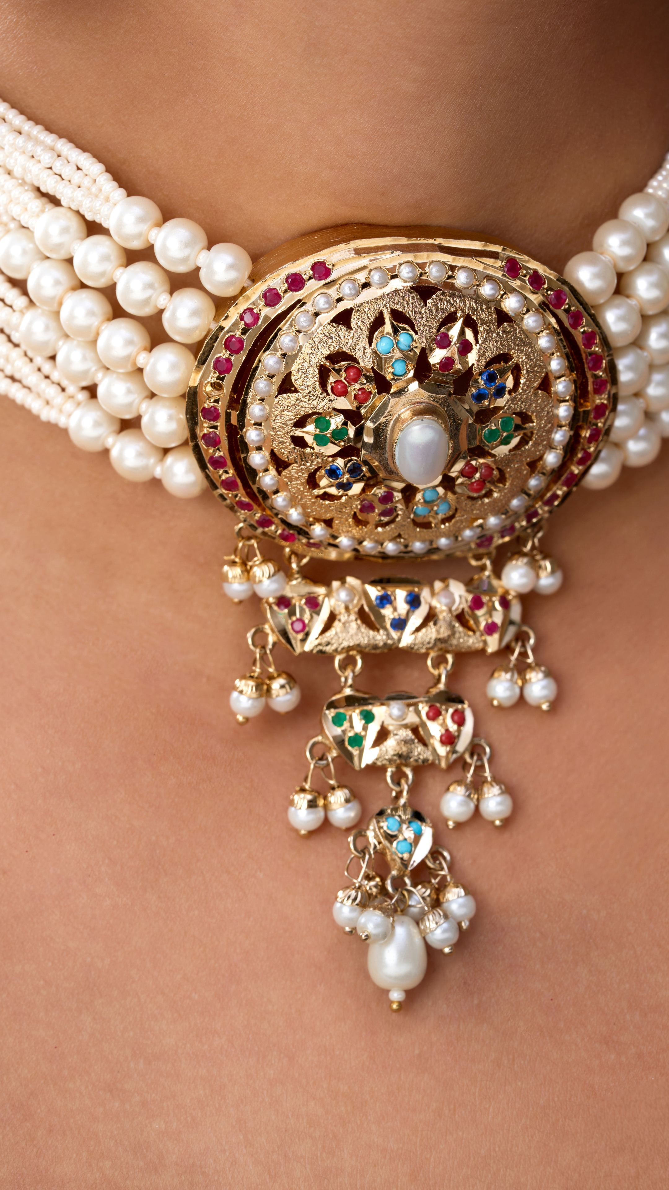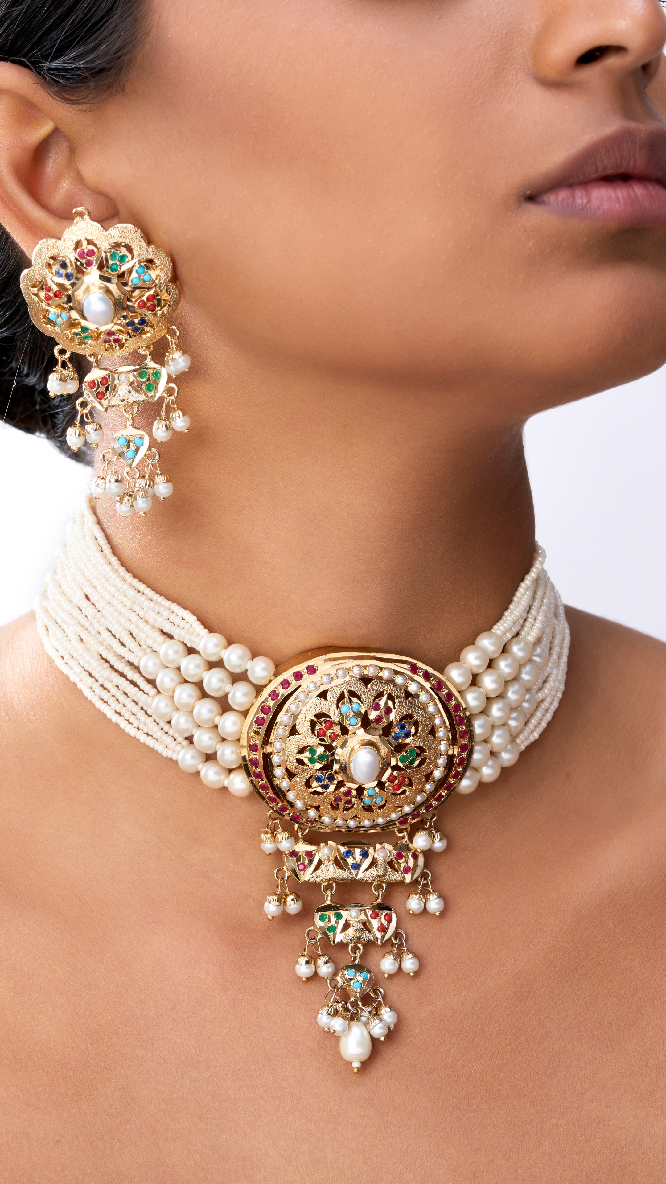 Elevate your style with the exquisite Multi Color Gold Foil Jadau Choker, a symbol of opulence and elegance. Meticulously crafted, this choker features a stunning array of multi-color gemstones set against lustrous gold foil, creating a mesmerizing tapestry of hues and textures. Each stone is carefully selected for its brilliance, reflecting the artisan's dedication to perfection. The intricate Jadau work adds a touch of traditional craftsmanship to the contemporary design, resulting in a timeless masterpiece. Adorn your neckline with this choker and bask in the allure of its rich colors and luxurious detailing, making a statement of sophistication and grace.