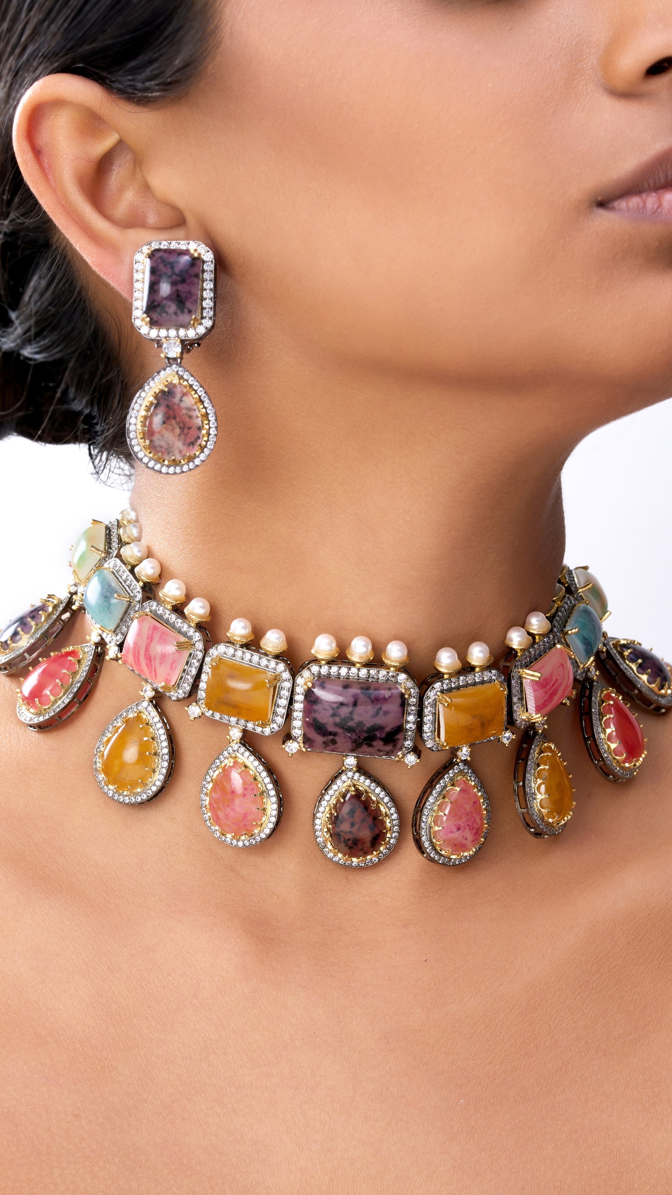 Indulge in the enchanting beauty of the Multi Color Pure Stone necklace, where each piece is a celebration of vibrant hues and natural elegance. Meticulously crafted, this creation showcases an array of pure stones in a dazzling spectrum of colors, each carefully selected for its radiance. The necklace exudes charm and sophistication, complemented by intricate detailing and exquisite craftsmanship. Elevate your style with the timeless elegance of the Multi Color Pure Stone necklace, a perfect embodiment of understated luxury and enduring beauty that adds a touch of glamour to any ensemble