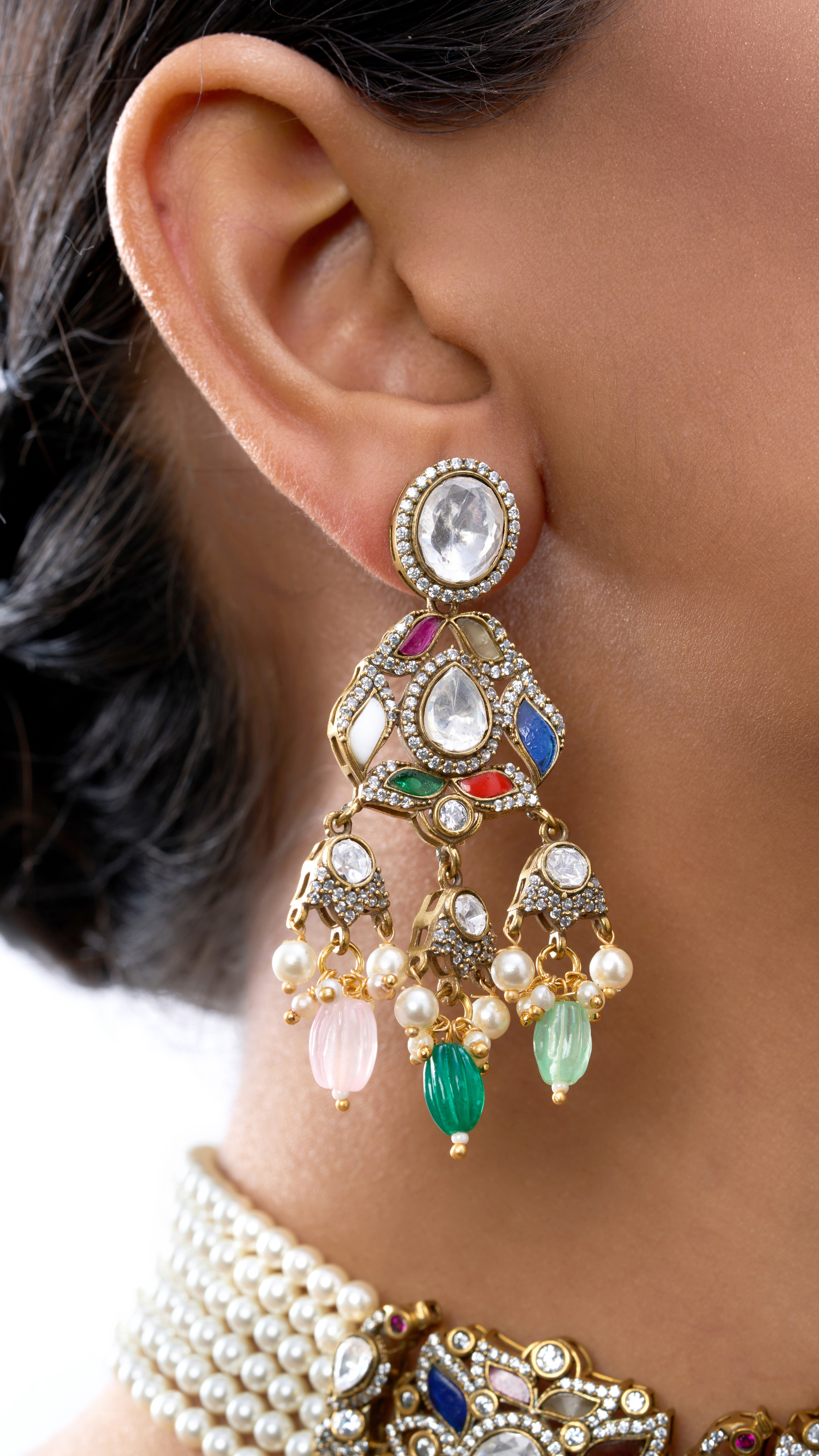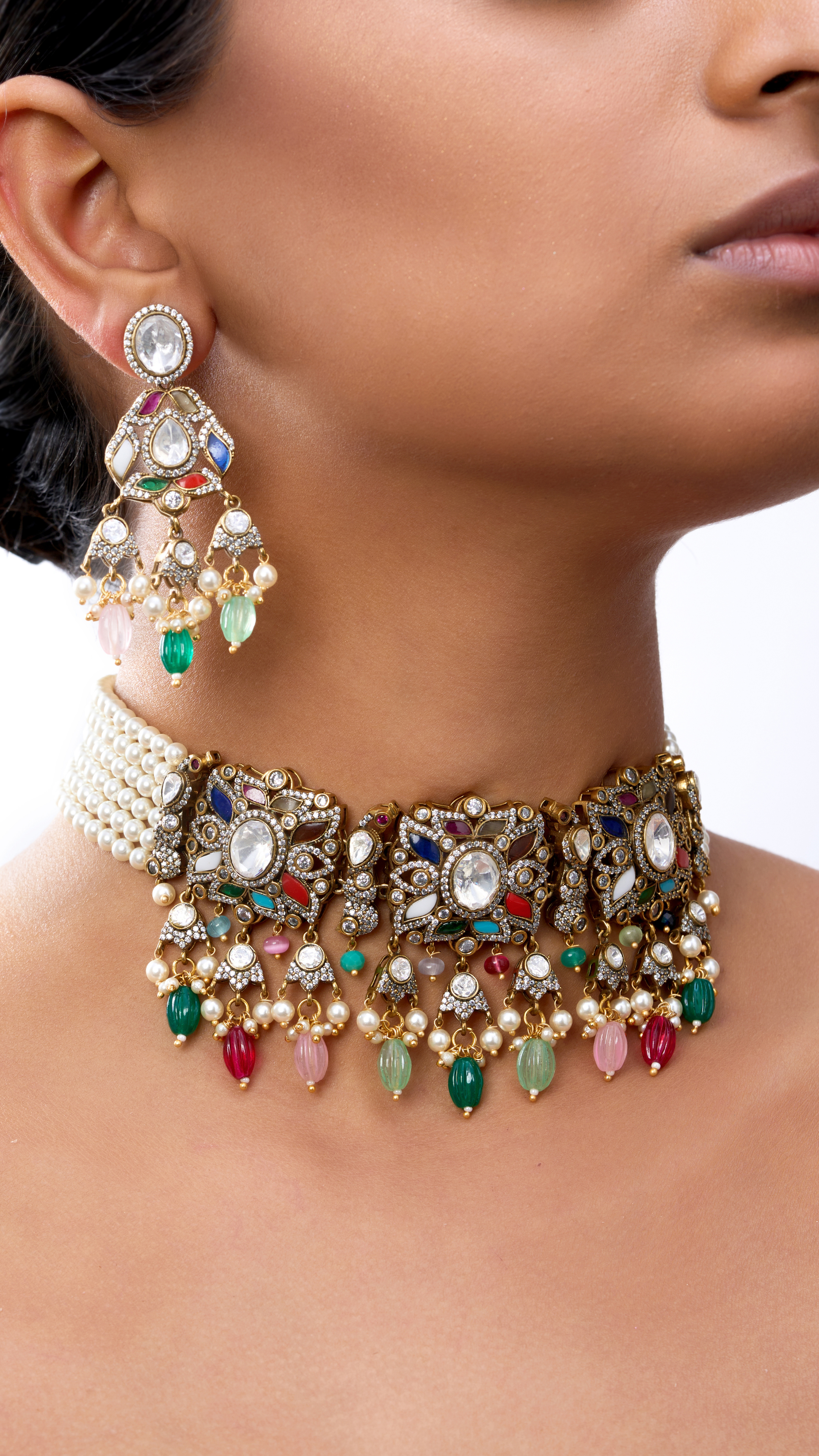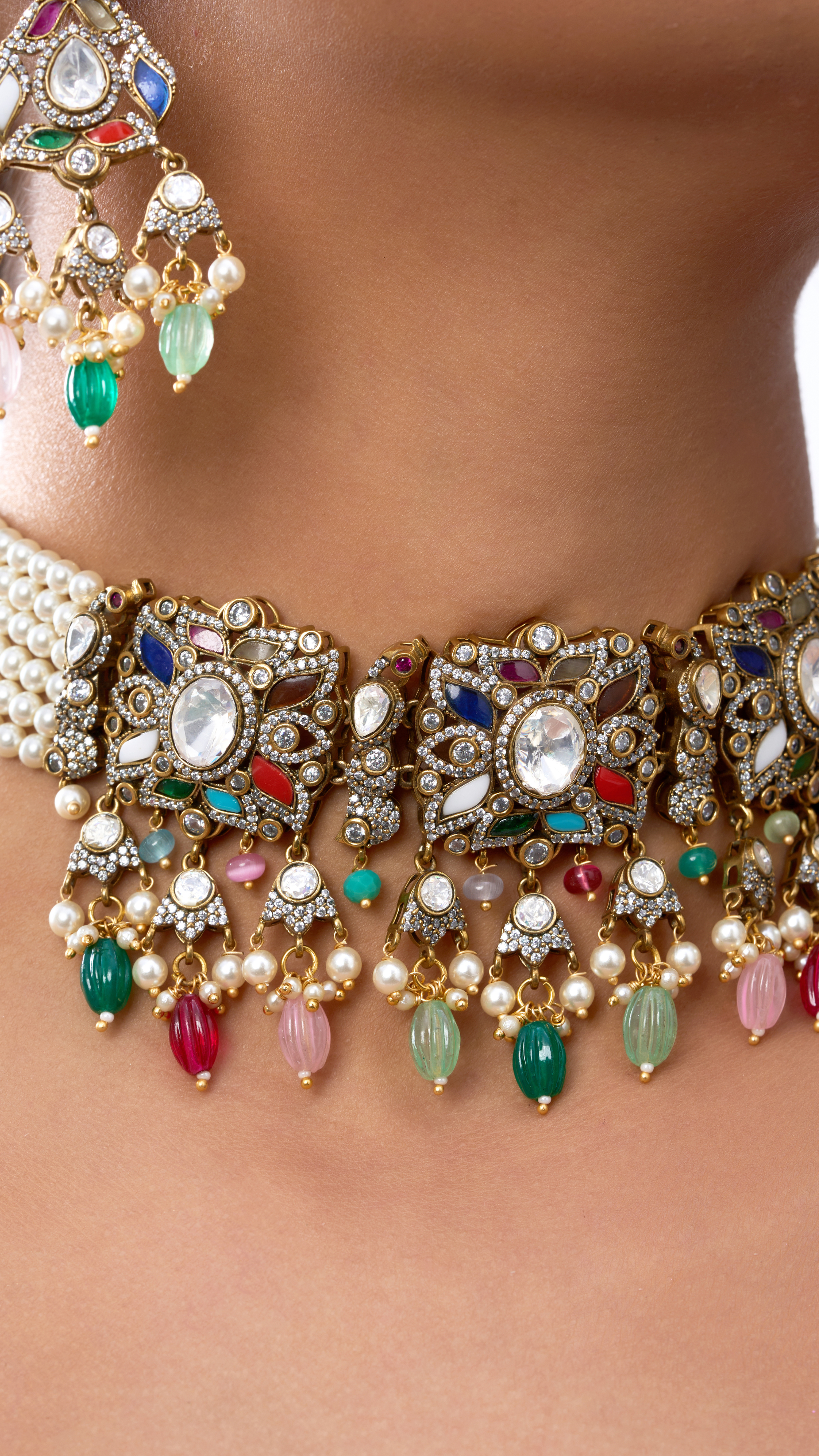 Introducing the Multi Color Victorian Polki Choker, a mesmerizing blend of vintage charm and contemporary flair. This exquisite piece showcases a stunning array of vibrant hues, meticulously crafted Polki stones set in a traditional Victorian design. Each stone captures the essence of opulence, radiating with brilliance and allure. Meticulous craftsmanship is evident in every detail, from the intricate setting to the elegant arrangement of colors. Whether worn for a formal affair or to add a touch of sophistication to everyday attire, this choker is sure to make a statement. Elevate your ensemble with the Multi Color Victorian Polki Choker and embrace timeless elegance.