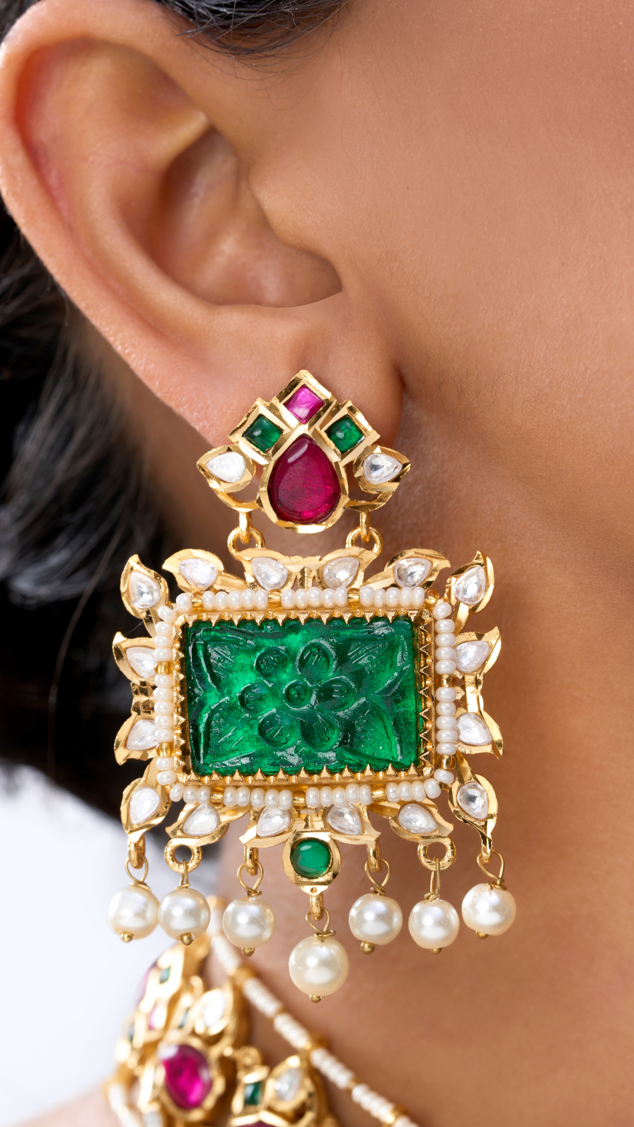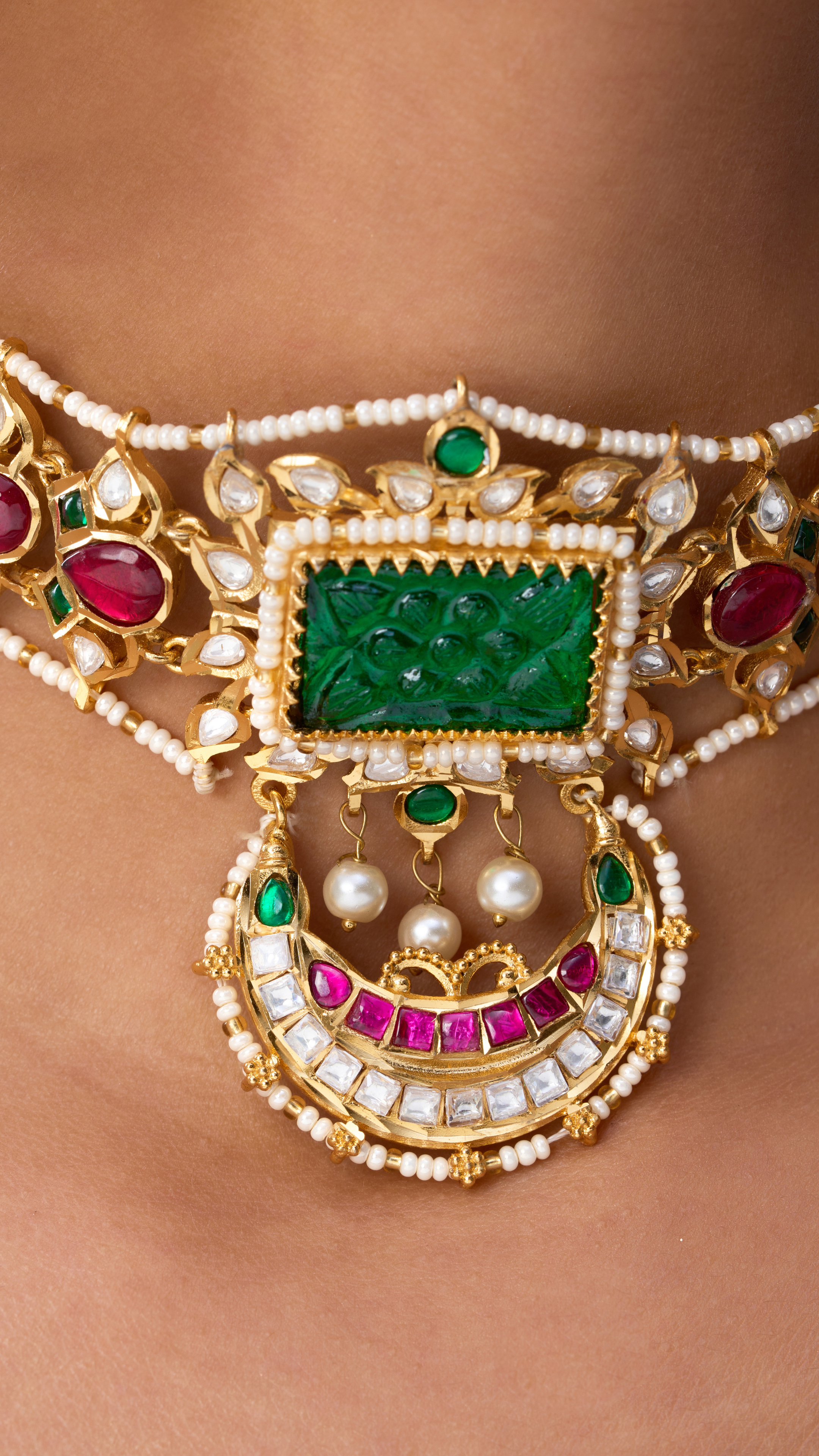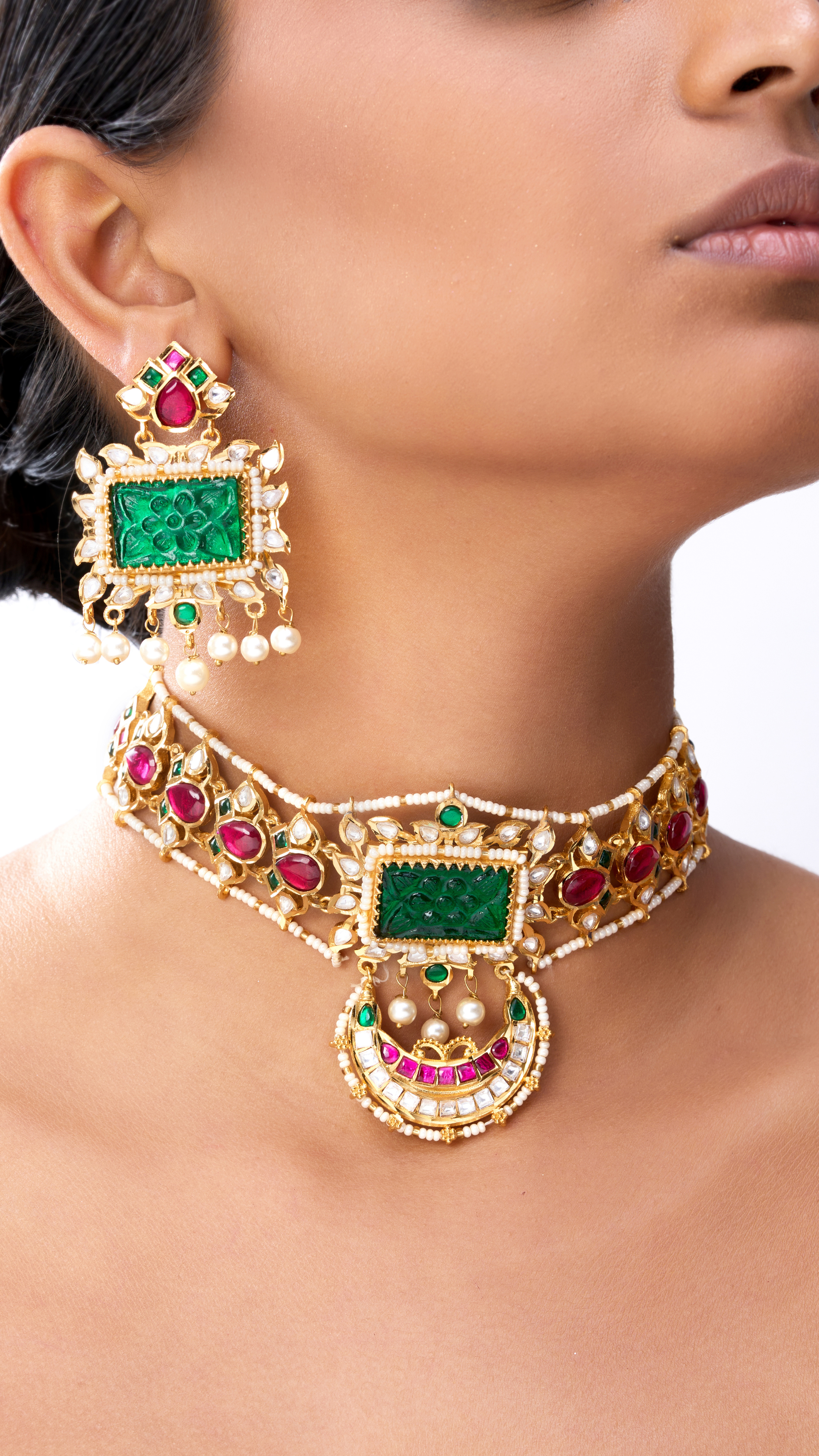 Elevate your elegance with the Polki Choker adorned with Monalisa Stone, a captivating blend of tradition and sophistication. This exquisite piece features lustrous Polki set against the enchanting backdrop of Monalisa Stone, known for its unique marbling and depth of color. Meticulously crafted, the choker exudes opulence and charm, drawing attention with its intricate detailing and timeless design. Whether gracing a formal occasion or enhancing everyday attire, it adds a touch of regal allure to any ensemble. Embrace the allure of heritage and luxury with the Polki Choker on Monalisa Stone, a timeless statement of refined beauty.