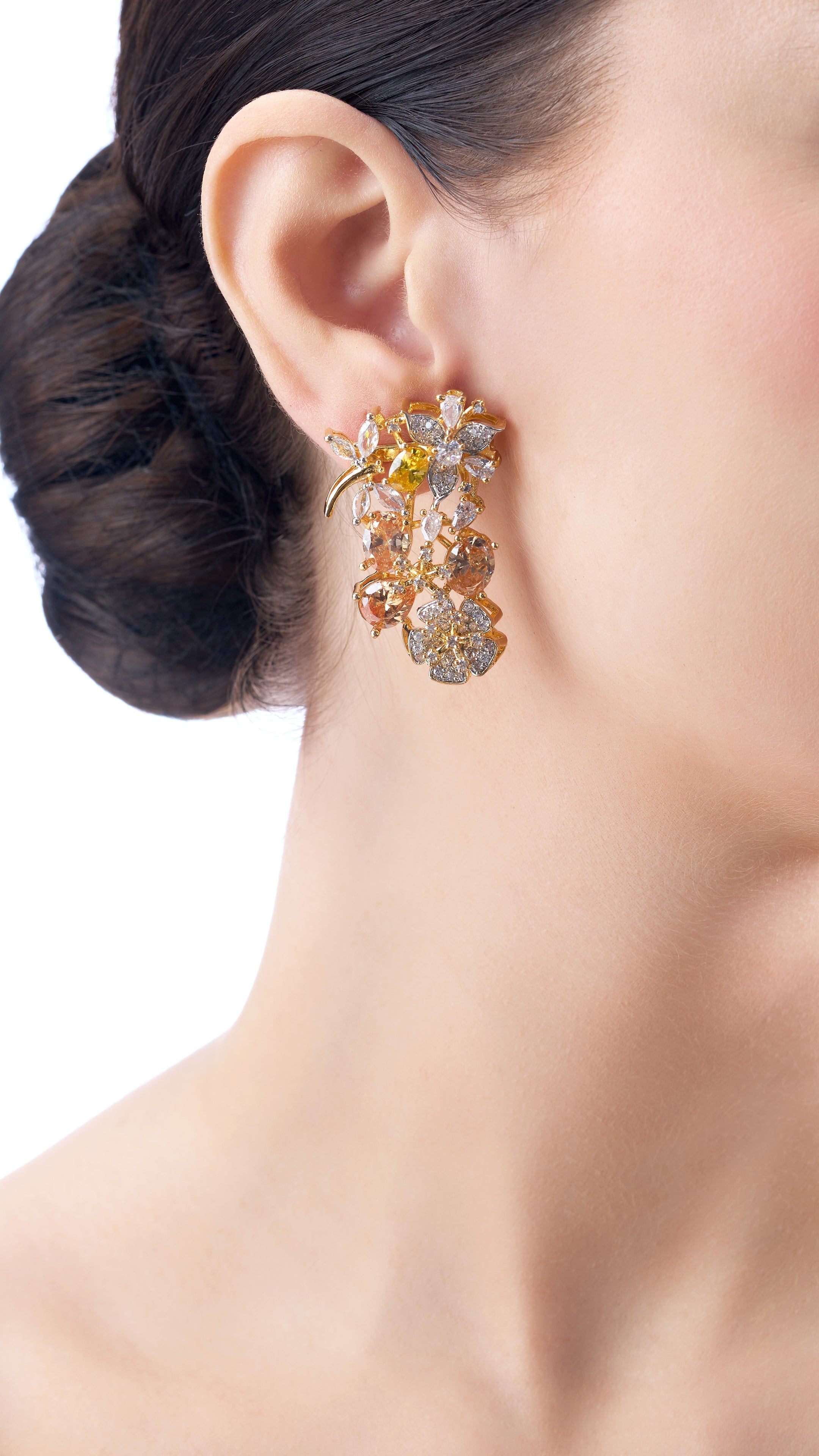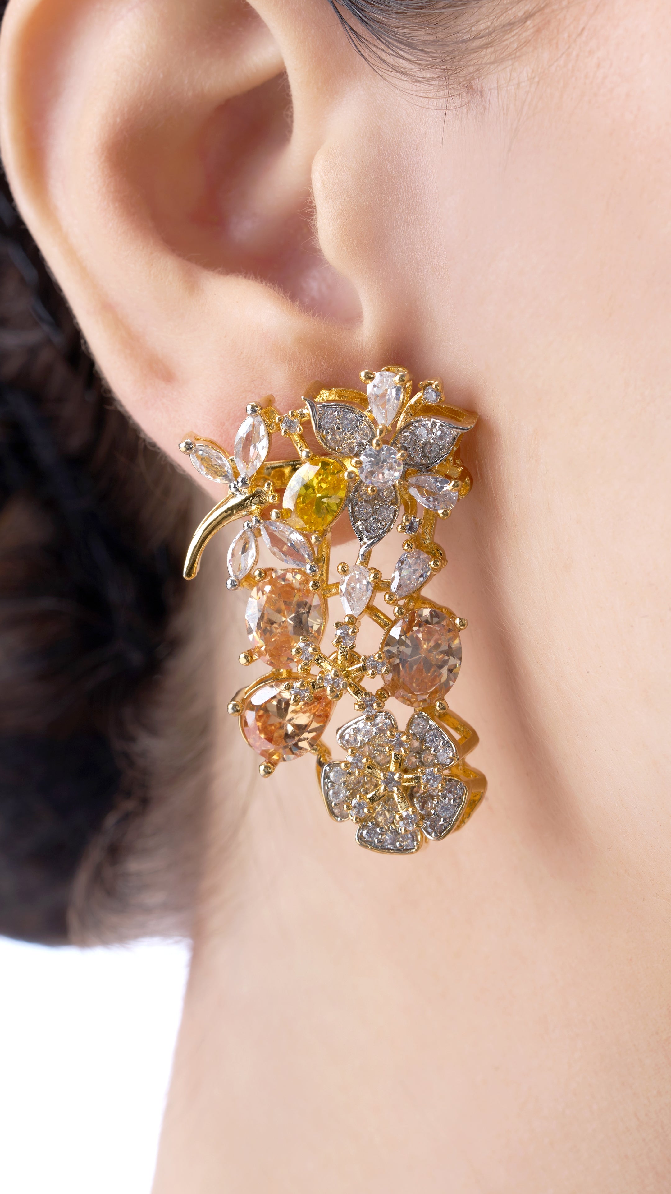 Elegant flower earrings featuring citrine semi-precious stones and Moissanites, combining vibrant hues and sparkling brilliance for a stunning look.