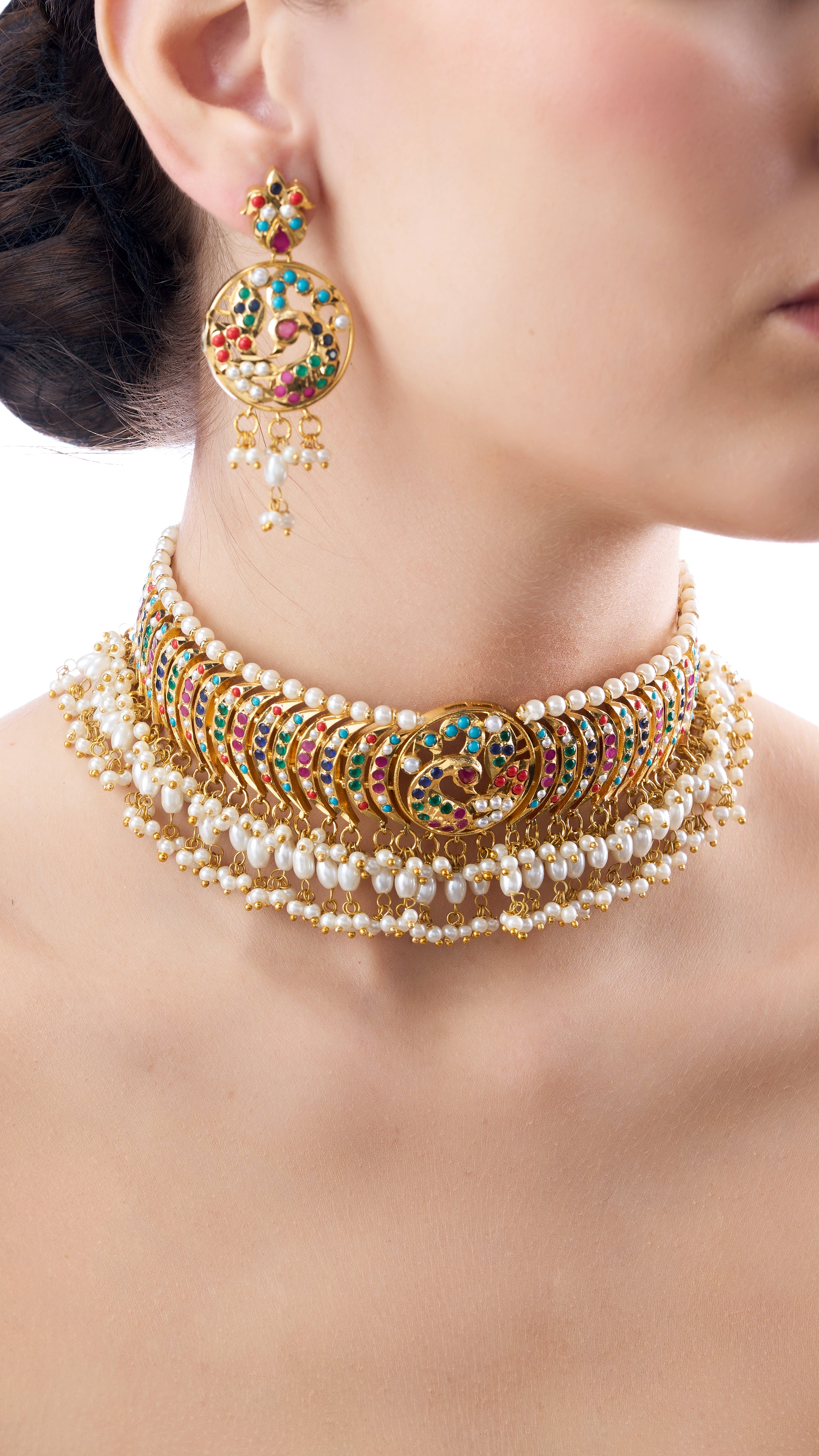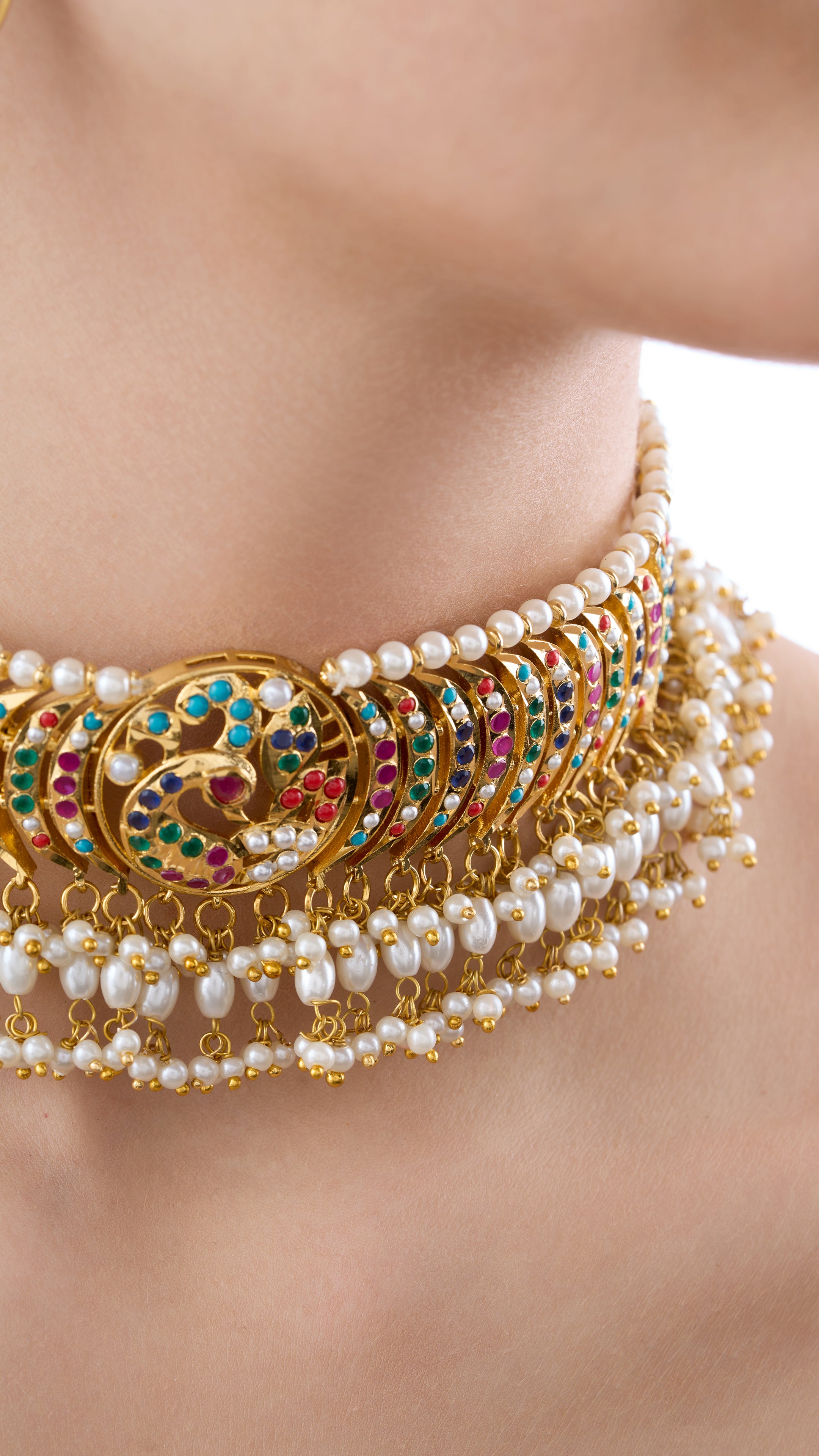 Pranjali handcrafted jadau gold foil choker necklace set in multi colour with pure pearls