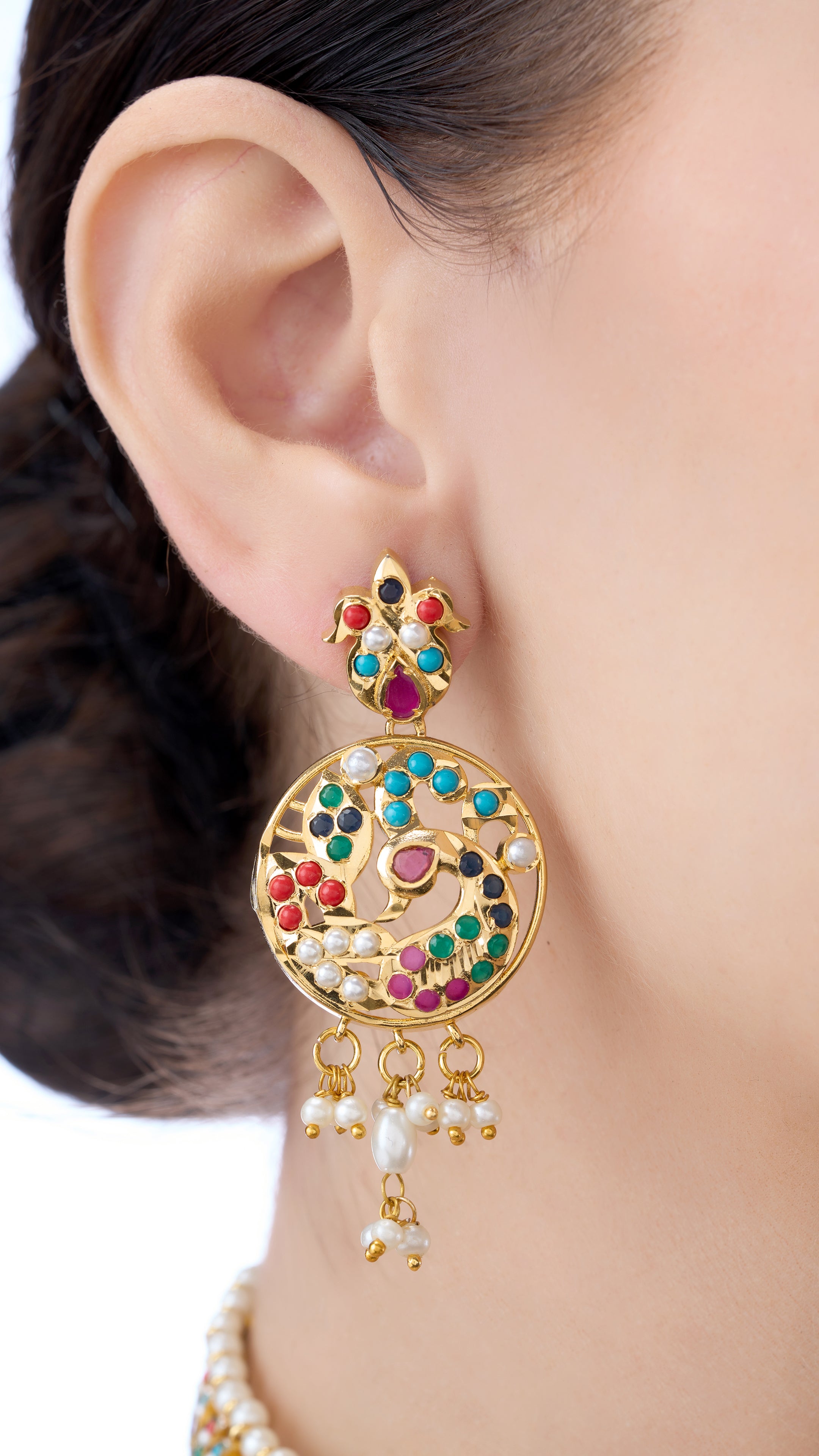 Handcrafted Jadau gold foil choker necklace set features multi-colored stones and pure pearls, blending traditional artistry with vibrant hues. A stunning piece that adds elegance and color to any festive occasion.