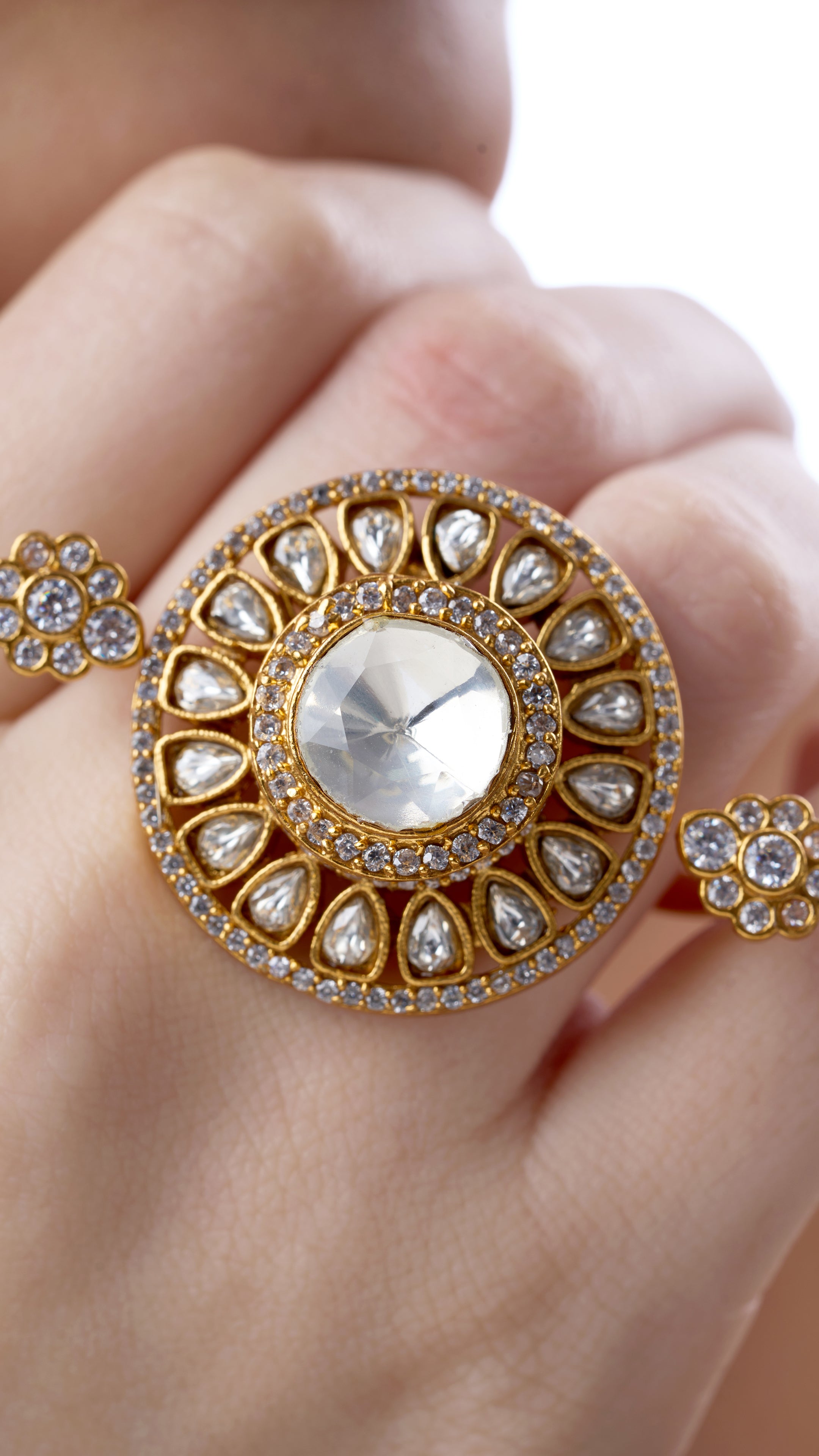Abstract gold foil Kundan ring showcases a fusion of modern design and traditional artistry. The intricate Kundan detailing and rich gold finish make it a bold, elegant statement piece.