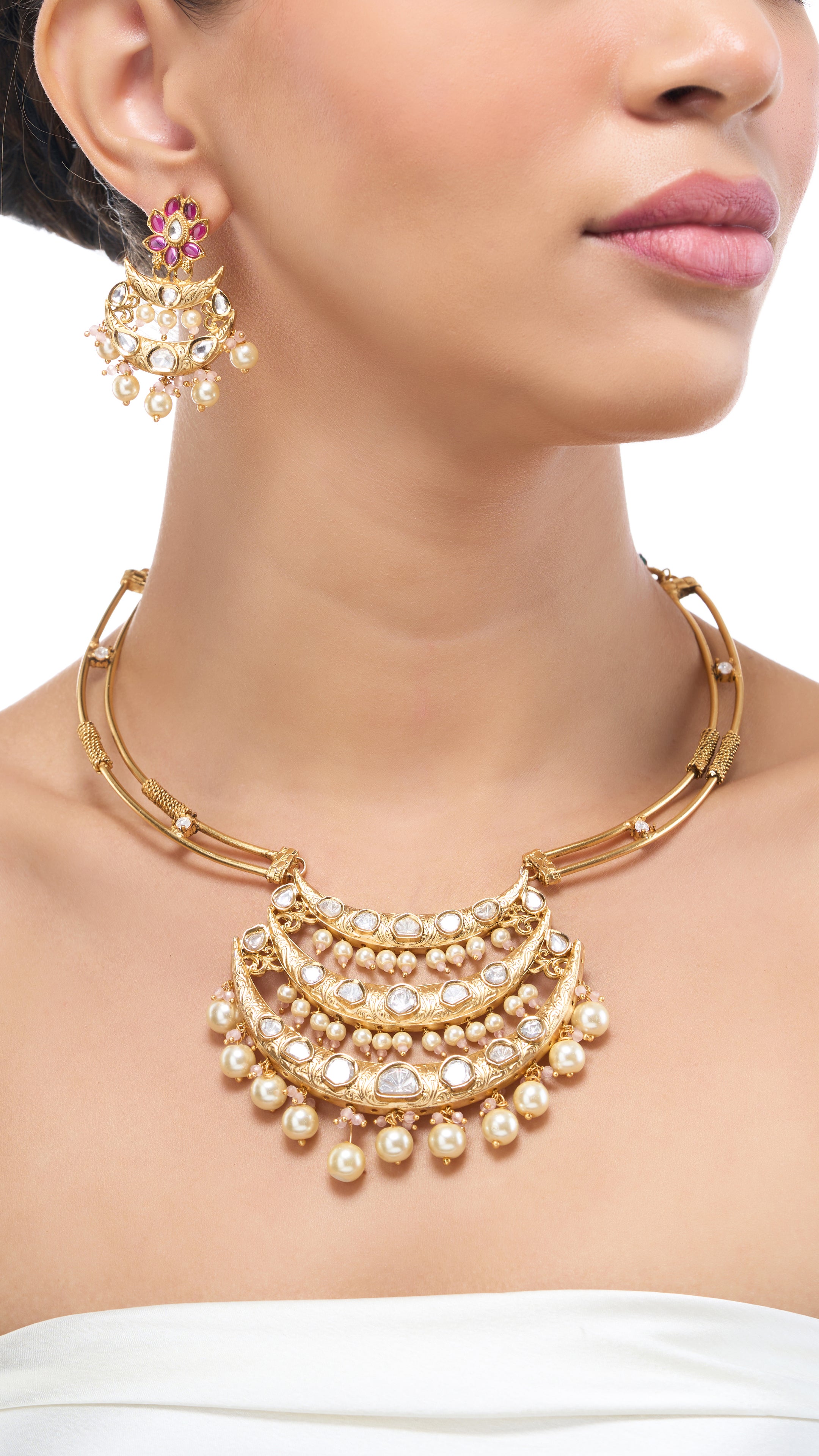 Luxurious gold foil Kundan necklace embellished with pure pearls, offering a classic and opulent touch to any ensemble.