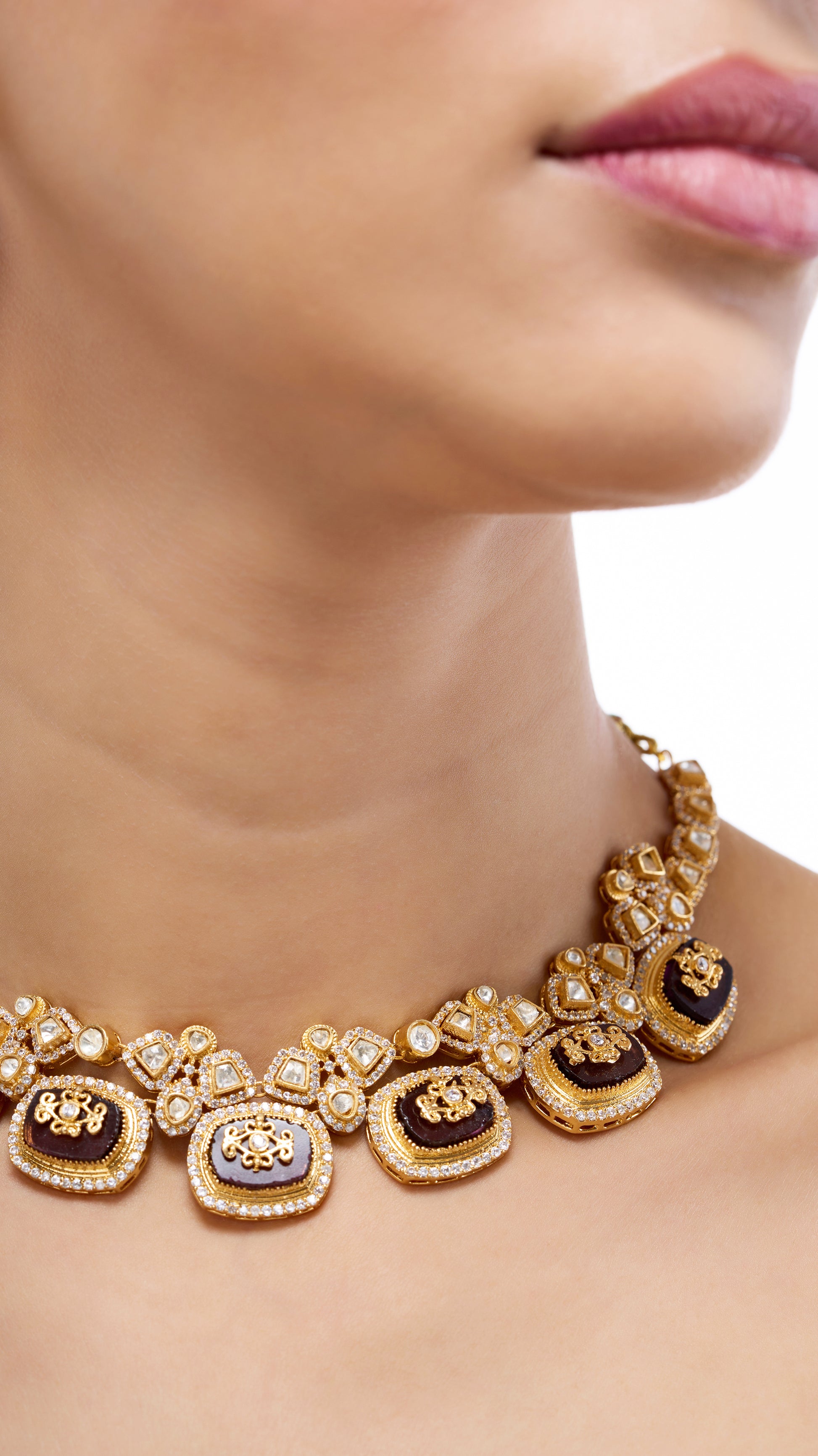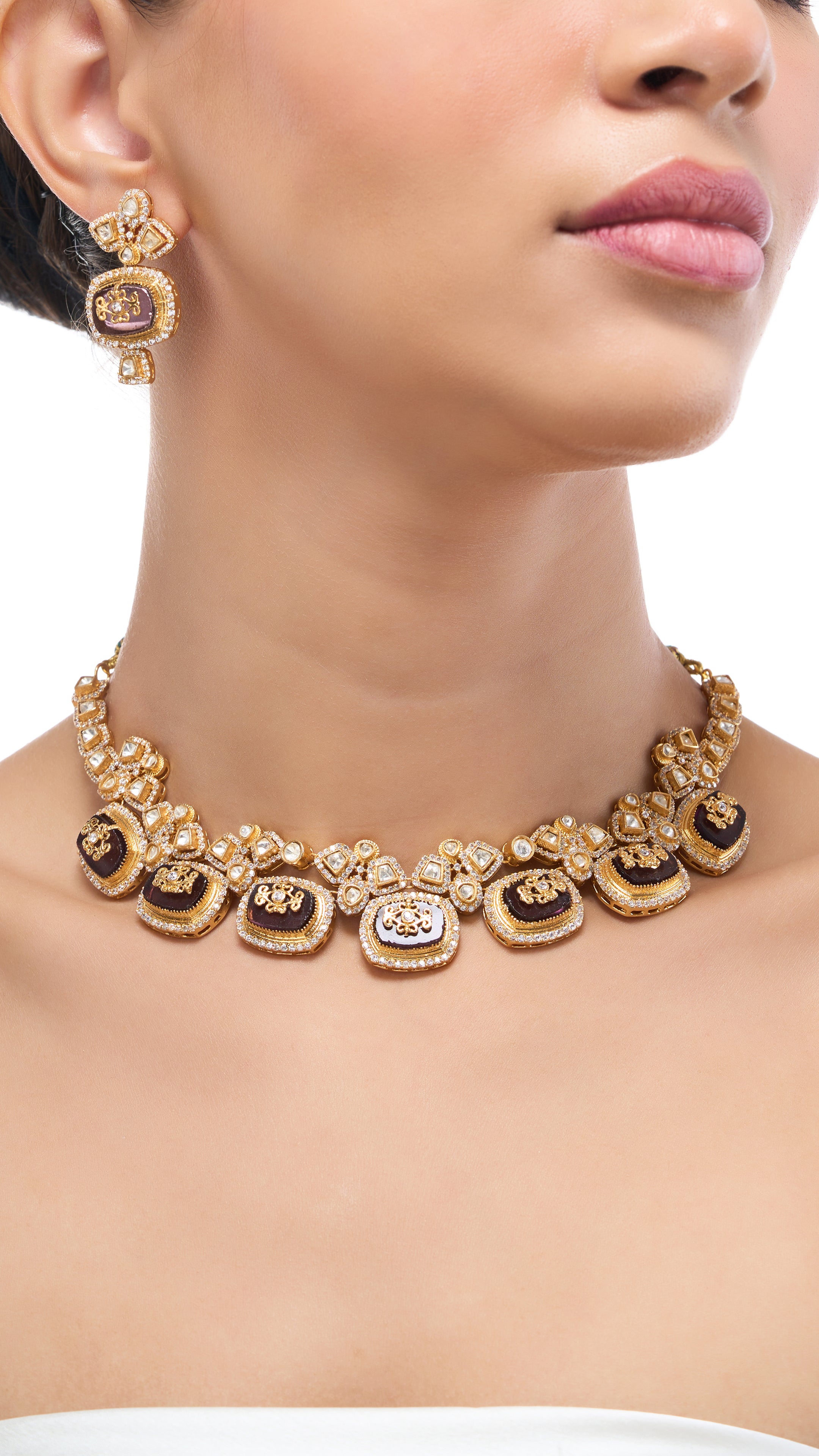Elegant Kundan gold foil choker with intricate filigree work and pure green stones, offering a timeless and sophisticated accessory.